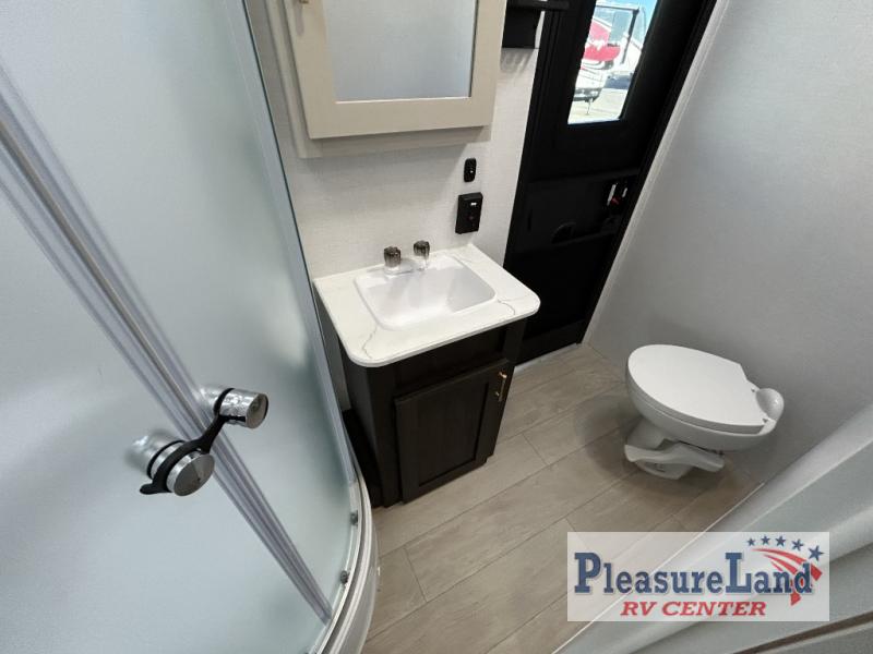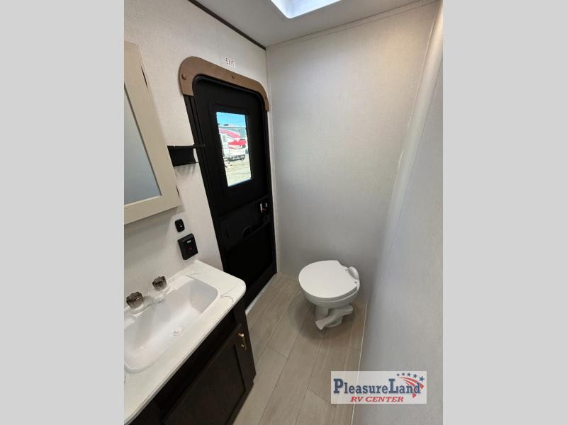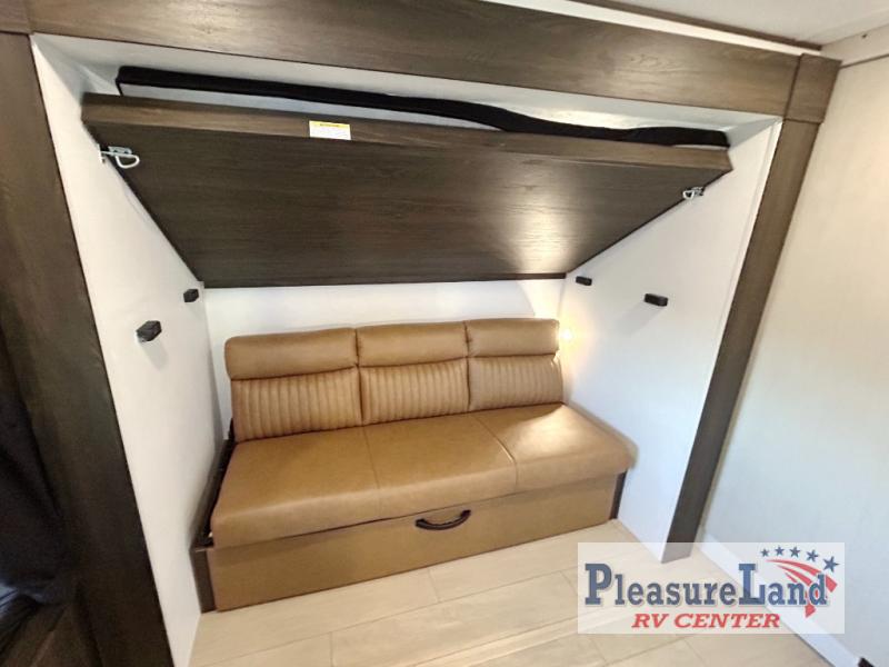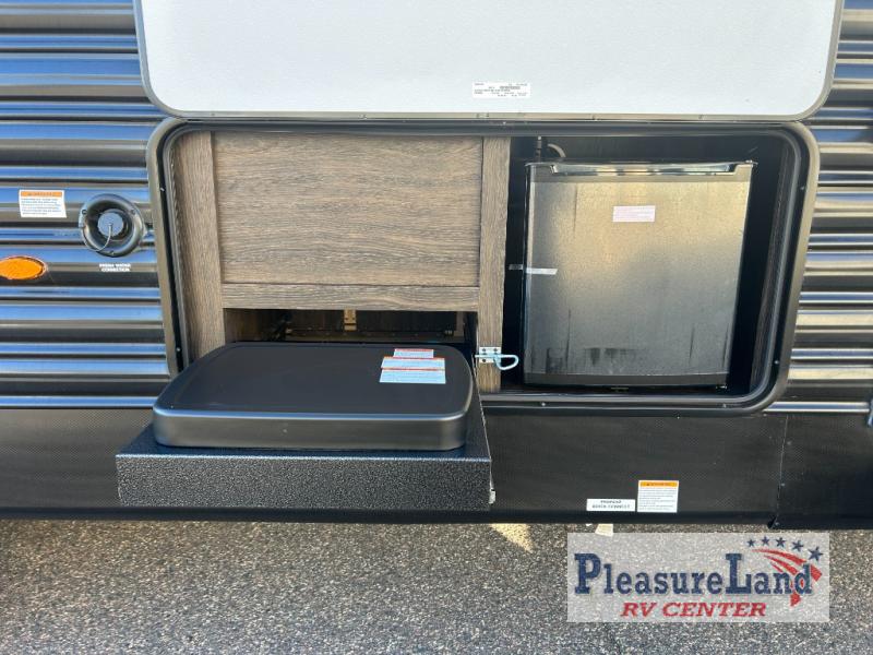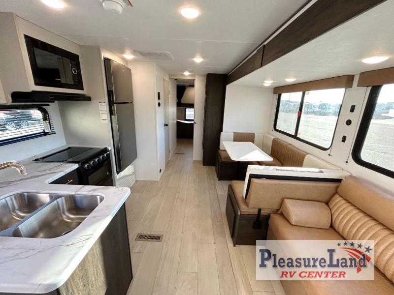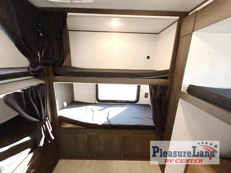 With dual entry doors, you will experience a smooth flow of traffic in and out of this travel trailer! The rear private bunkhouse includes two sets of bunk beds plus a fifth bunk over a jack knife sofa, so your kids can invite a few friends to come along. Across from the full bathroom is a linen closet to keep your towels close by and a U-shaped dinette to enjoy your meals at, play games, and even transform into an extra sleeping space. At night you can either relax on the 60" jackknife sofa by the fireplace or head to the front private bedroom and lie down on the 60" x 74" RV queen bed with closets on either side to keep your clothes looking their best!