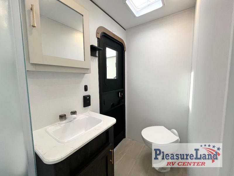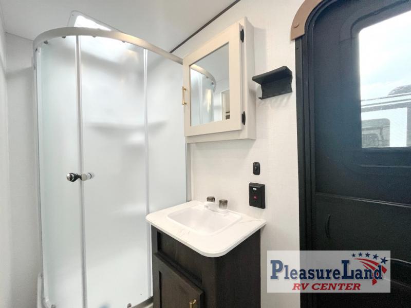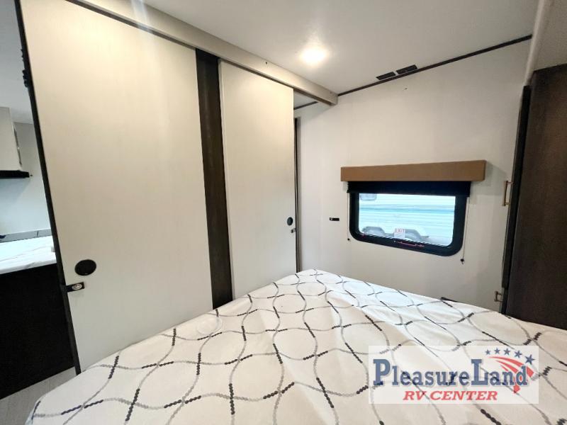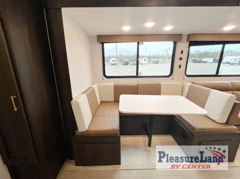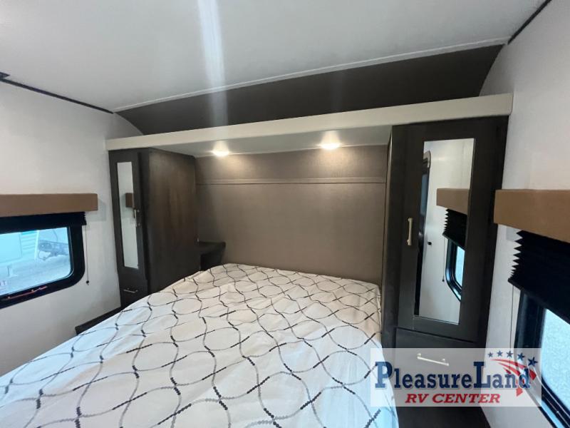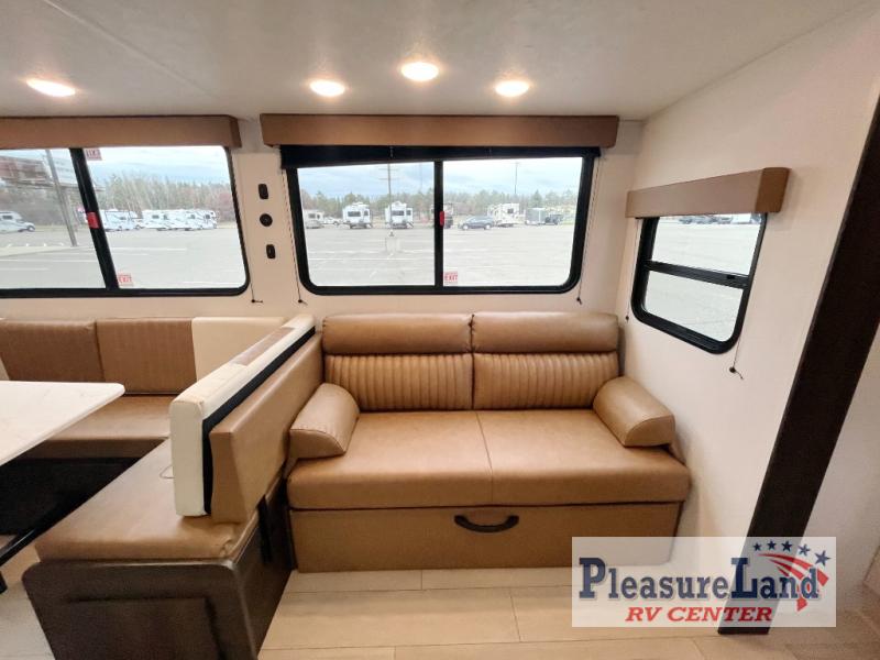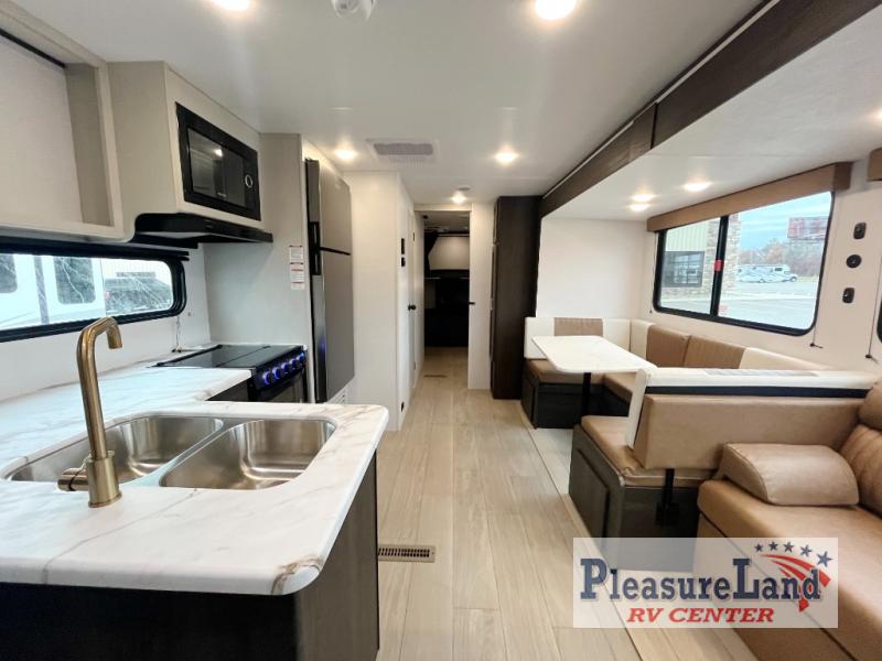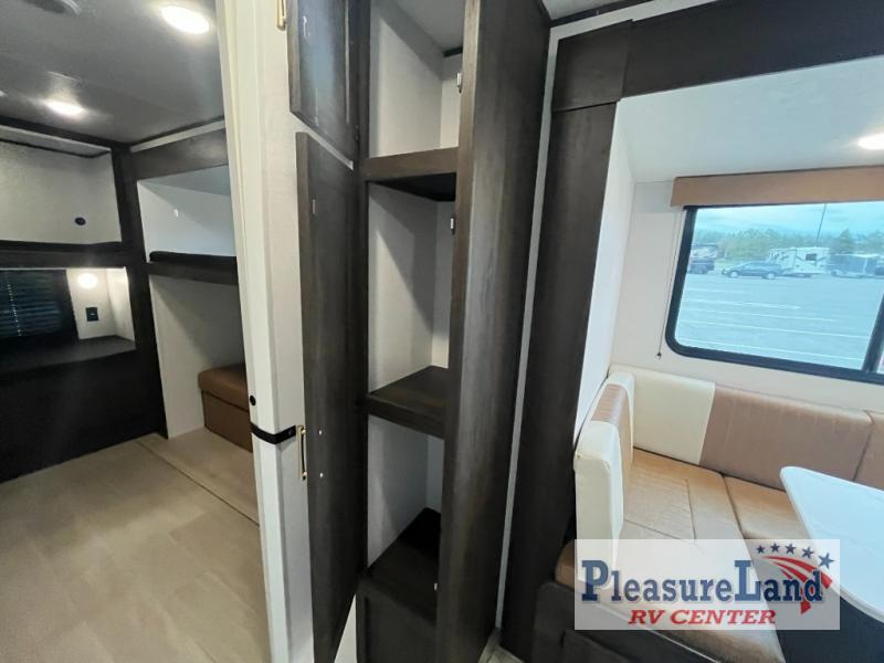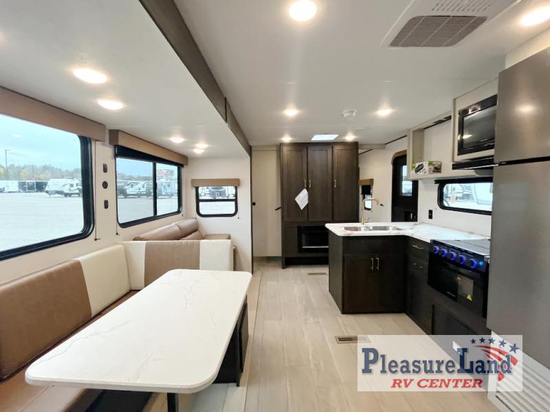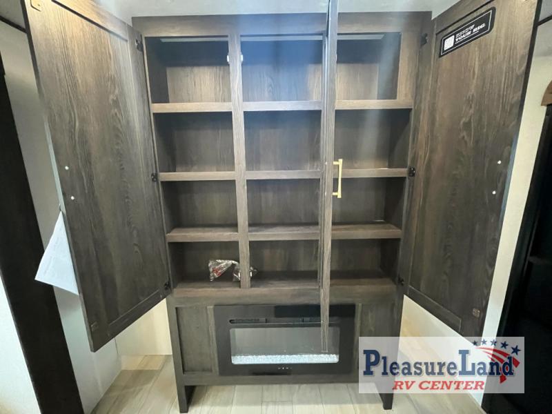 With dual entry doors, you will experience a smooth flow of traffic in and out of this travel trailer! The rear private bunkhouse includes two sets of bunk beds plus a fifth bunk over a jack knife sofa, so your kids can invite a few friends to come along. Across from the full bathroom is a linen closet to keep your towels close by and a U-shaped dinette to enjoy your meals at, play games, and even transform into an extra sleeping space. At night you can either relax on the 60" jackknife sofa by the fireplace or head to the front private bedroom and lie down on the 60" x 74" RV queen bed with closets on either side to keep your clothes looking their best!