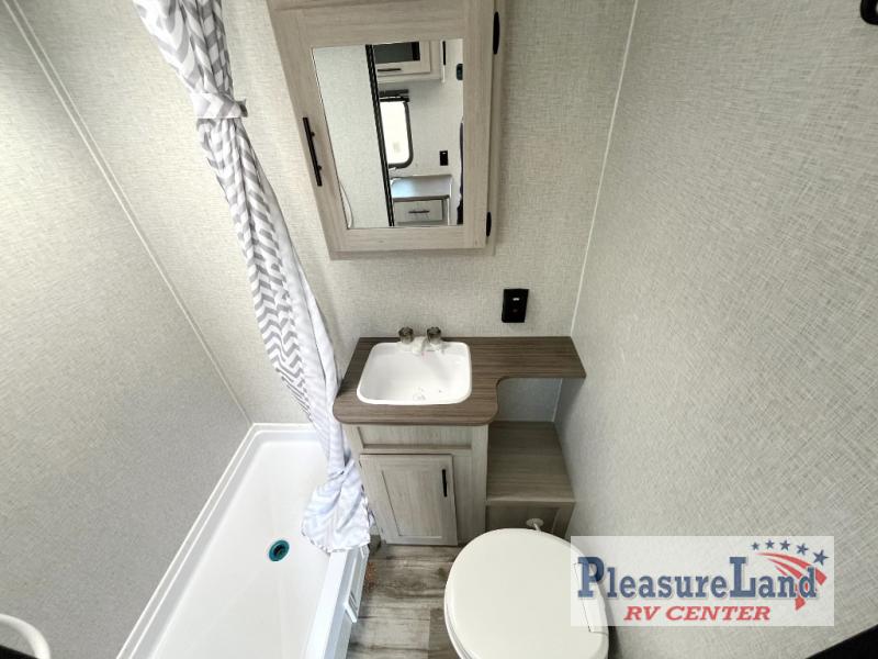 This is the perfect travel trailer to bring along guests or little ones since there are bunk beds in the back, along with a third bunk above a jackknife sofa. There is also a fold-up table by the sofa where you can dine at each day. This Zinger Lite kitchen includes a microwave oven, cooktop, and a 12V refrigerator for perishables. When you're ready for some shut-eye, the RV queen bed up front will provide a great night's rest, and there is bedroom overhead storage for your belongings.