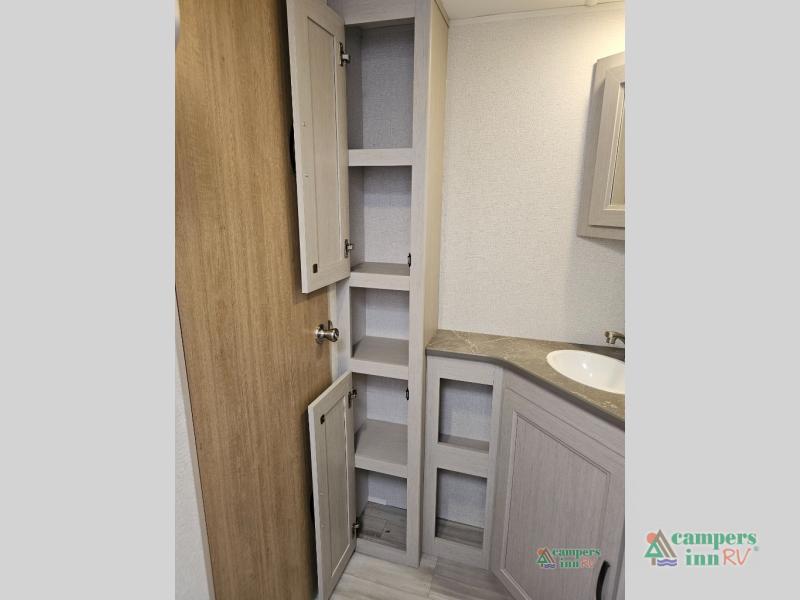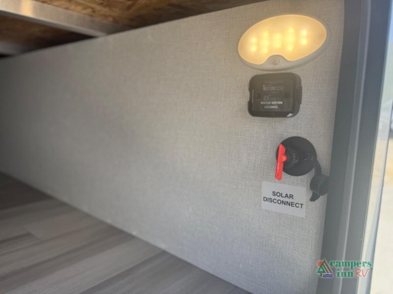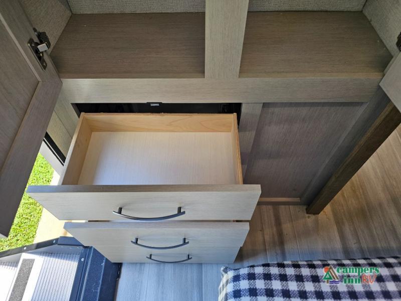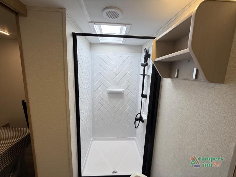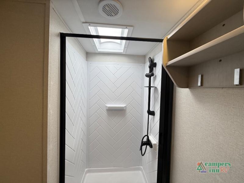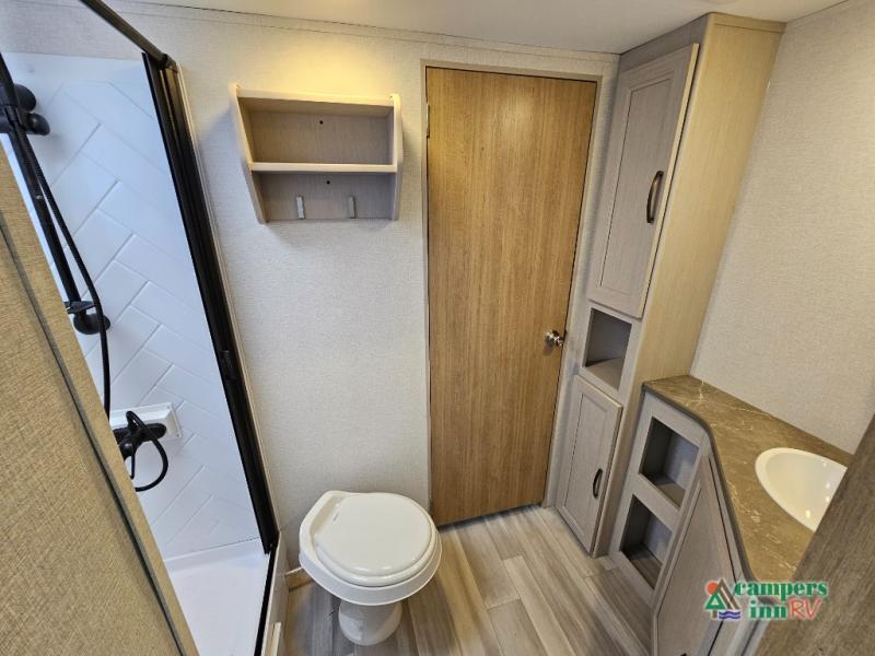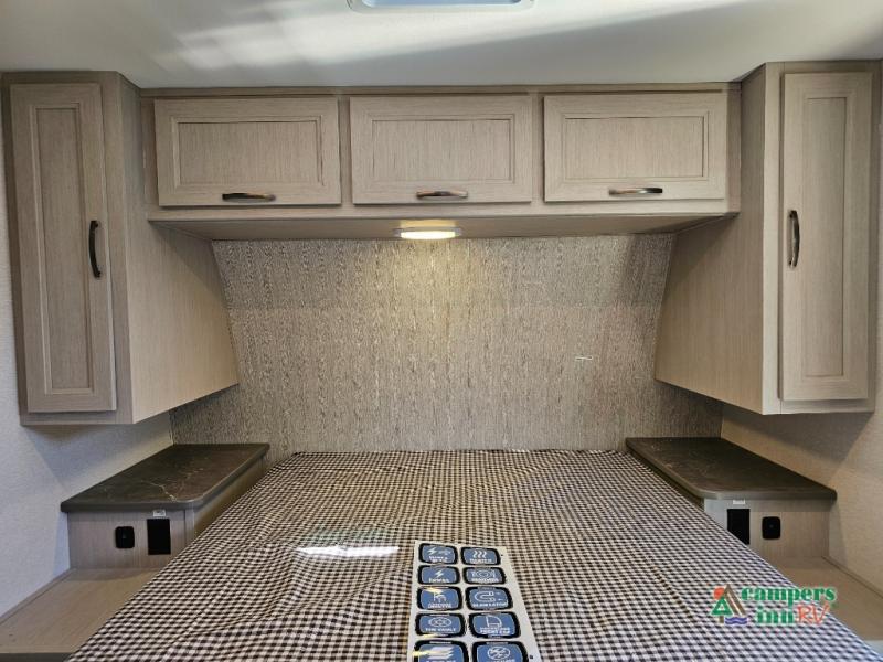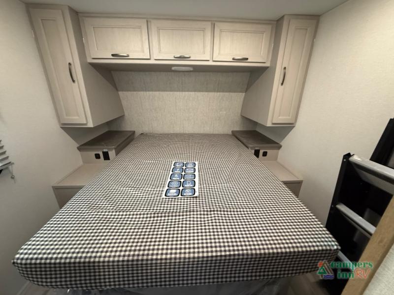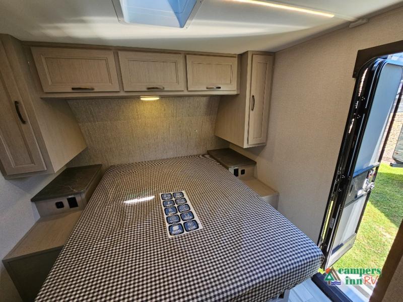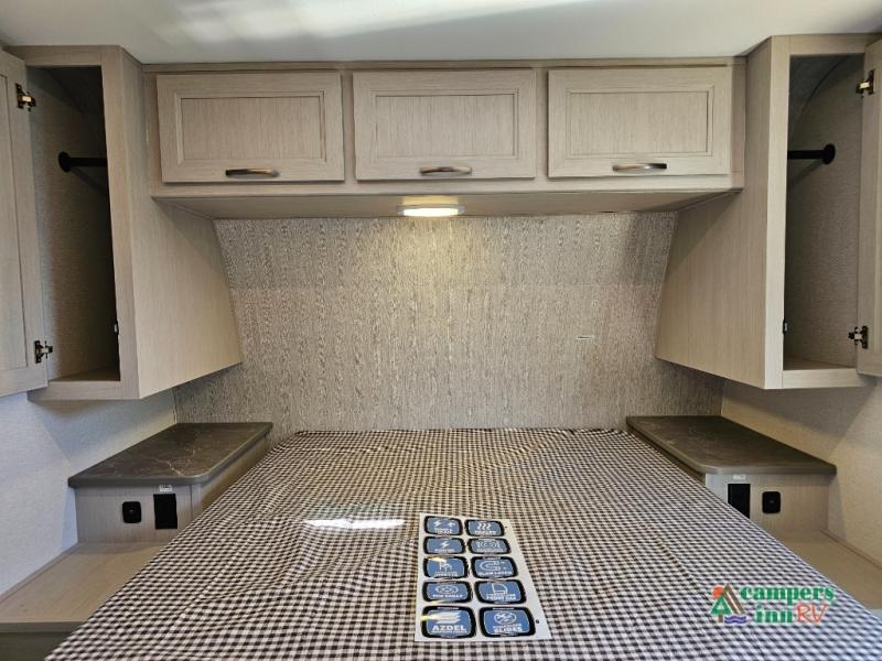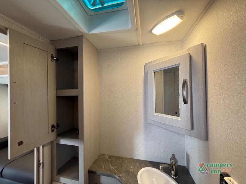 The front of the Embrace EL25RK houses a comfortable bedroom with a queen-sized bed and additional storage, ensuring a restful night’s sleep. The bathroom is compact yet functional, with modern amenities to ensure convenience on the road. Its thoughtfully designed layout maximizes space, making it a great option for those who enjoy extended trips or weekend getaways.