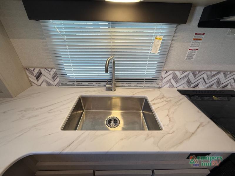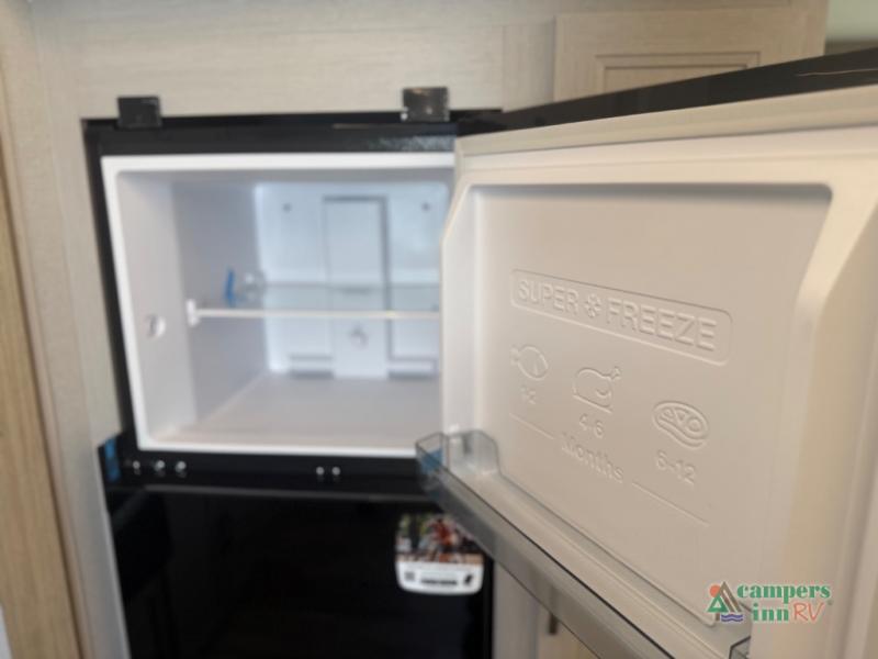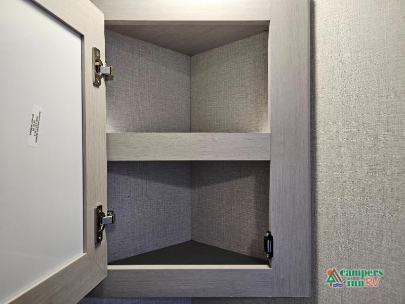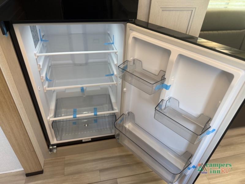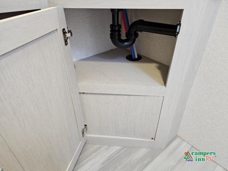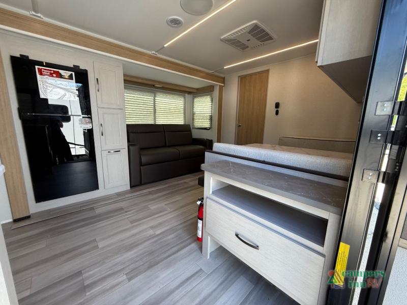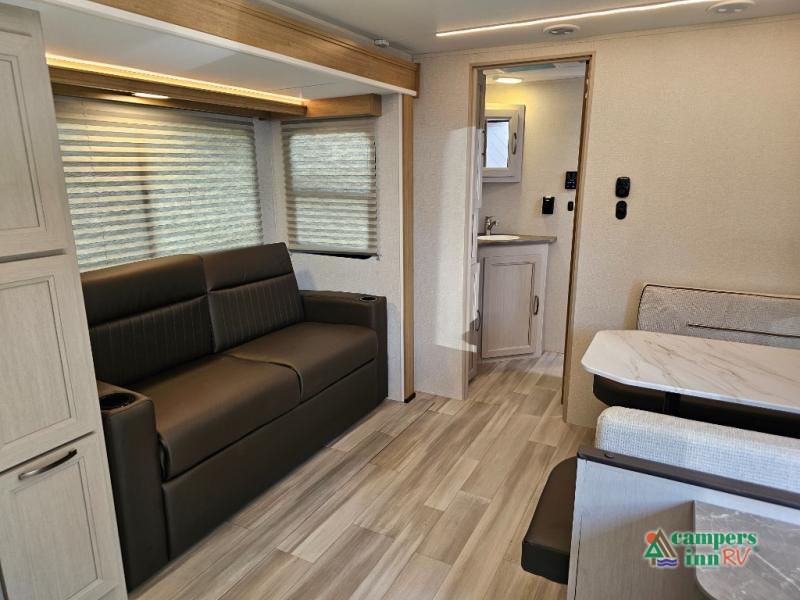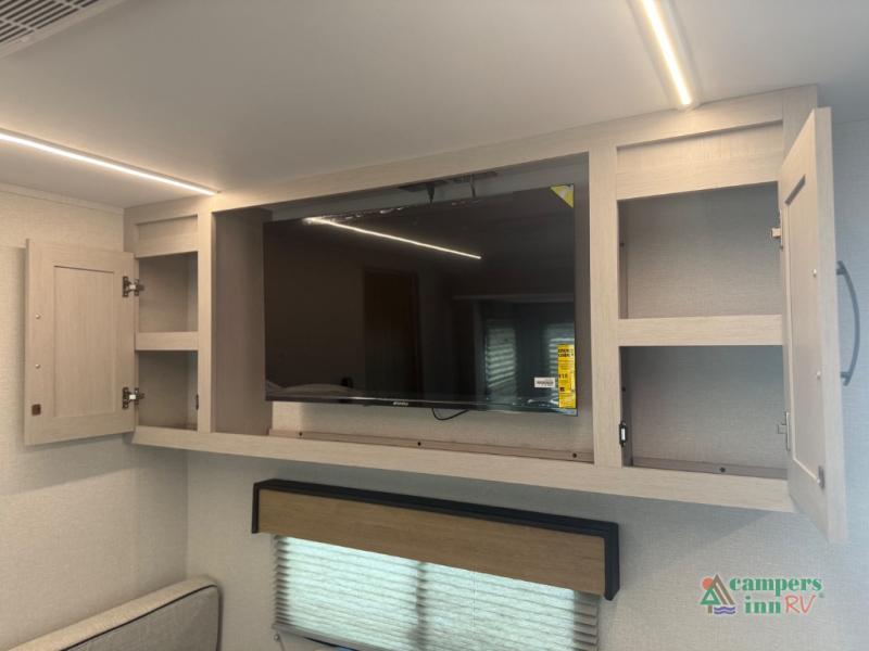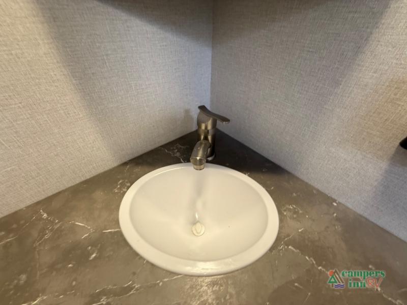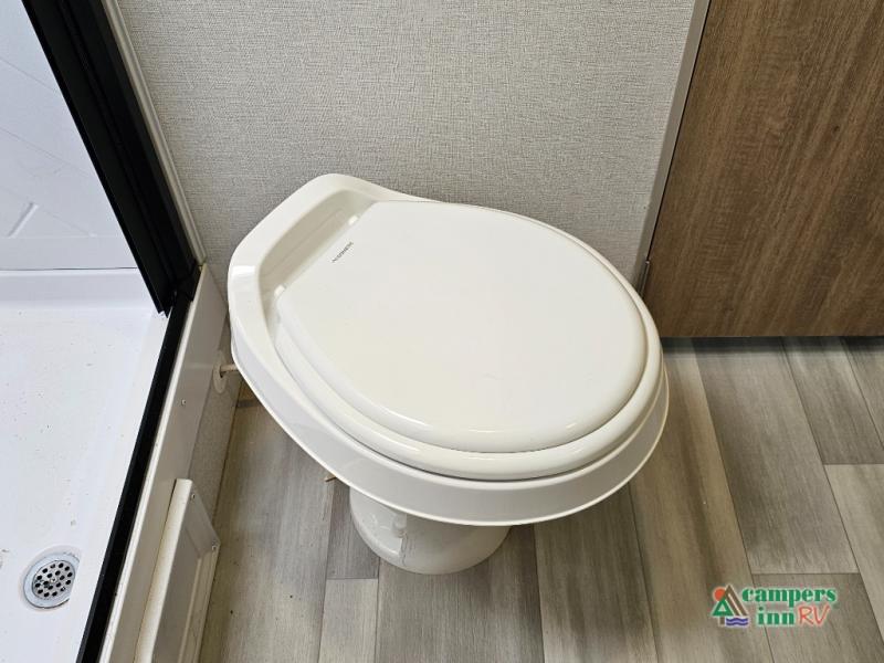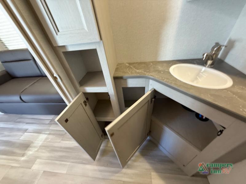 The front of the Embrace EL25RK houses a comfortable bedroom with a queen-sized bed and additional storage, ensuring a restful night’s sleep. The bathroom is compact yet functional, with modern amenities to ensure convenience on the road. Its thoughtfully designed layout maximizes space, making it a great option for those who enjoy extended trips or weekend getaways.