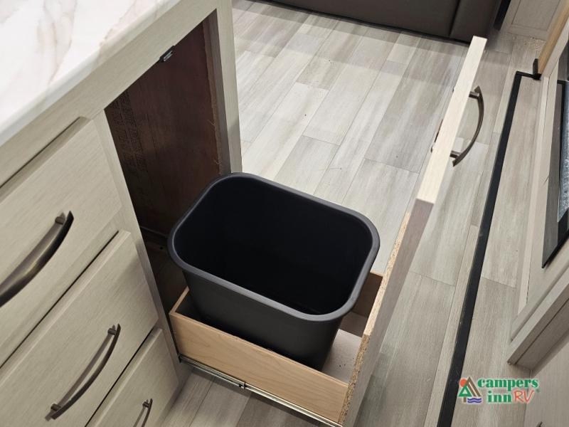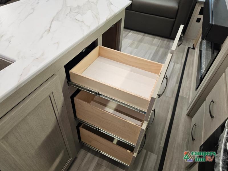 The fully-equipped kitchen in the Embrace EL30RL is designed to make cooking on the road a breeze. With modern appliances like a large refrigerator, stove, oven, microwave, and ample countertop space, you can easily prepare your favorite meals. The kitchen also offers abundant storage options for all your cooking essentials.