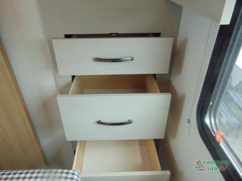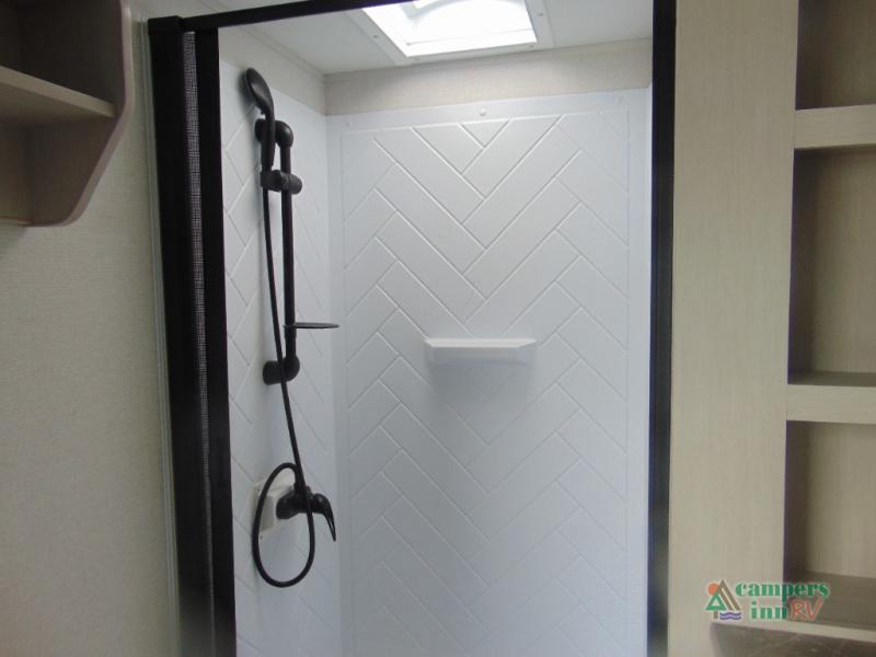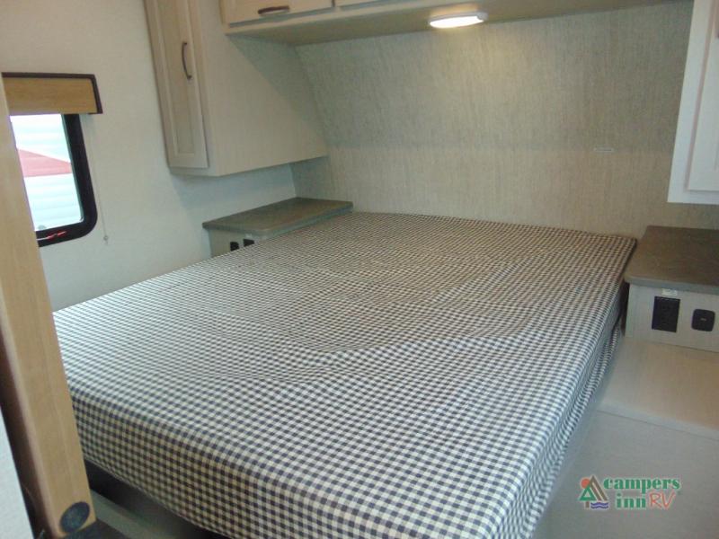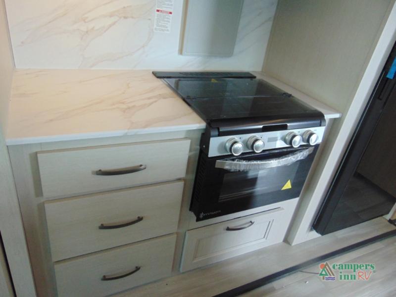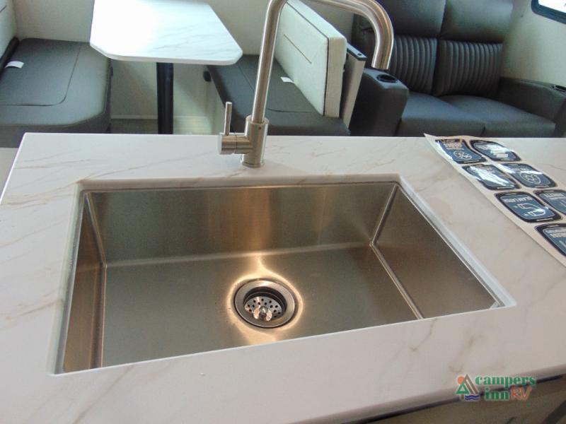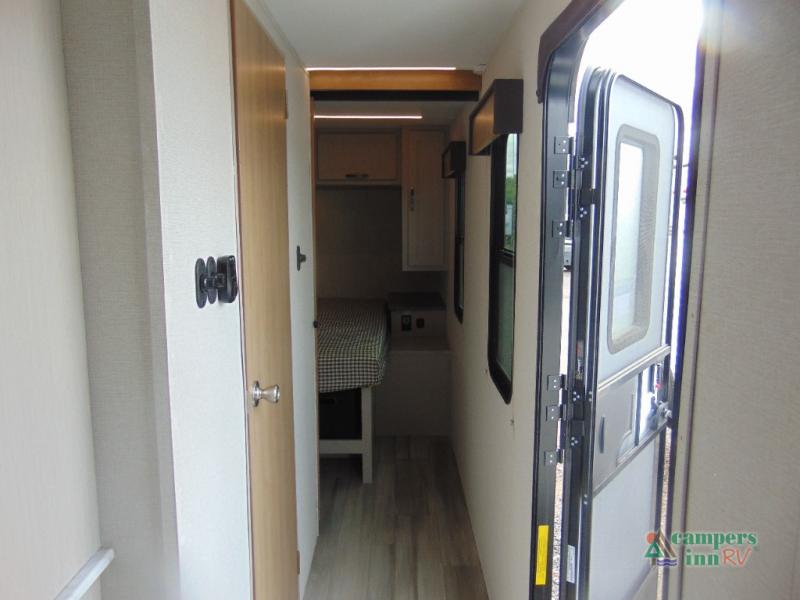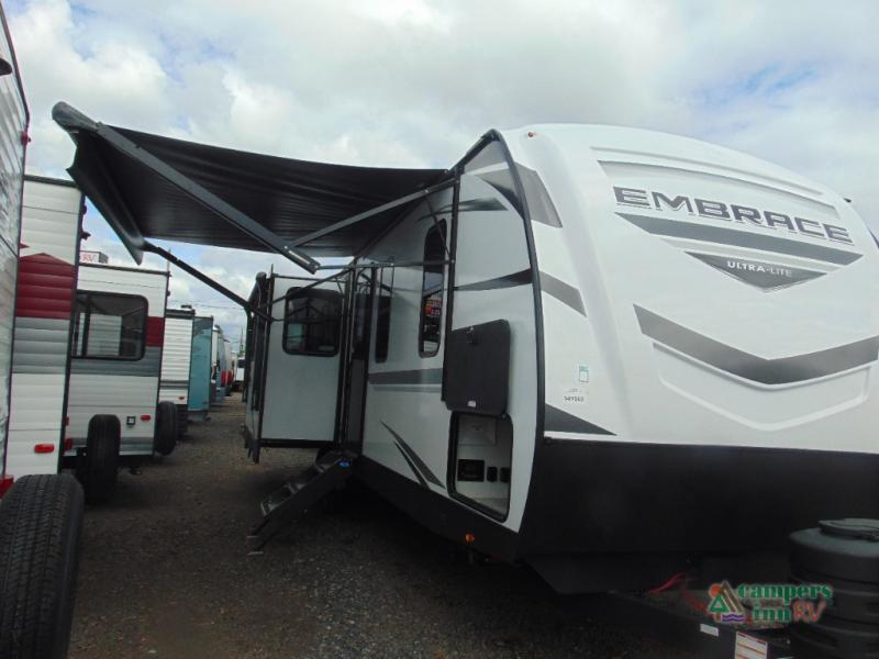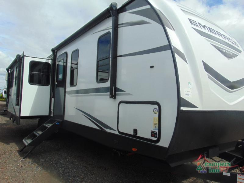 With any Embrace travel trailer by Cruiser you will find Azdel composite laminated walls, and a high gloss fiberglass front cap with LED lighting for a sleek look. There are seamless kitchen countertops and plywood flooring that will be easy to clean, plus residential hardwood cabinets with hidden hinges for a more at-home feel. The slam latch baggage doors with magnetic latches will make loading up easier than ever, plus the pass-through storage includes LED lights you are sure to appreciate. Each model also includes multiple charging stations with 12v and USB ports, a four speaker soundbar system to listen to your playlists, and a dual ducted A/C to keep you cool during those hot summer months!