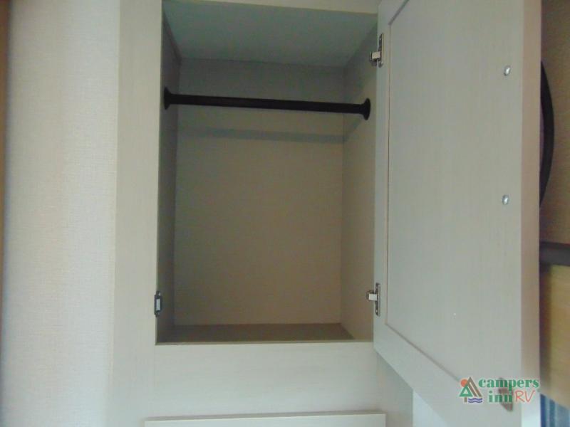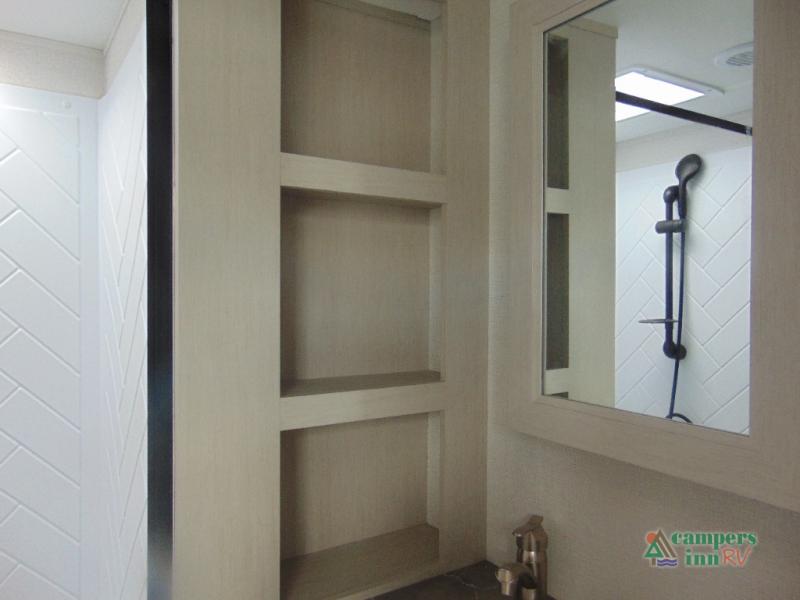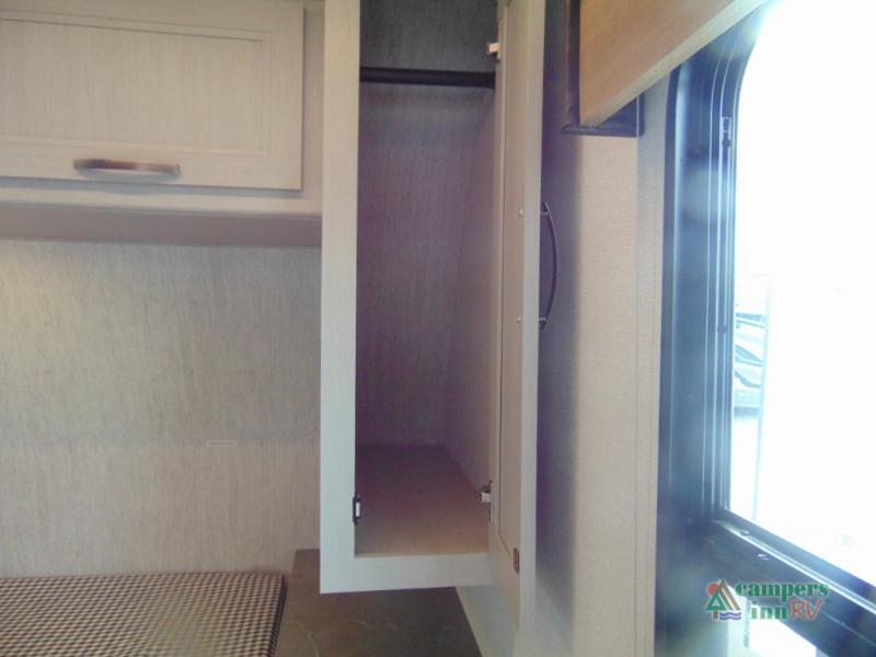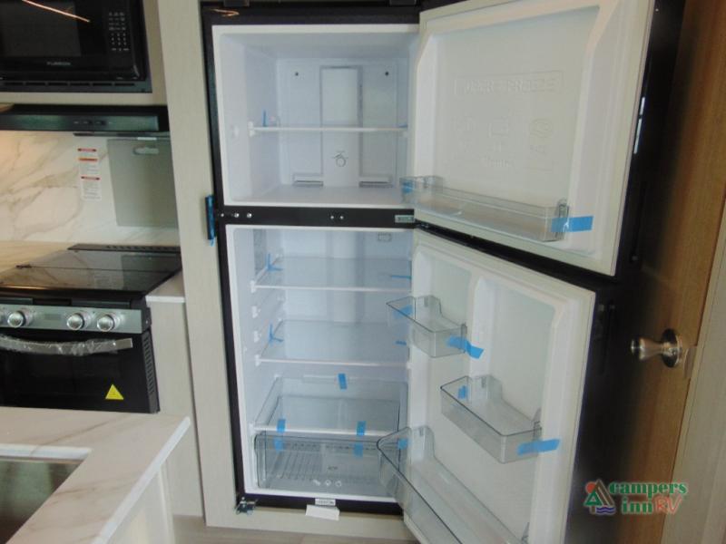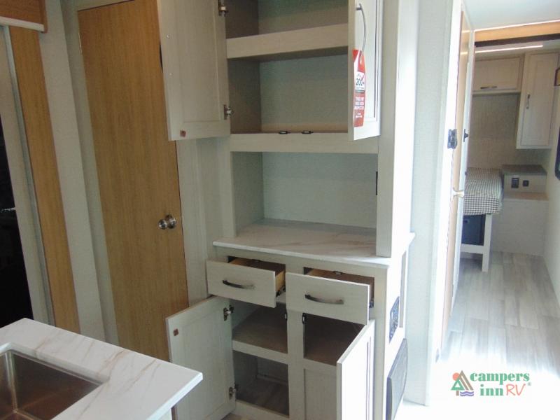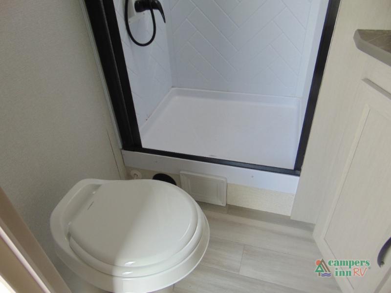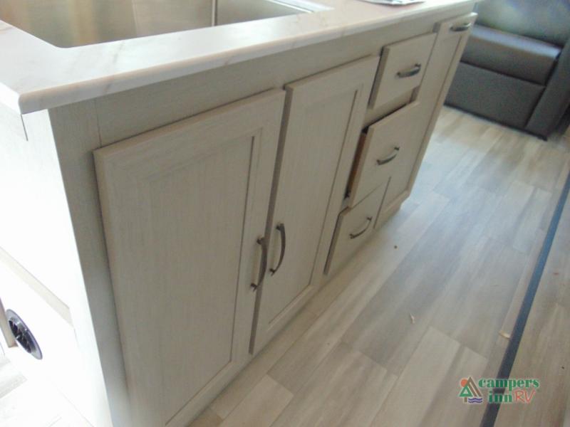 You'll love every minute spent in this spacious travel trailer that can sleep four to five each night. The rear living area will be a favorite place to visit together since there are dual opposing slides, a rear Trifold sofa, a booth dinette, plus a 60" theatre seat across from the entertainment center. A kitchen island in the middle will provide more counter space, and the large pantry can keep all the dry goods and snacks organized. After you've spent your day outdoors, the full bath with a spacious shower, plenty of counter space, and a linen closet will let you freshen up before turning in for the night. Speaking of nighttime, the front private bedroom will provide a great night's rest on the queen-size bed, and there is storage space in the dual wardrobes plus the dresser/wardrobe!