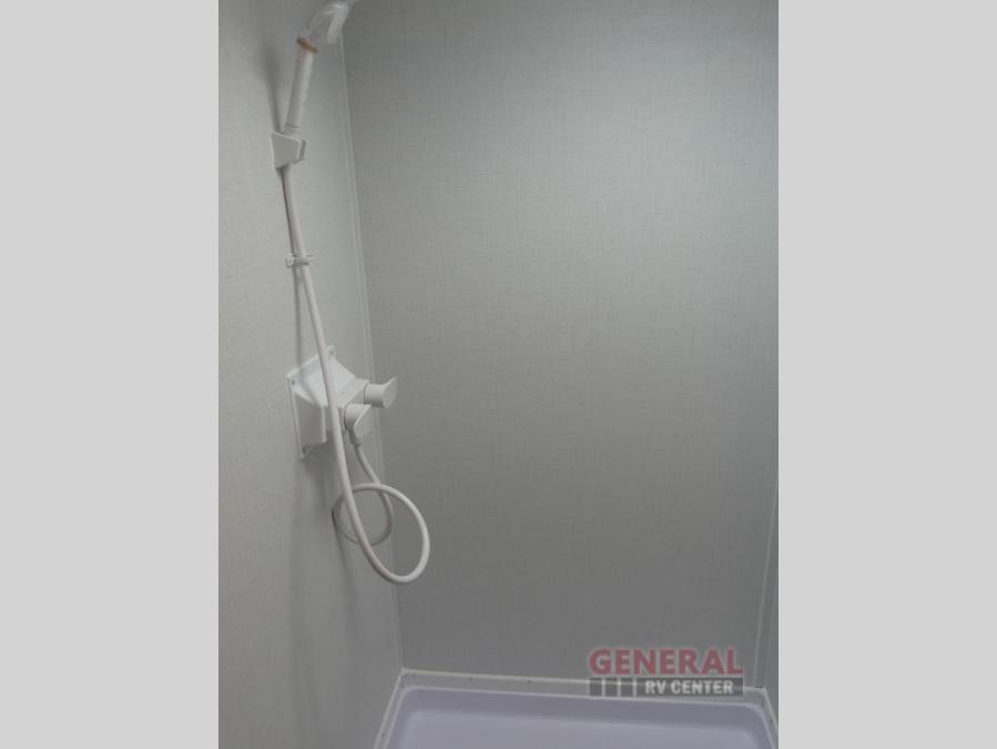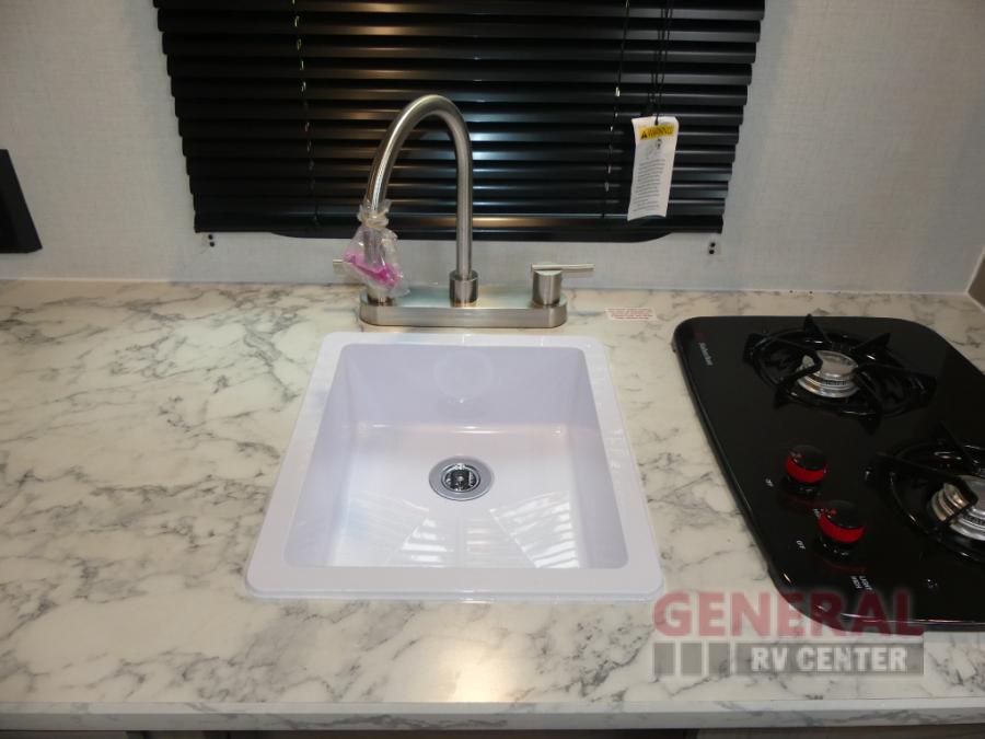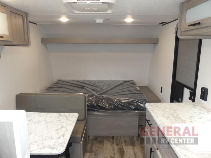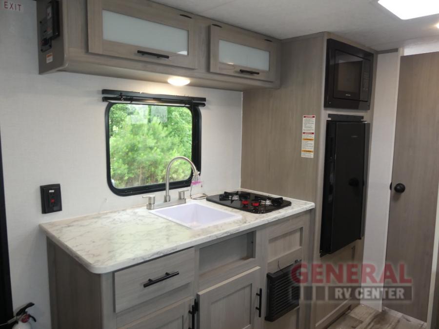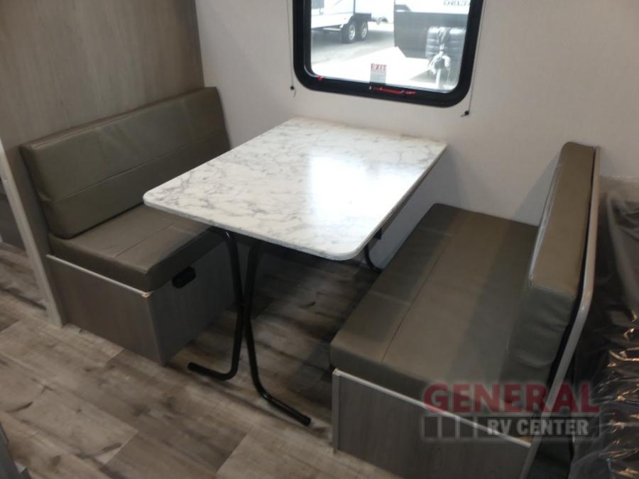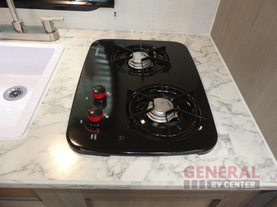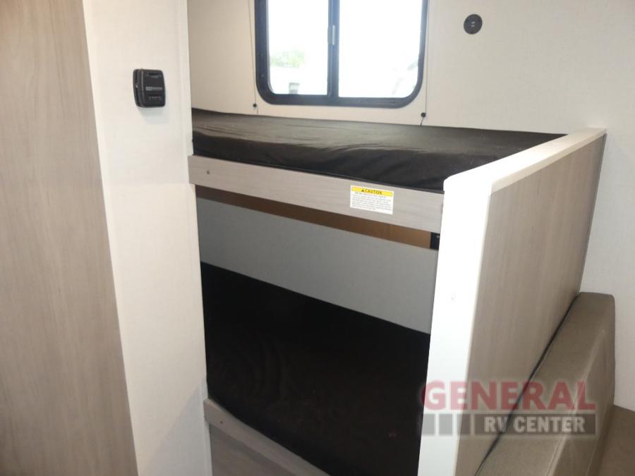 A perfect trailer for your family of three to five featuring a set of bunk beds for the kids, a queen bed up front for you, and the booth dinette that can be converted to sleep one or two more depending on size. For meals, there is a two burner cooktop and sink, plus a 3.3 cu. ft. refrigerator for your perishables. Overhead cabinetry can be found along both sides for your dishes and things. You will all appreciate the convenience of having your own private shower and toilet so that you don't need to use the campground facilities at night. If you enjoy spending time outside, an awning is available to provide even more living space outdoors!