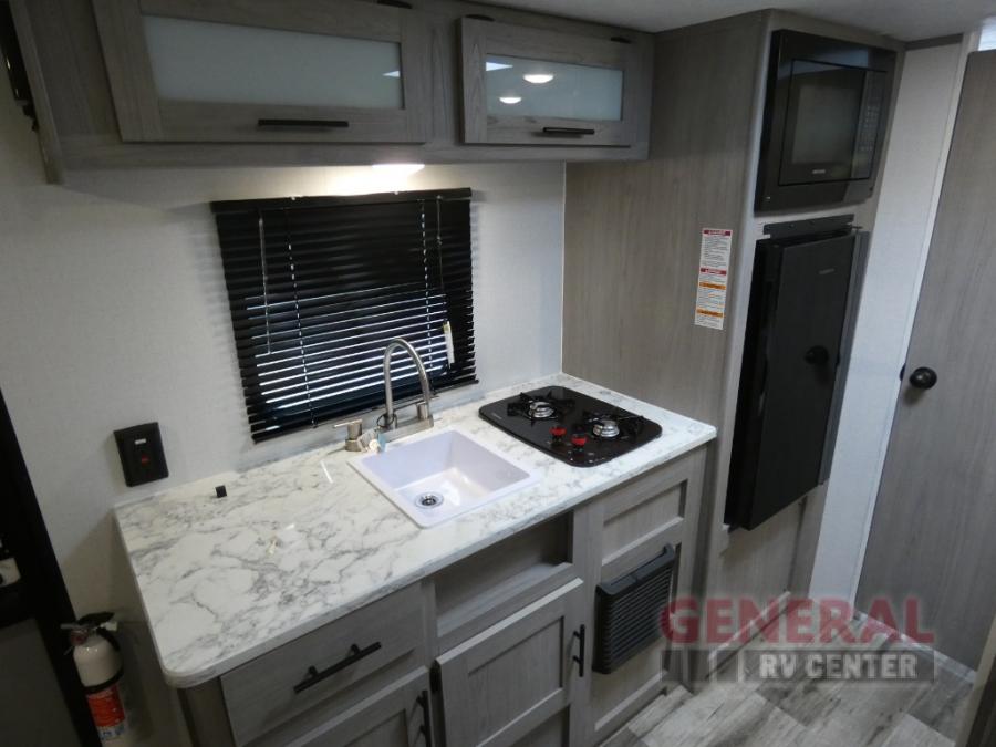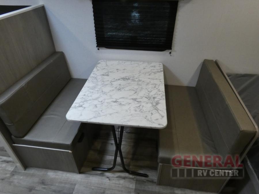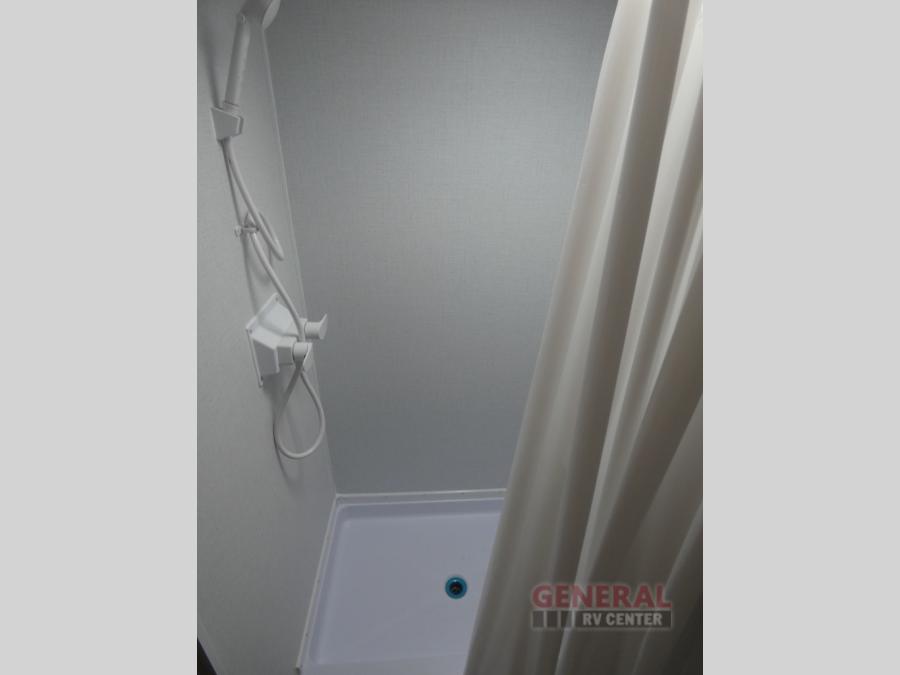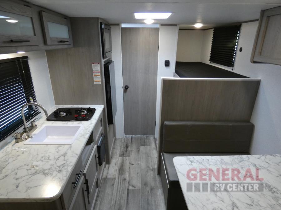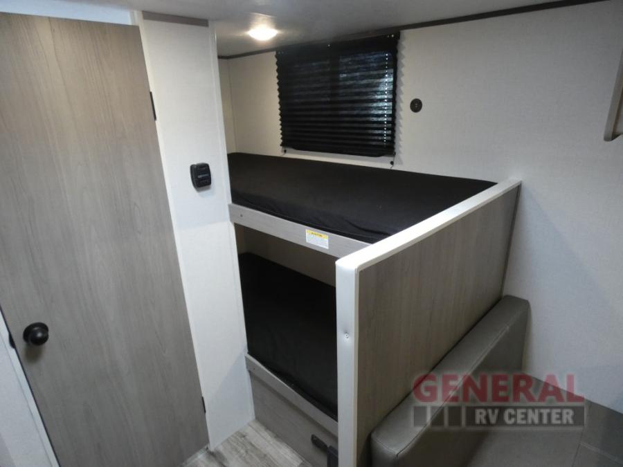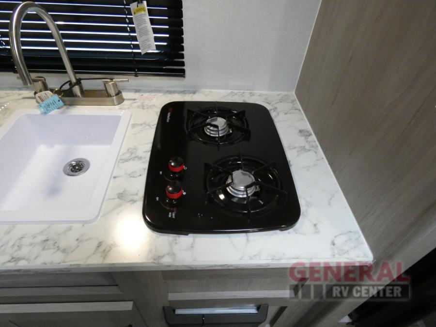 A perfect trailer for your family of three to five featuring a set of bunk beds for the kids, a queen bed up front for you, and the booth dinette that can be converted to sleep one or two more depending on size. For meals, there is a two burner cooktop and sink, plus a 3.3 cu. ft. refrigerator for your perishables. Overhead cabinetry can be found along both sides for your dishes and things. You will all appreciate the convenience of having your own private shower and toilet so that you don't need to use the campground facilities at night. If you enjoy spending time outside, an awning is available to provide even more living space outdoors!