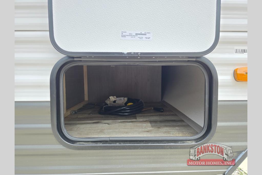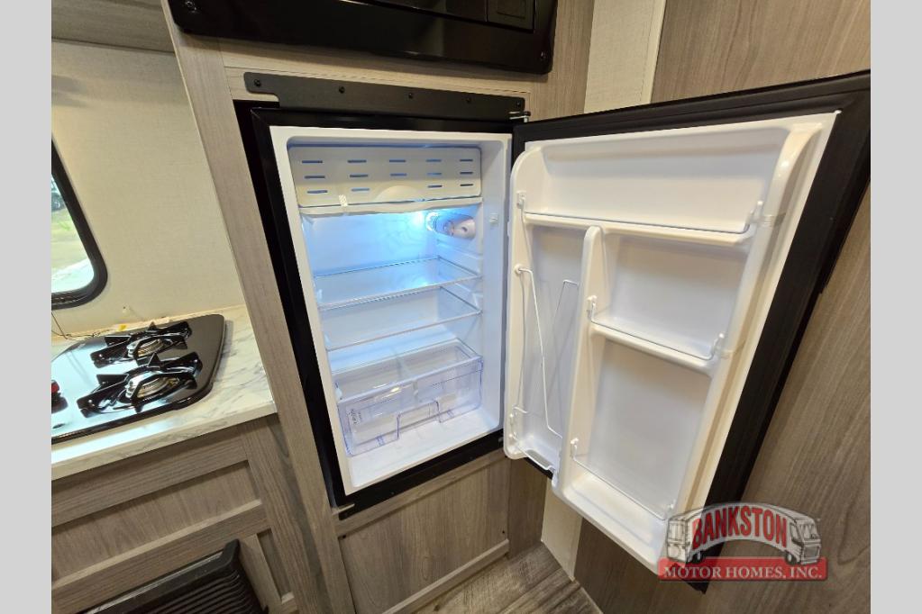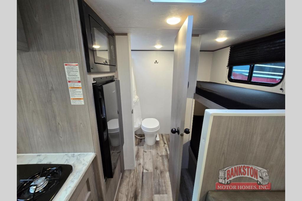 A perfect trailer for your family of three to five featuring a set of bunk beds for the kids, a queen bed up front for you, and the booth dinette that can be converted to sleep one or two more depending on size. For meals, there is a two burner cooktop and sink, plus a 3.3 cu. ft. refrigerator for your perishables. Overhead cabinetry can be found along both sides for your dishes and things. You will all appreciate the convenience of having your own private shower and toilet so that you don't need to use the campground facilities at night. If you enjoy spending time outside, an awning is available to provide even more living space outdoors!