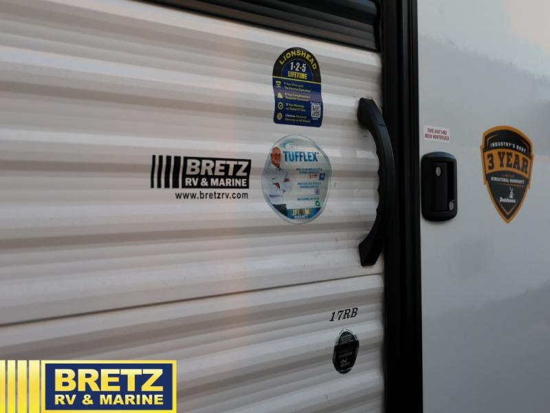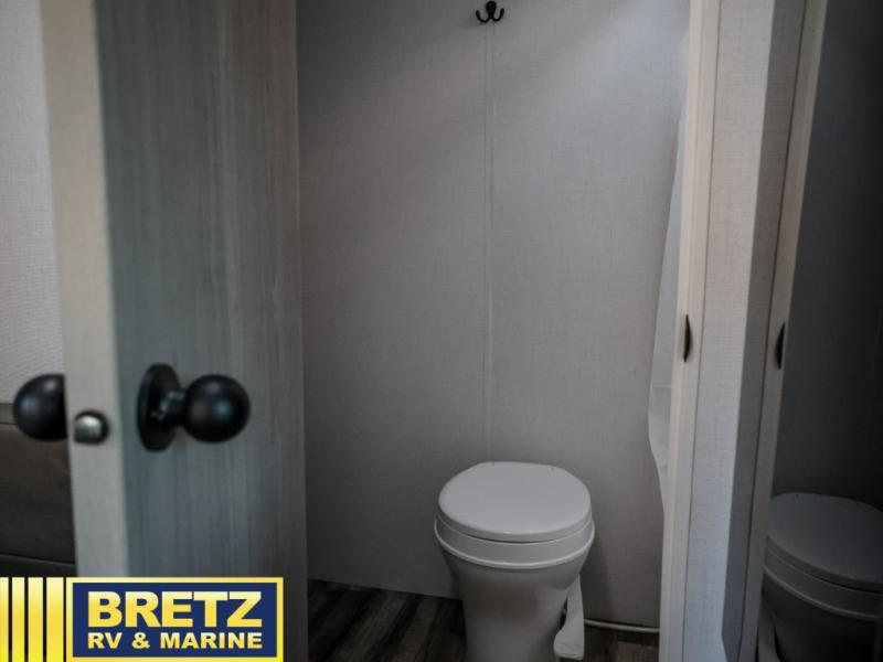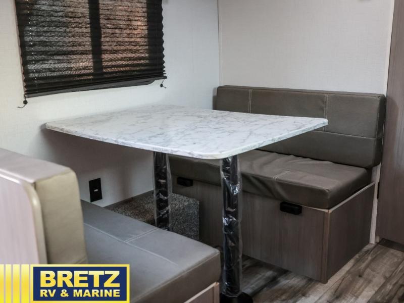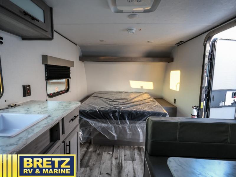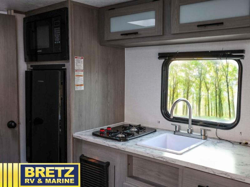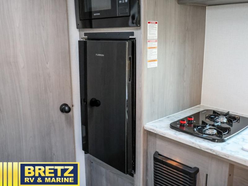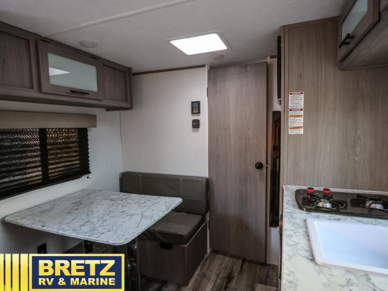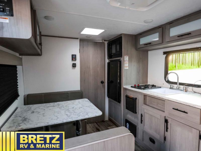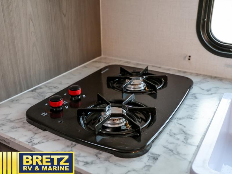 A perfect couples coach that could sleep one or two more, depending on size, using the booth dinette which can be converted at night This unit is cozy and convenient providing you just what you need to enjoy a little adventure away from home. For meals, there is a two burner cooktop and sink, plus a 3.3 cu. ft. refrigerator for your perishables. Overhead cabinetry can be found along both sides for your dishes and things. You will all appreciate the convenience of having your own private shower and toilet so that you don't need to use the campground facilities at night. You will also enjoy spending time outside with an 8' awning to provide even more living space outdoors!