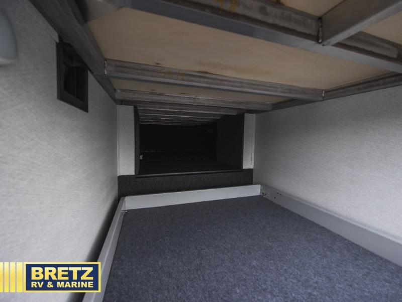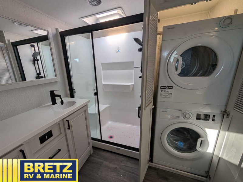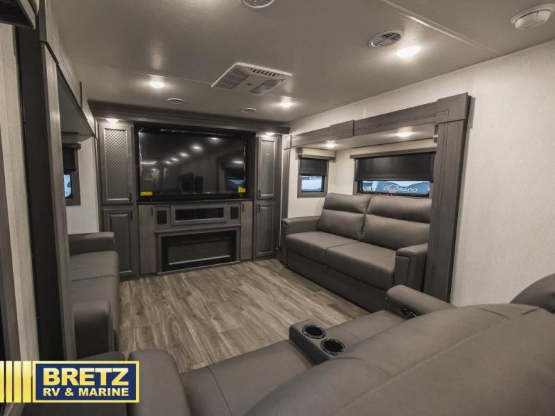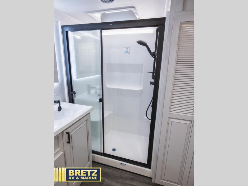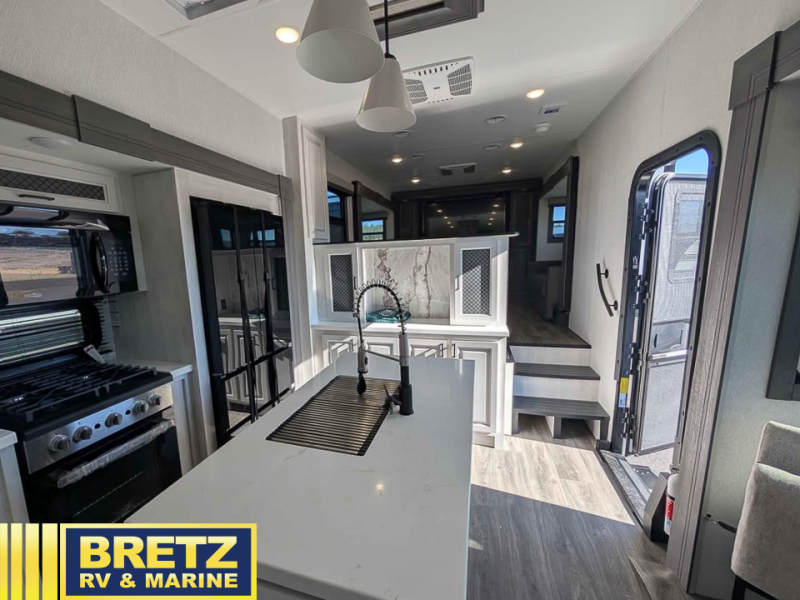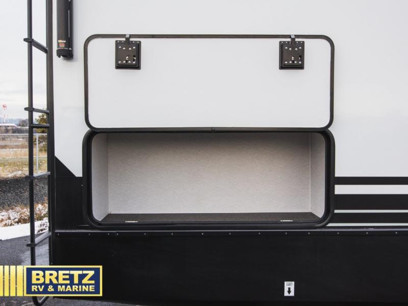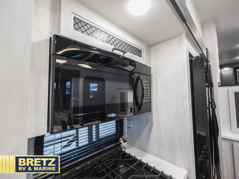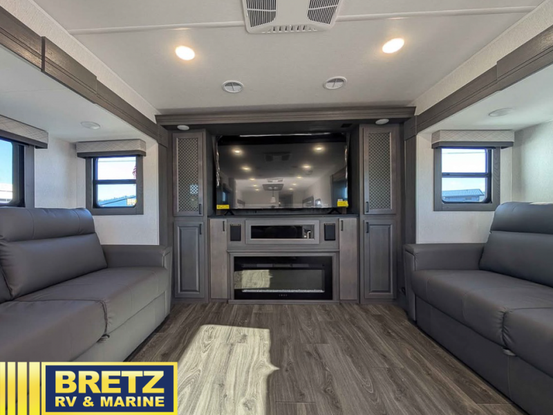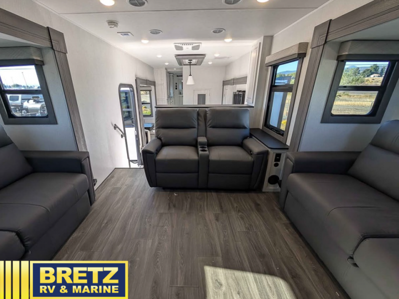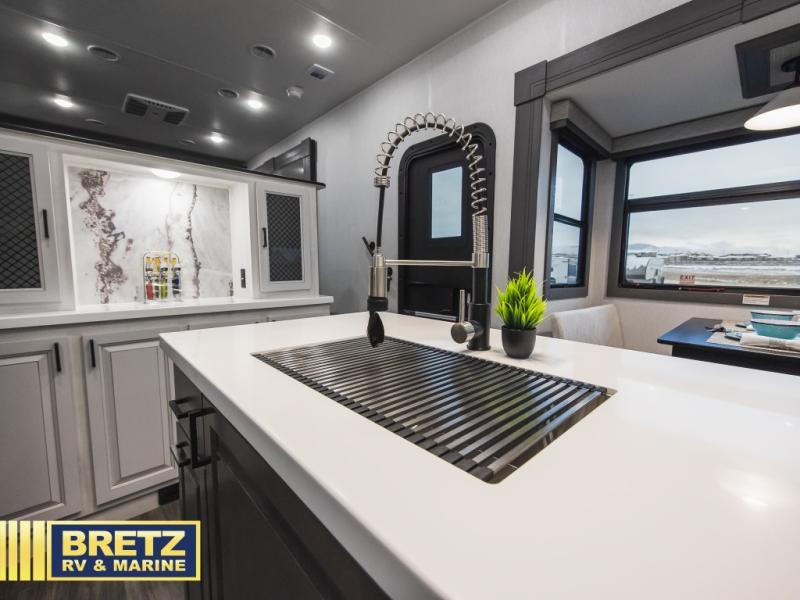 If you've been looking for a luxury fifth wheel to call your new home away from home, take a look at this Ahara! The front living area will be a favorite hangout spot with its dual hide-a-bed sofas, theater seating, and 65" TV with a fireplace. And since there are dual opposing slides here, your guests will have plenty of space to fold down the sofas at night for a great night's rest. If you're looking for your bedroom, head to the back and you'll enjoy a king bed slide out, a dresser, two closets, plus your own full rear bath. The dual bath sinks are sure to come in handy when you're both getting ready for bed, and the spacious shower with a skylight will provide natural light as you clean up in the morning. There is even a closet with washer and dryer prep if you plan to go full-time. In the morning you can prepare breakfast on the four burner cooktop or in the 30" over-the-range residential microwave, and the 16 cu. ft. 12V French door refrigerator includes a double drawer freezer to hold more food. There is a free-standing dinette, a hutch to store nice dishes, and a half bath located off of this room for convenience!