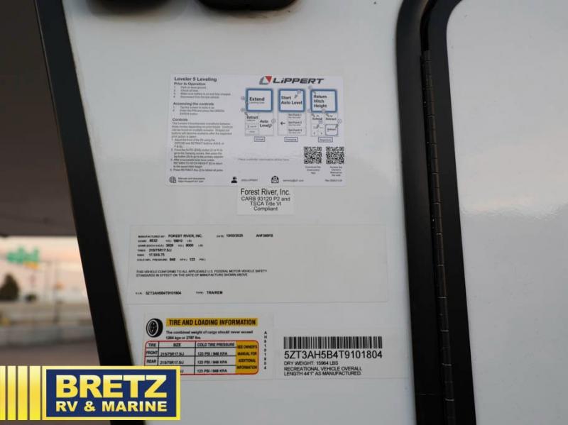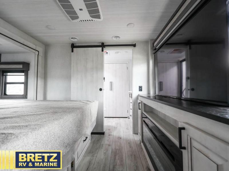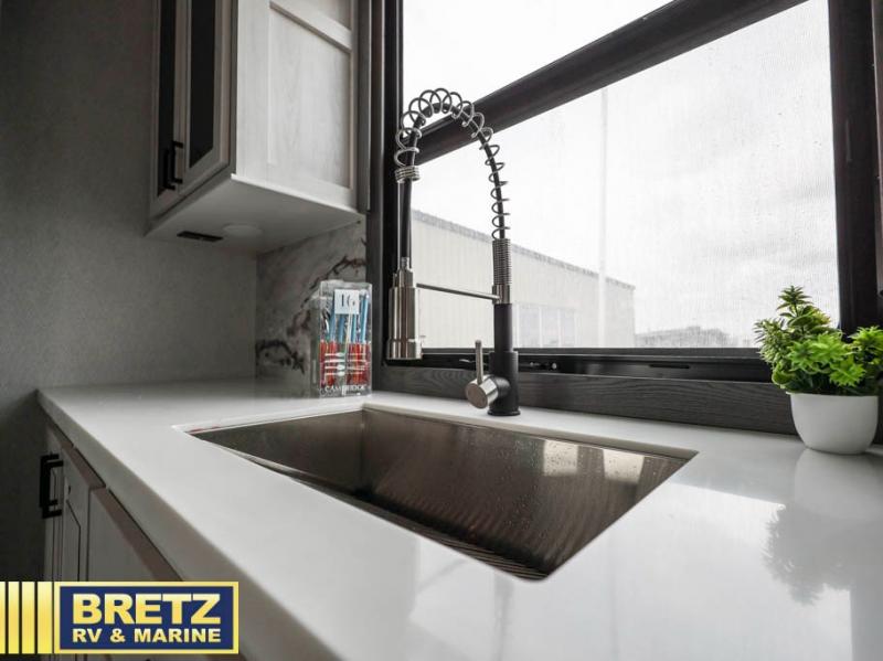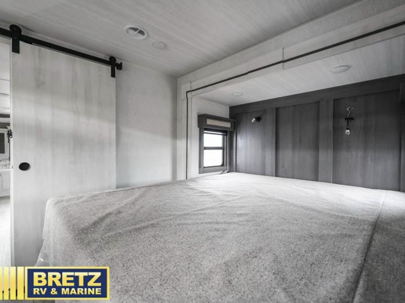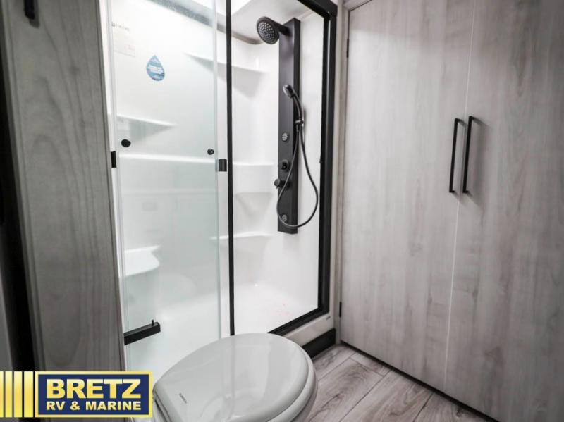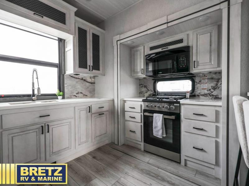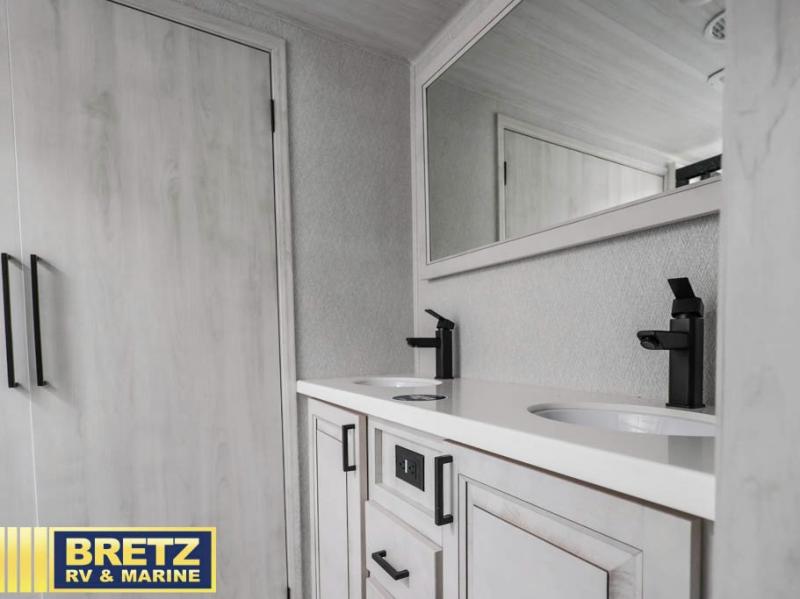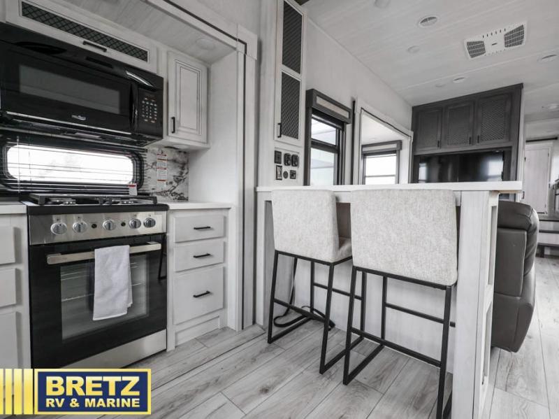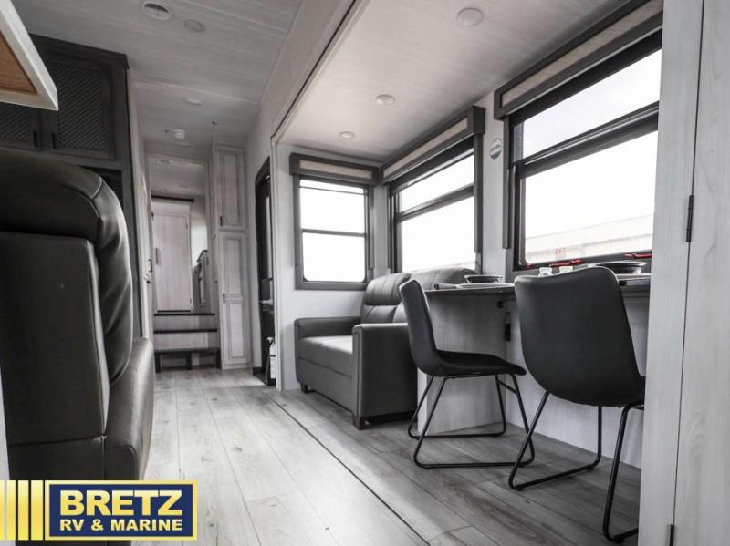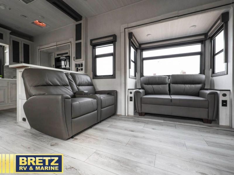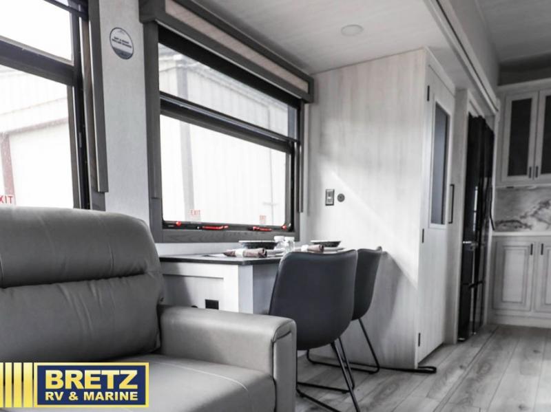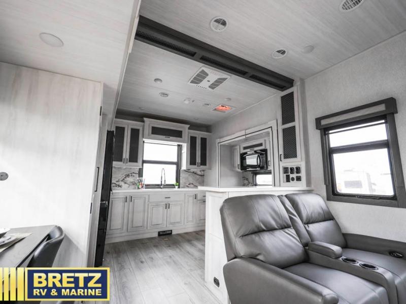 The spacious rear kitchen is equipped with a 30” microwave, 24” residential oven, overhead cabinets, breakfast bar with bar stools, walk-in pantry, and 16 cu. ft. refrigerator, perfect for cooking all your favorite dishes with the greatest convenience  The living room is the heart of the home, featuring a desk with chairs, theater seating, two 60” trifold sofas, a TV with fireplace, and more. And when nature calls, you'll appreciate the convenient half bath with overhead cabinets and washer and dryer prep. The main bedroom is a serene retreat, featuring a king bed, drawers under the bed, a bedroom fireplace, and more. This is the perfect place to relax and recharge after a long day of adventure, and with a front full bathroom featuring a 30” x 40” shower, dual sink vanity, walk-in closet, dresser/drawers, you'll have everything you need to stay clean and comfortable on the go. Outside, you'll find not one, but two awnings to providing plenty of shade and protection from the elements.