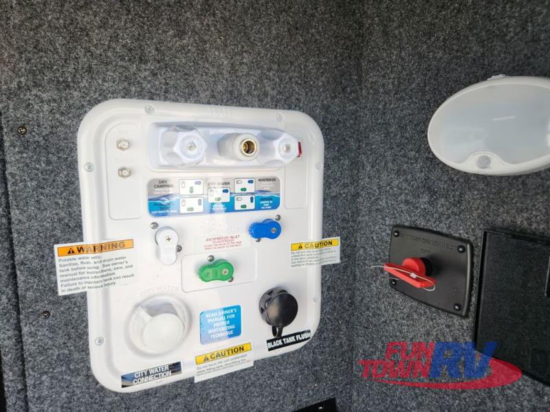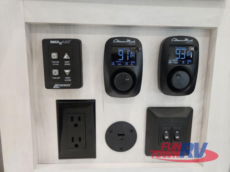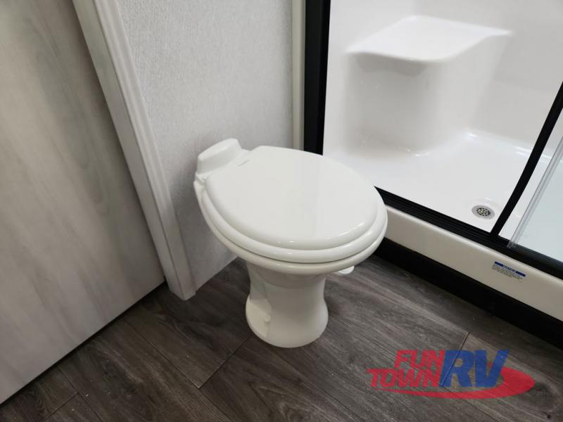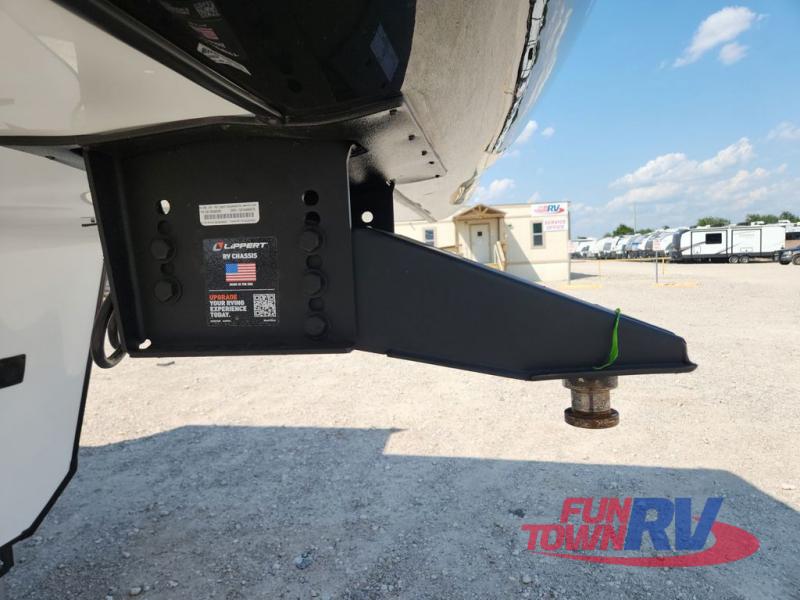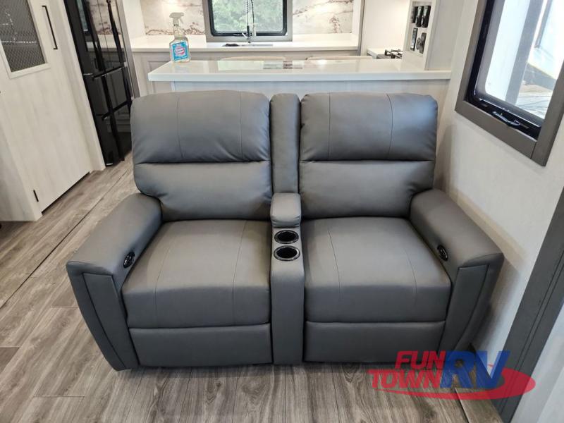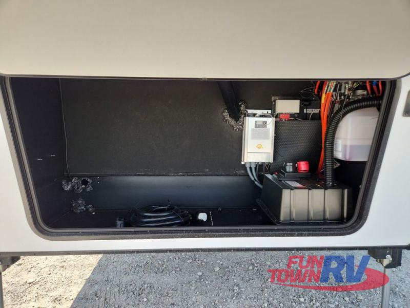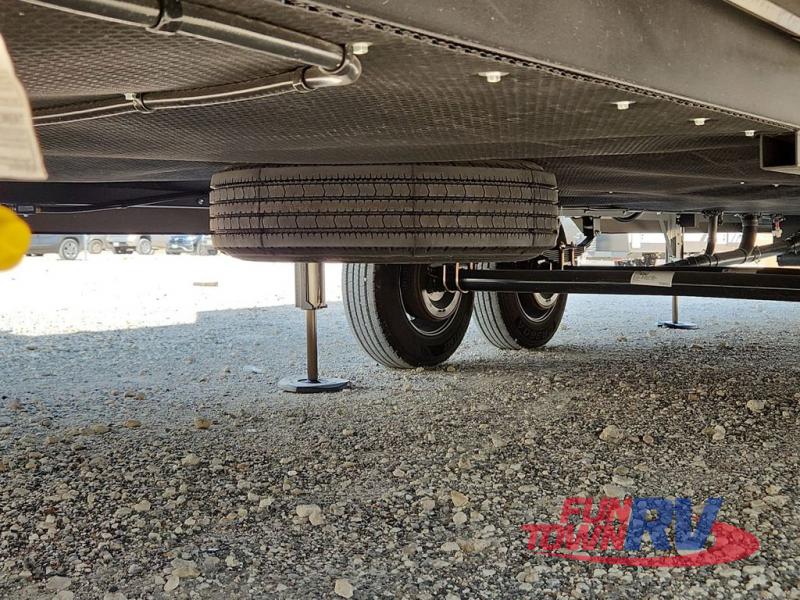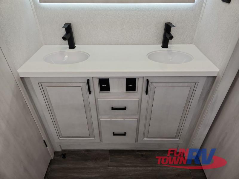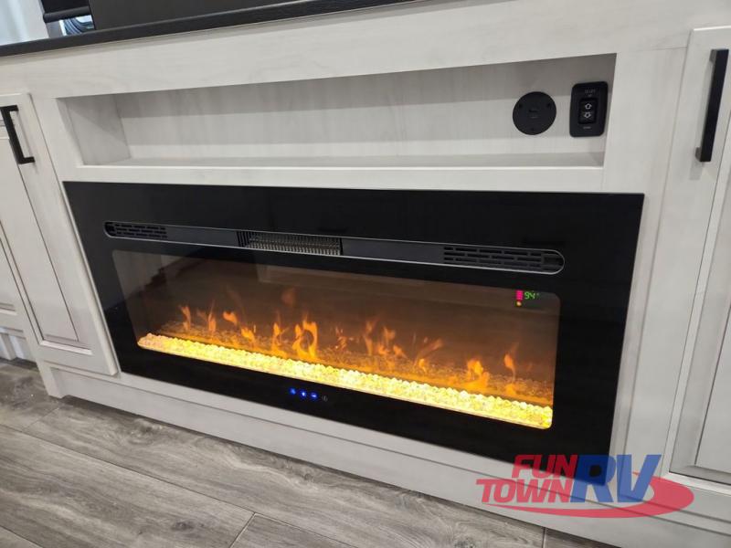 The spacious rear kitchen is equipped with a 30” microwave, 24” residential oven, overhead cabinets, breakfast bar with bar stools, walk-in pantry, and 16 cu. ft. refrigerator, perfect for cooking all your favorite dishes with the greatest convenience The living room is the heart of the home, featuring a desk with chairs, theater seating, two 60” trifold sofas, a TV with fireplace, and more. And when nature calls, you'll appreciate the convenient half bath with overhead cabinets and washer and dryer prep. The main bedroom is a serene retreat, featuring a king bed, drawers under the bed, a bedroom fireplace, and more. This is the perfect place to relax and recharge after a long day of adventure, and with a front full bathroom featuring a 30” x 40” shower, dual sink vanity, walk-in closet, dresser/drawers, you'll have everything you need to stay clean and comfortable on the go. Outside, you'll find not one, but two awnings to providing plenty of shade and protection from the elements.
