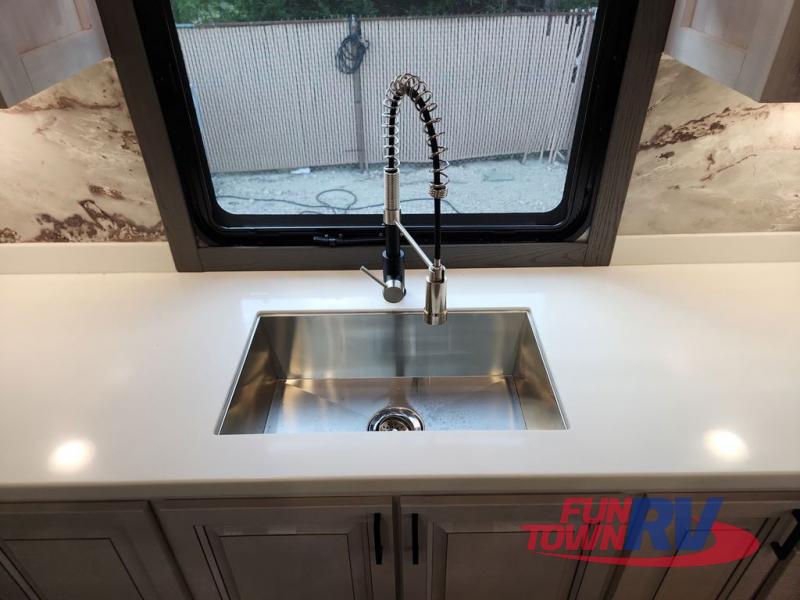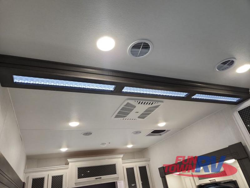There is just too much luxury to name on the EAST TO WEST Ahara fifth wheel! These units are quite impressive, and once you see them, you'll know what we mean. The Ahara first grabs your attention with its fully painted aerodynamic fiberglass front cap, 102" wide-body chassis, and deep tint square frameless windows. For towing, you'll find a MORryde CRE 3000 suspension, LED marker lights, LED taillights with back-up lights, and rear view camera prep. Traveling in different climates is also made easy with the high-efficiency triple A/C system, 40,000 BTU high-capacity furnace, plus heated, insulated, and enclosed underbelly found within the Climate Package. Head inside to enjoy Slow Rise roller shades, a flush floor kitchen slide to help prevent trips, and solid surface countertops in the kitchen and bath to name a few luxuries!