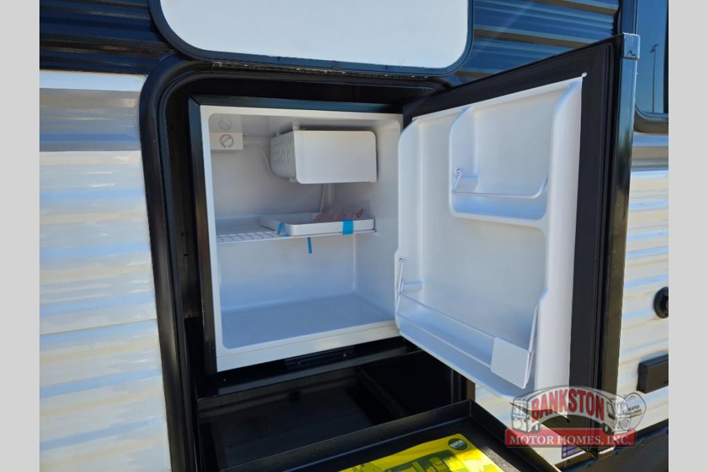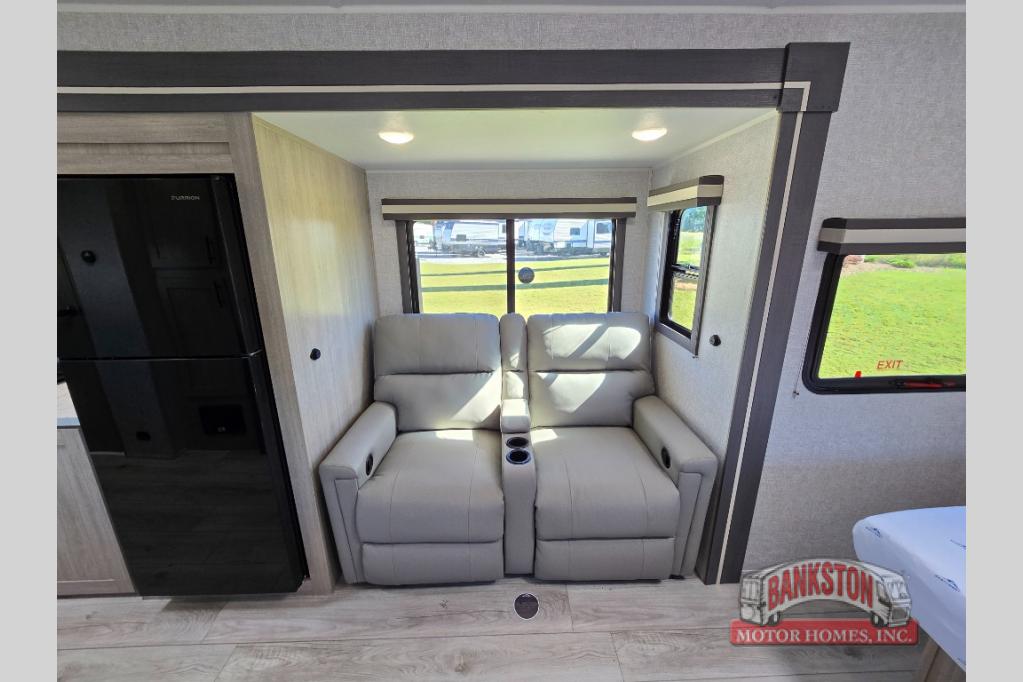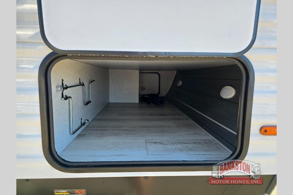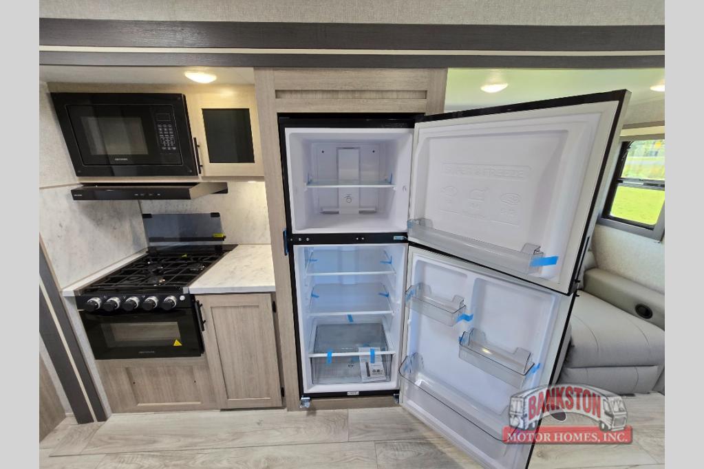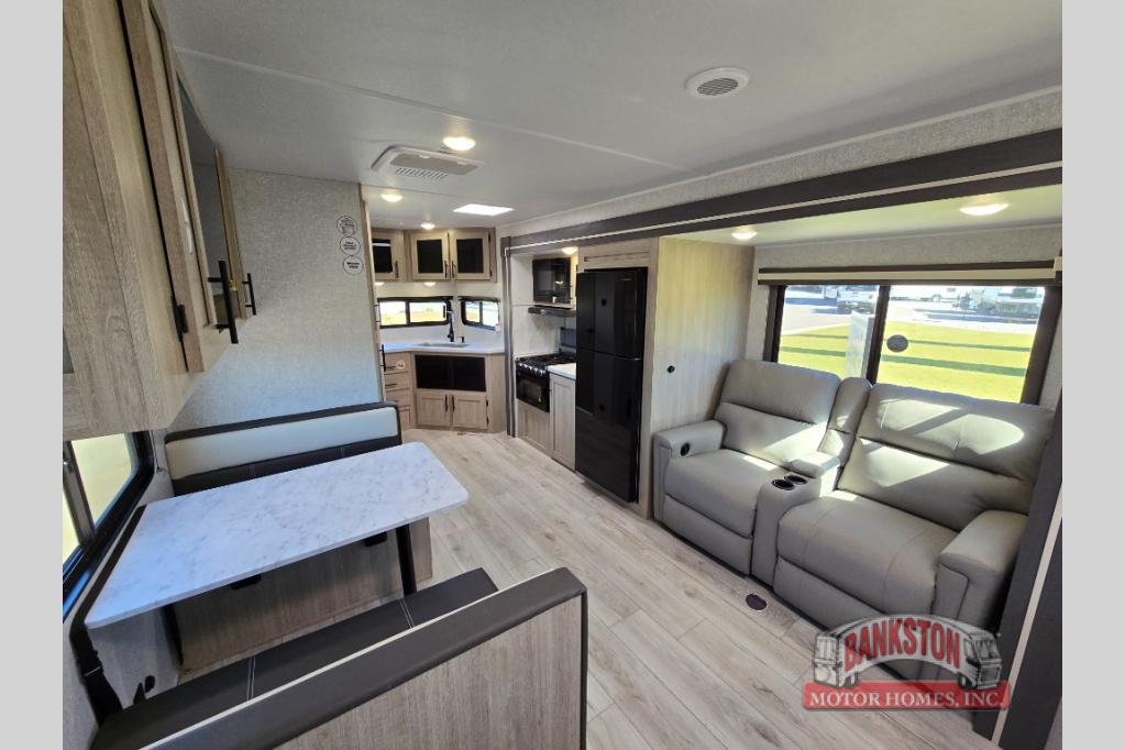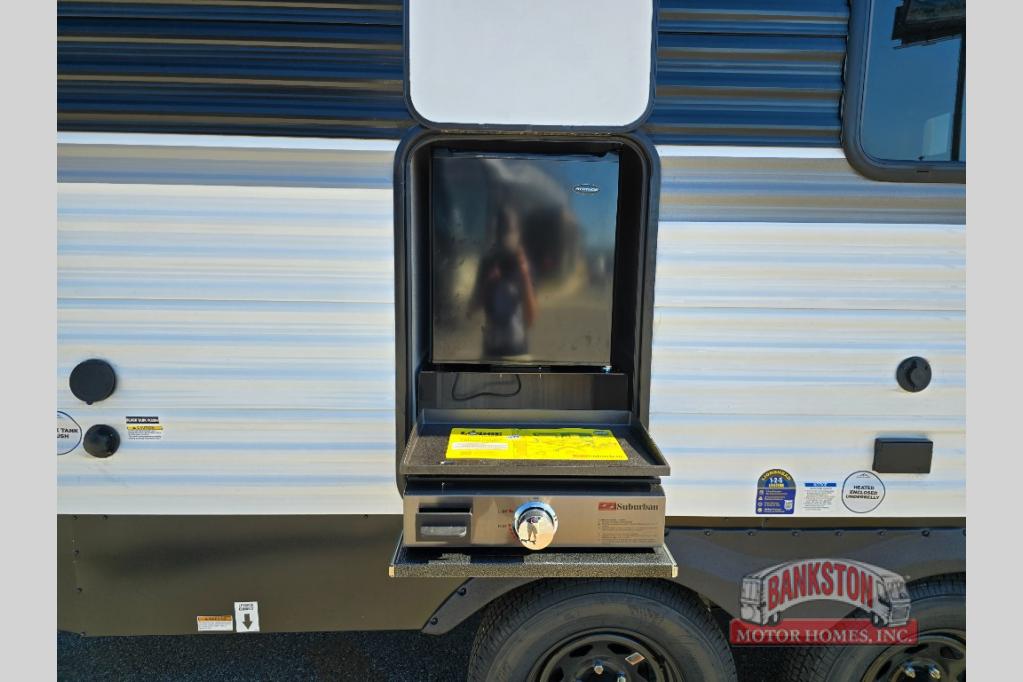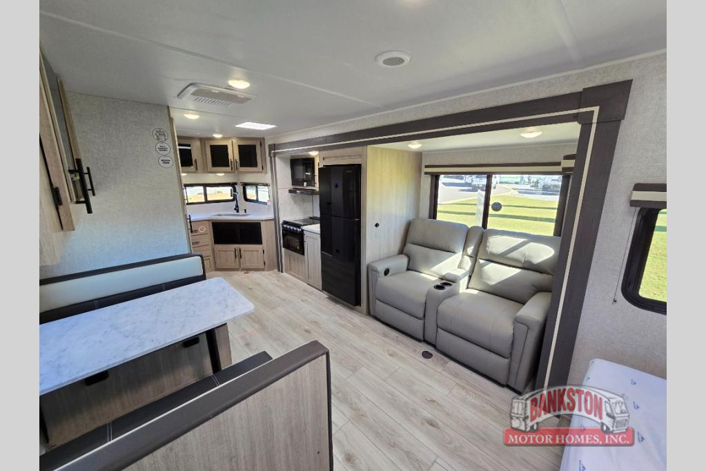 Head to the lake in this travel trailer with a large slide out for more space and comfort! Once you arrive, you can put out the 18' power awning, unload the pass-through storage, and make lunch on the outdoor kitchen with a pull-out griddle and refrigerator. The booth dinette inside can be used as dining space, and there is storage underneath here for added convenience. A jiffy sofa within the slide can be switched out for an optional theater seat if you don't need the extra sleeping space. You will also find a full interior kitchen in the rear corner, and the full bath in the other rear corner is sure to come in handy. When you're ready for some shut-eye, the king bed in the front bedroom will feel just like home. There are also dual wardrobes and nightstands to keep your things tidy!