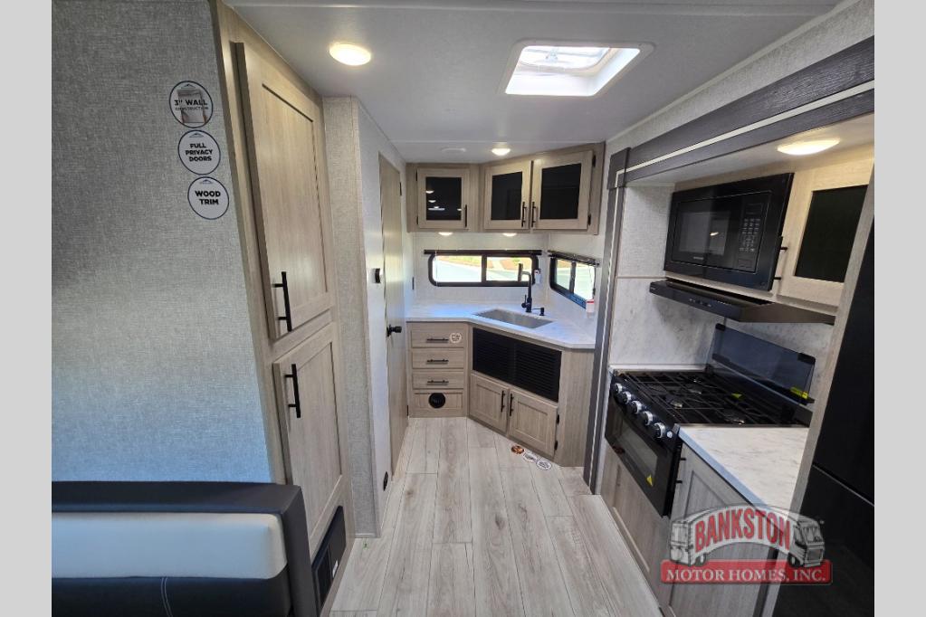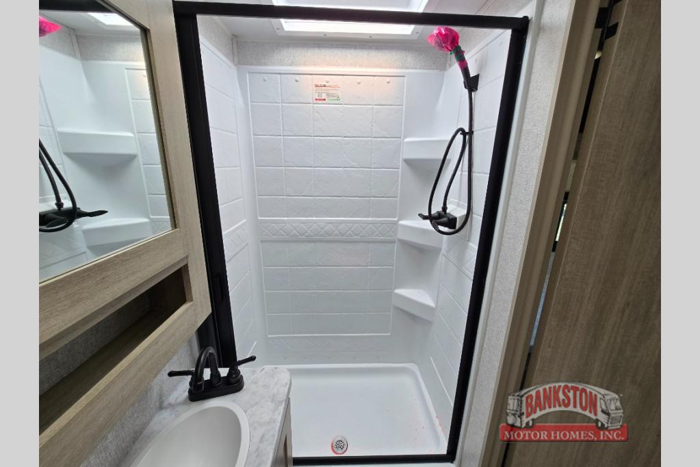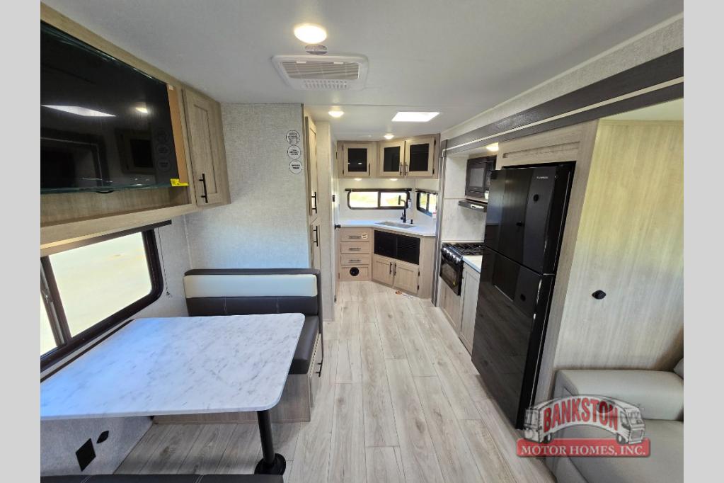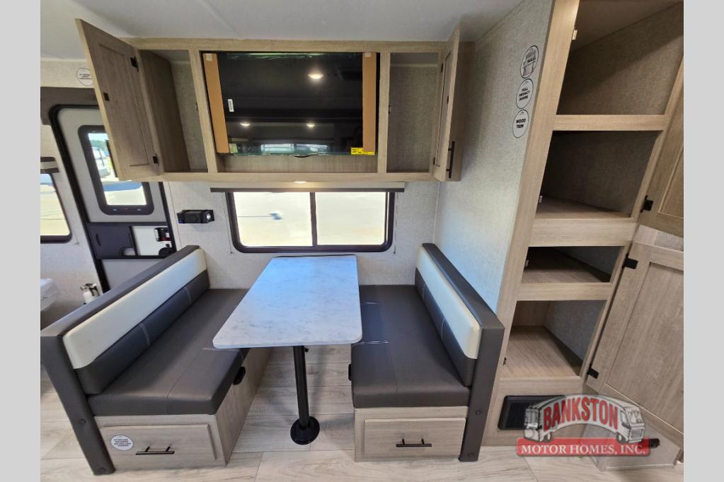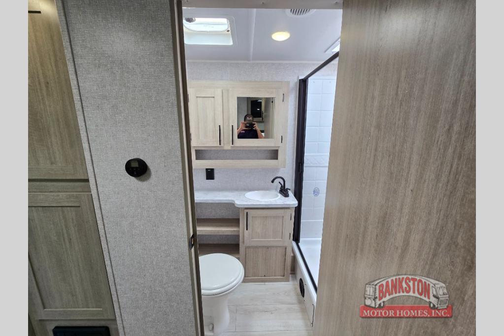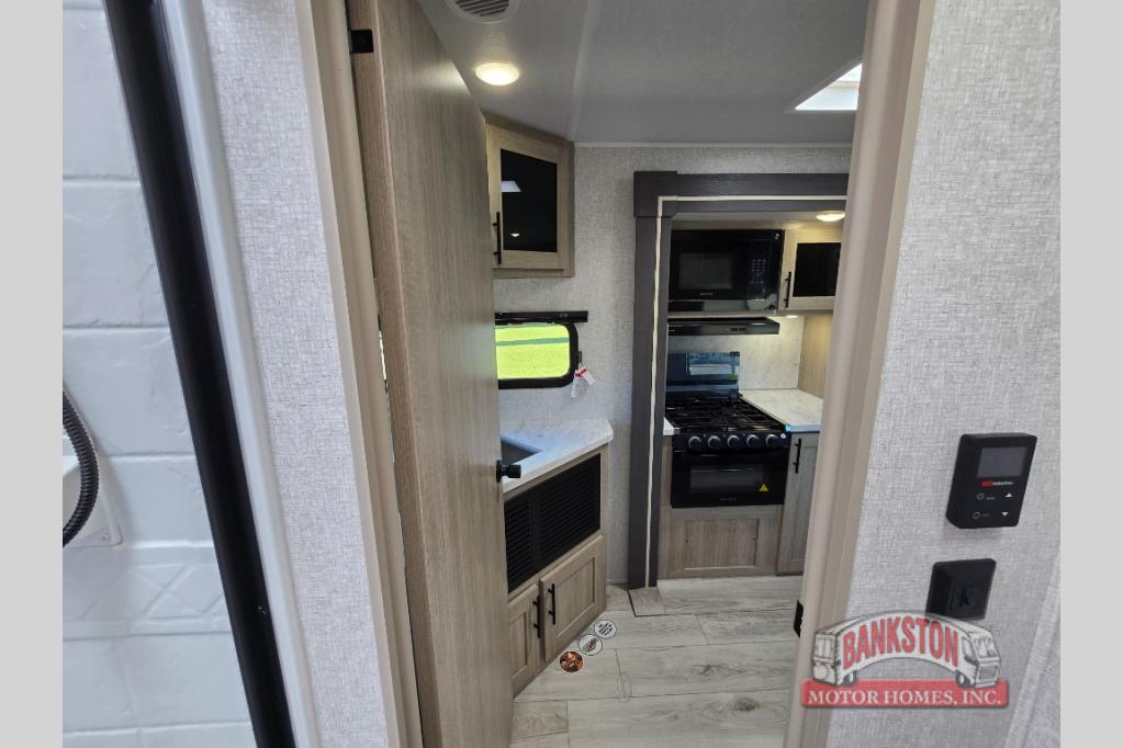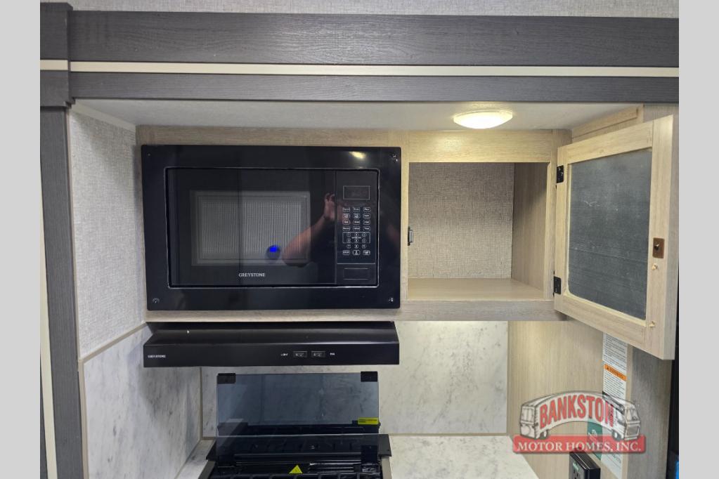 Head to the lake in this travel trailer with a large slide out for more space and comfort! Once you arrive, you can put out the 18' power awning, unload the pass-through storage, and make lunch on the outdoor kitchen with a pull-out griddle and refrigerator. The booth dinette inside can be used as dining space, and there is storage underneath here for added convenience. A jiffy sofa within the slide can be switched out for an optional theater seat if you don't need the extra sleeping space. You will also find a full interior kitchen in the rear corner, and the full bath in the other rear corner is sure to come in handy. When you're ready for some shut-eye, the king bed in the front bedroom will feel just like home. There are also dual wardrobes and nightstands to keep your things tidy!