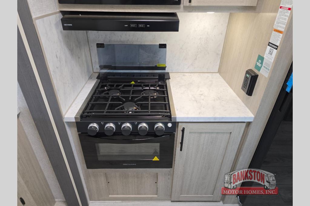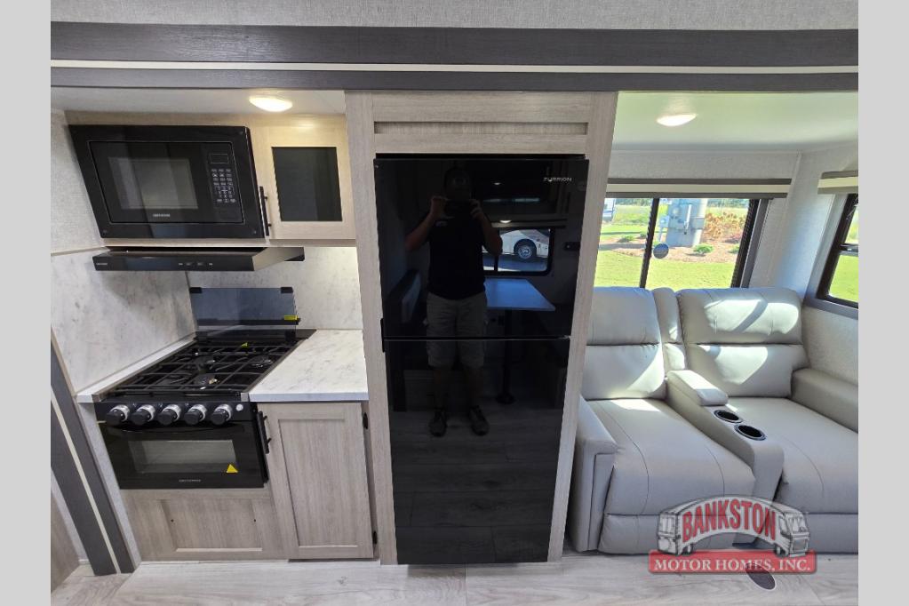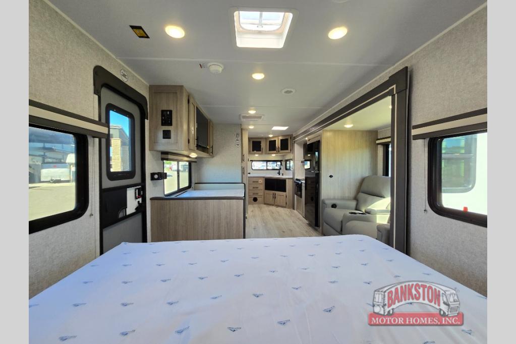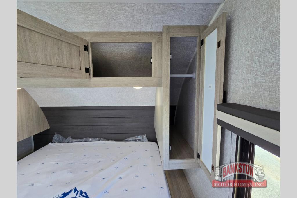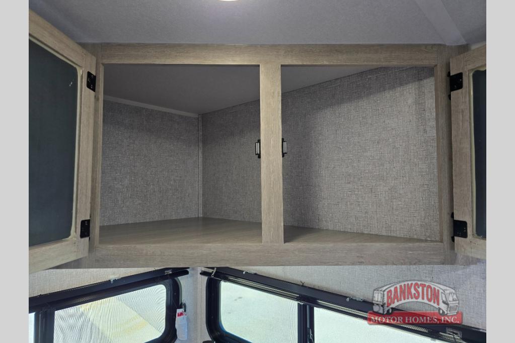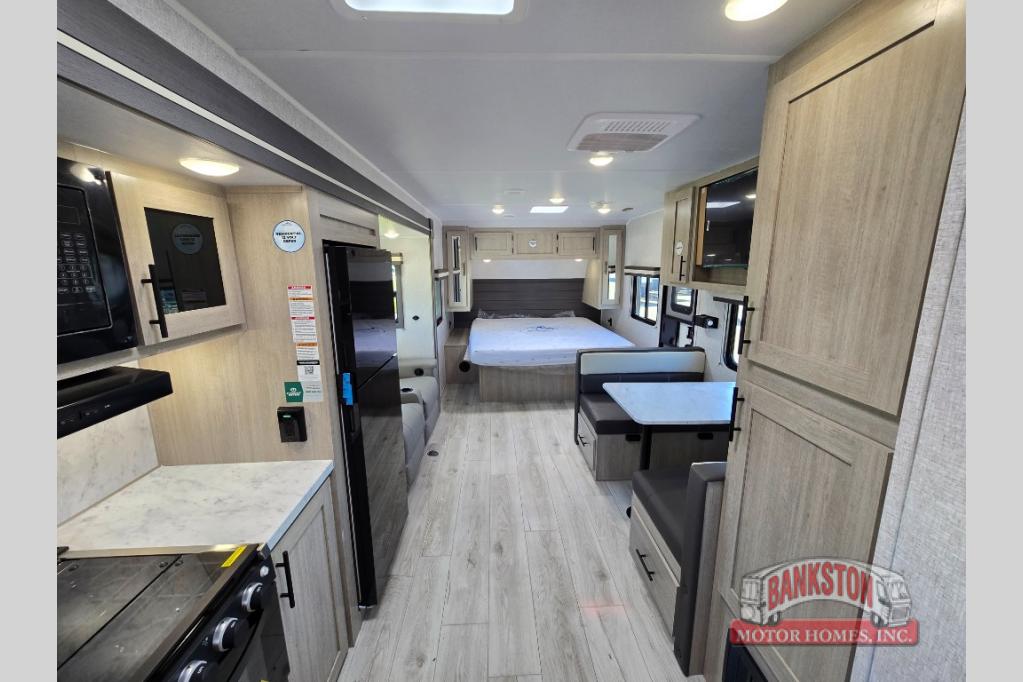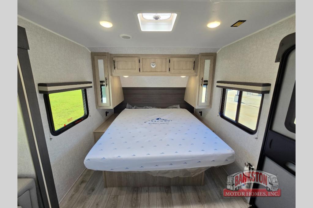 Head to the lake in this travel trailer with a large slide out for more space and comfort! Once you arrive, you can put out the 18' power awning, unload the pass-through storage, and make lunch on the outdoor kitchen with a pull-out griddle and refrigerator. The booth dinette inside can be used as dining space, and there is storage underneath here for added convenience. A jiffy sofa within the slide can be switched out for an optional theater seat if you don't need the extra sleeping space. You will also find a full interior kitchen in the rear corner, and the full bath in the other rear corner is sure to come in handy. When you're ready for some shut-eye, the king bed in the front bedroom will feel just like home. There are also dual wardrobes and nightstands to keep your things tidy!