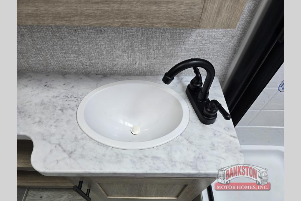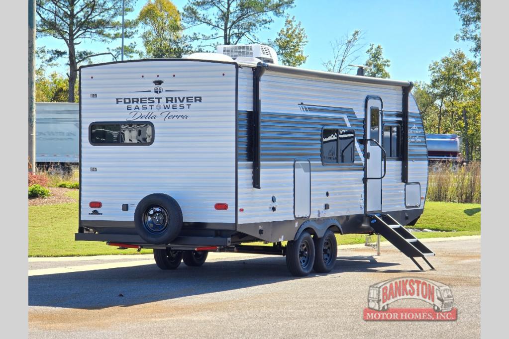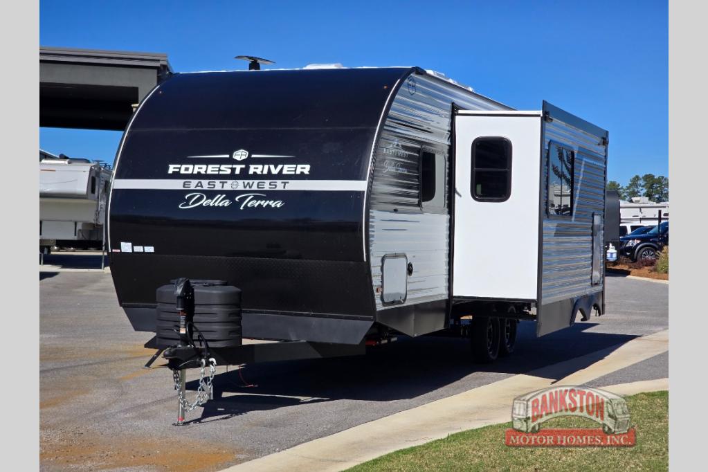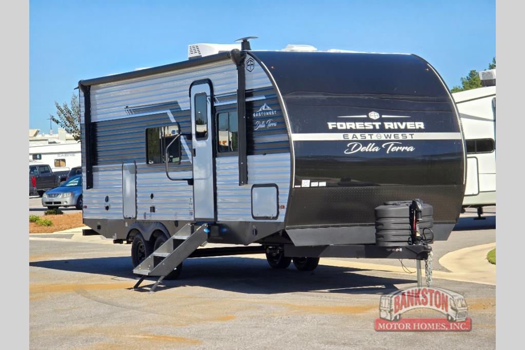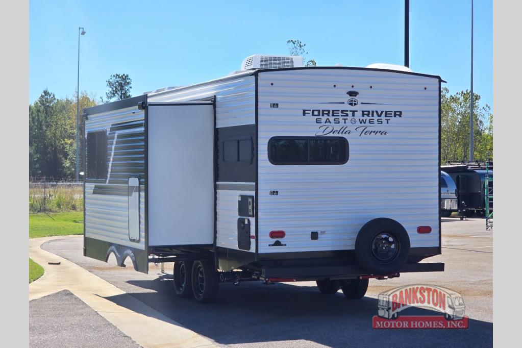 Each Della Terra travel trailer by EAST TO WEST is constructed with an enclosed and heated underbelly and enclosed holding tanks for added protection against the elements. There is also a power tongue jack with an LED light for easy set up and a power awning with LED lights you can rest under after you've unpacked. The Explore Comfort Package comes seamless pressed countertops, kitchen backsplash, window valance package with black night shades, and many more comforts. You will also appreciate the Adventure Outdoor Package with backup camera prep and solar prep, a tankless water heater, an RV grill quick disconnect, and a universal docking station with battery disconnect.