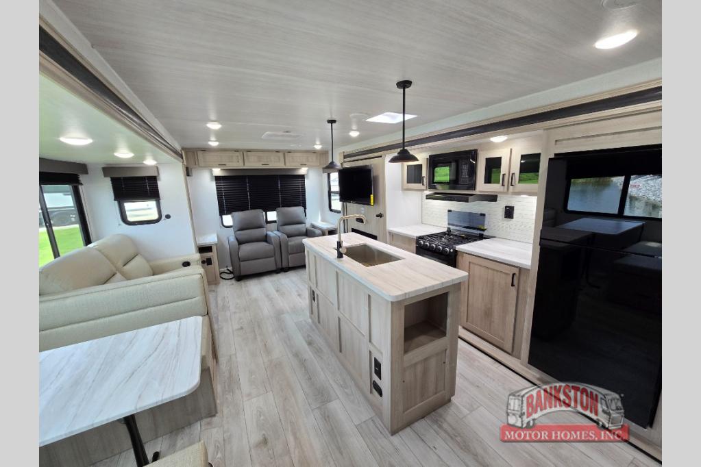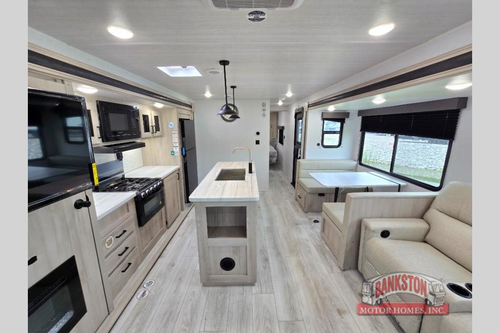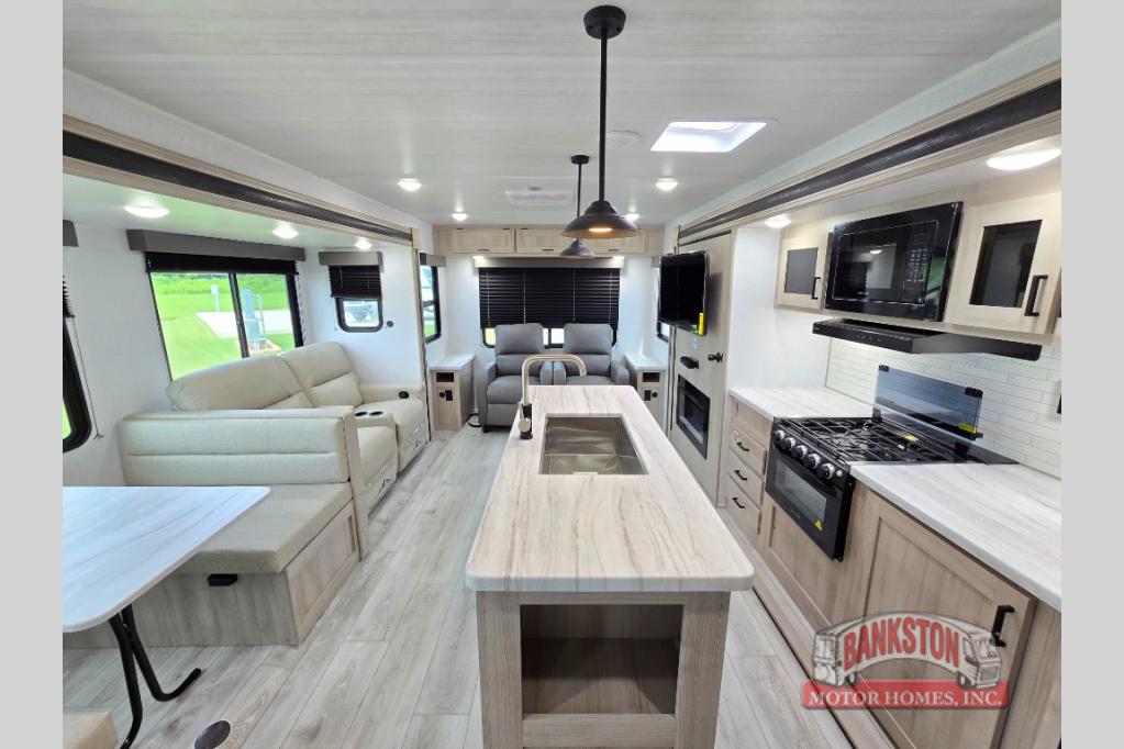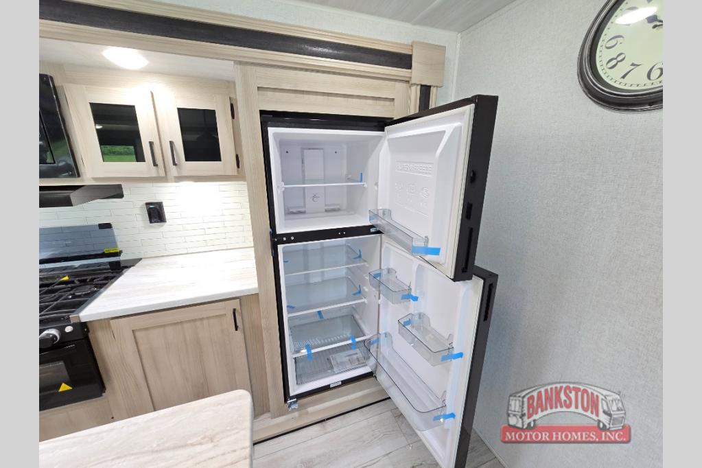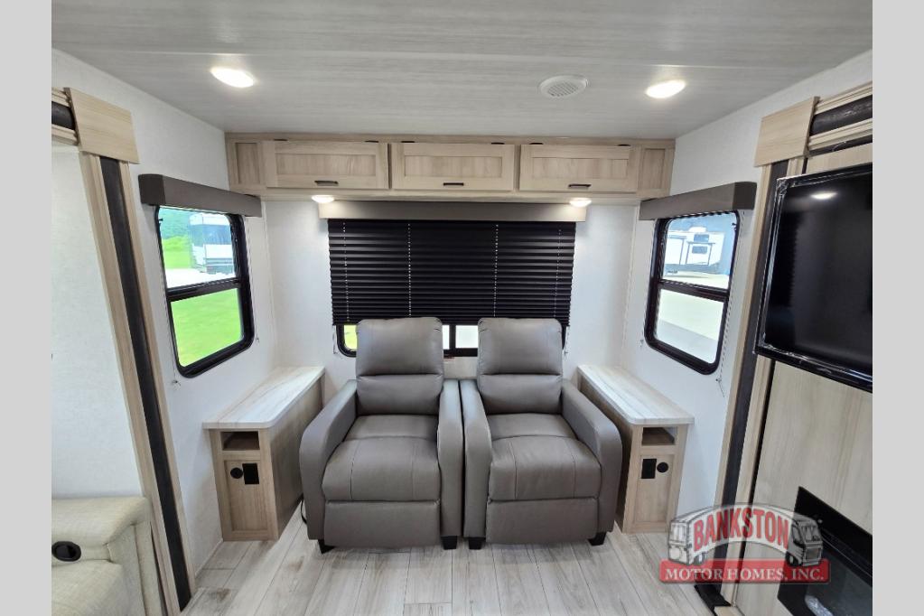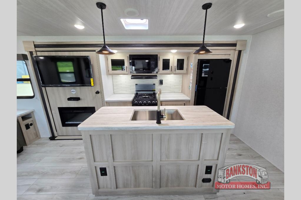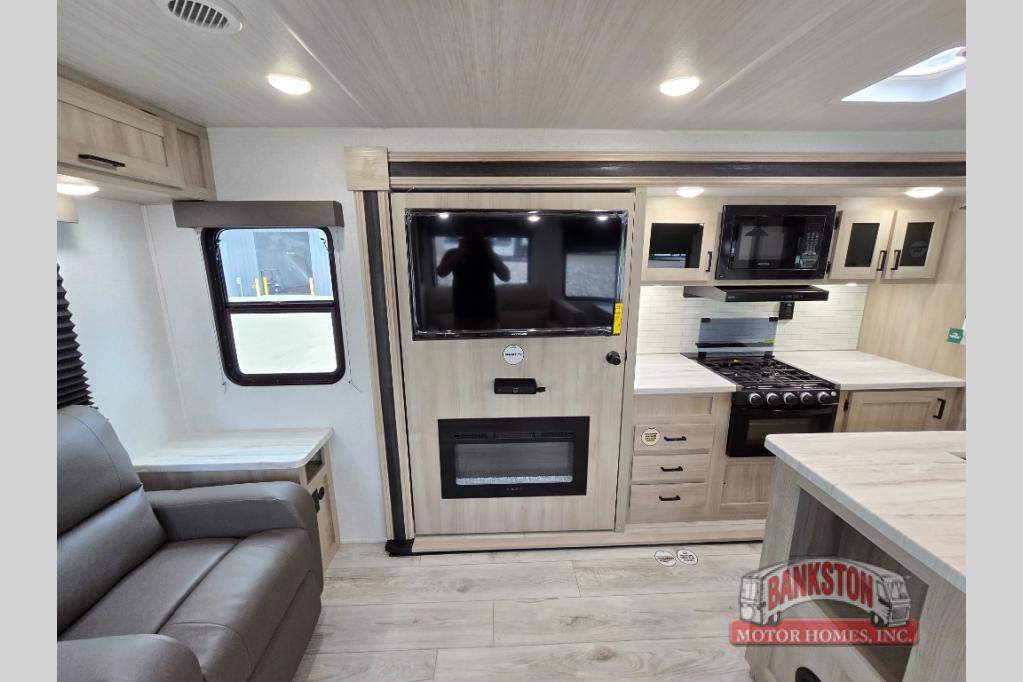 Camping in this double slide out travel trailer will be easier than ever! Once you arrive at your destination, set up the power awning, unload the pass-through storage, and head inside to make lunch in the full kitchen. There is a kitchen island for more prep space, along with a 10.7 cu. ft. 12V refrigerator, three burner range, and microwave oven. You'll find comfortable seating space on the booth dinette, jiffy sofa, and dual lounge chairs, and the fireplace is sure to make your space feel more like home. There is also hidden storage behind the fireplace for pantry items, board games, and more! Up front, a full bath and front private bedroom will let you freshen up before a great night's rest on the king bed!