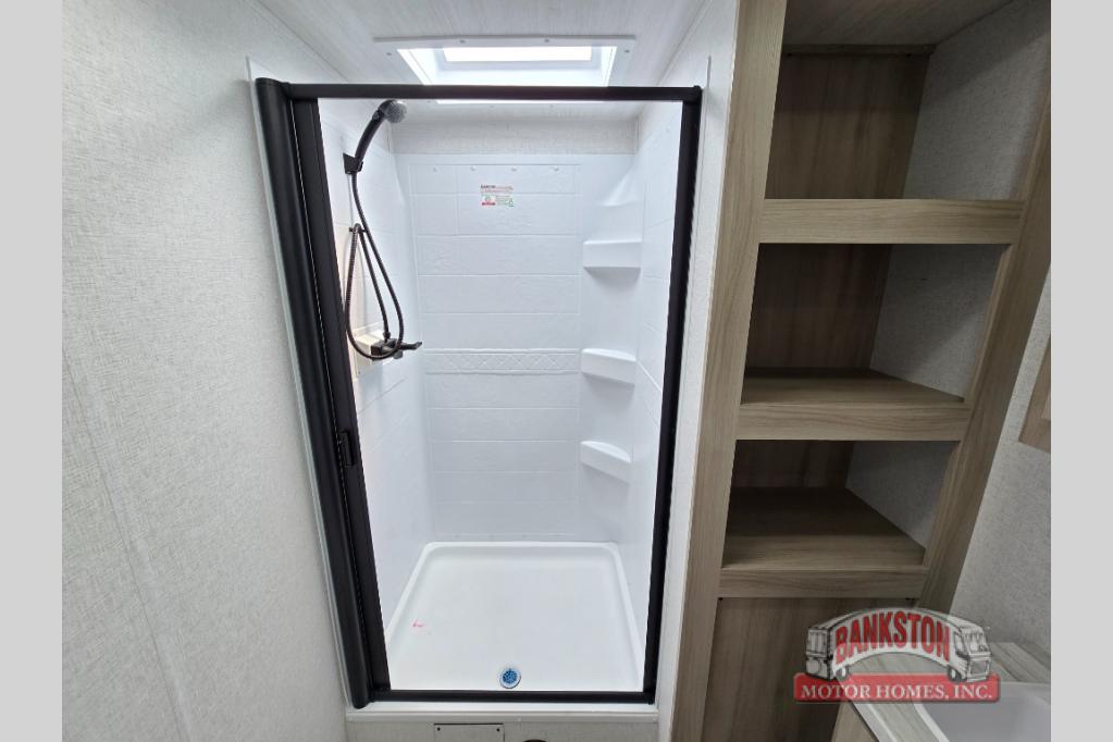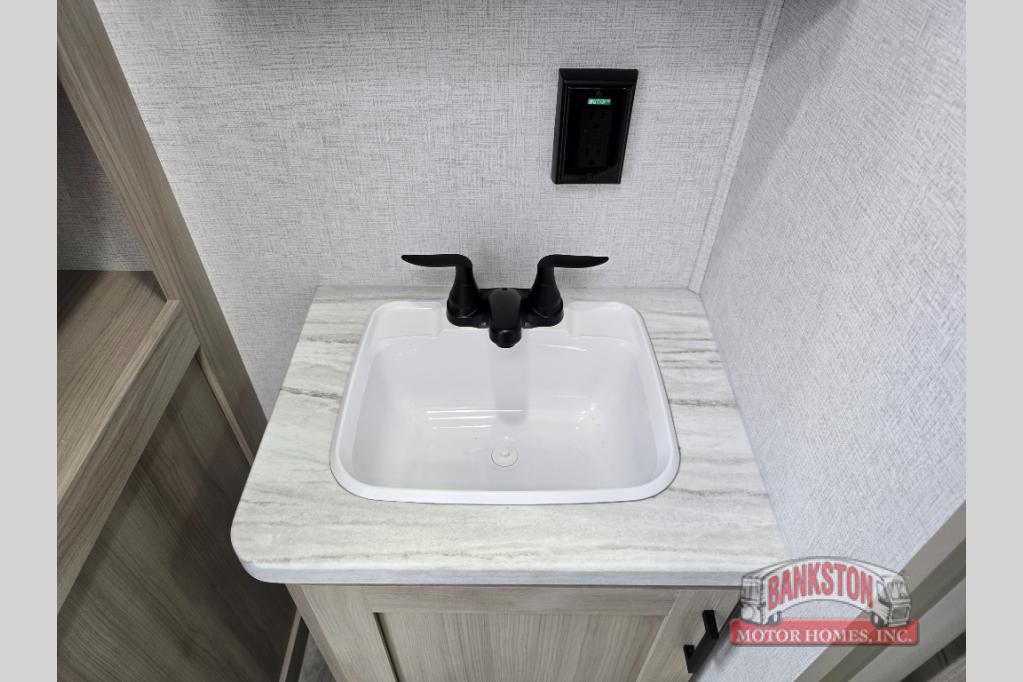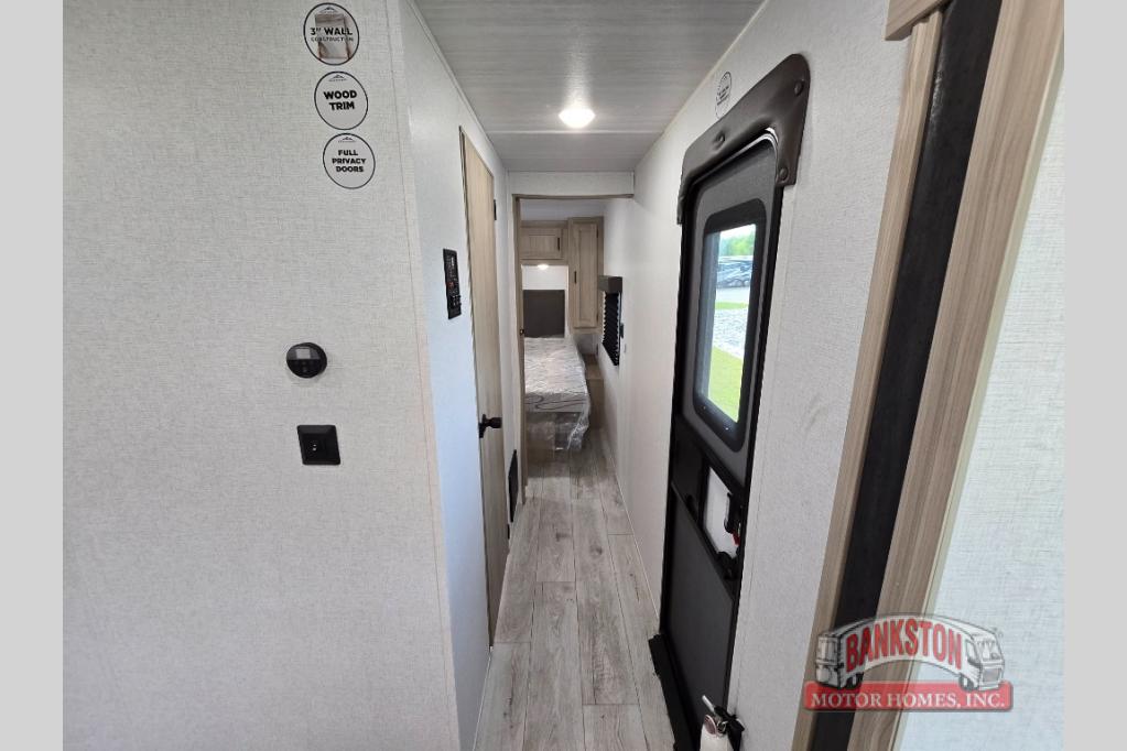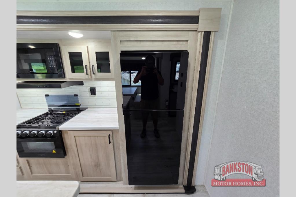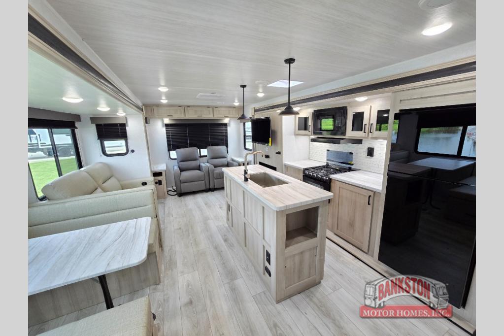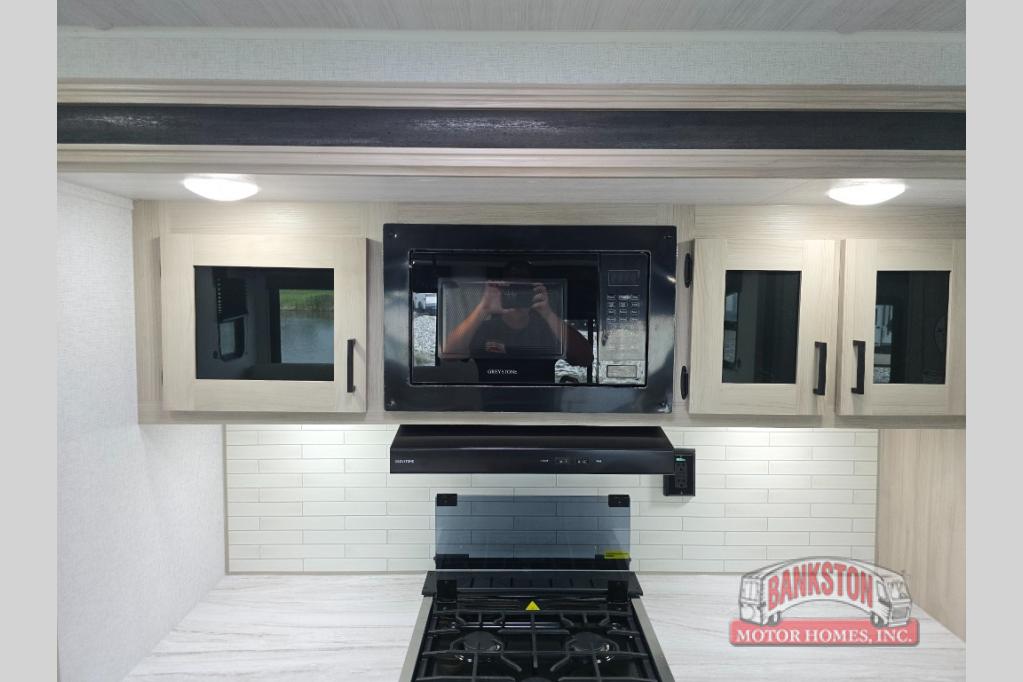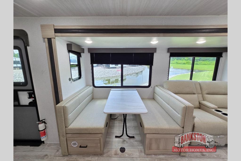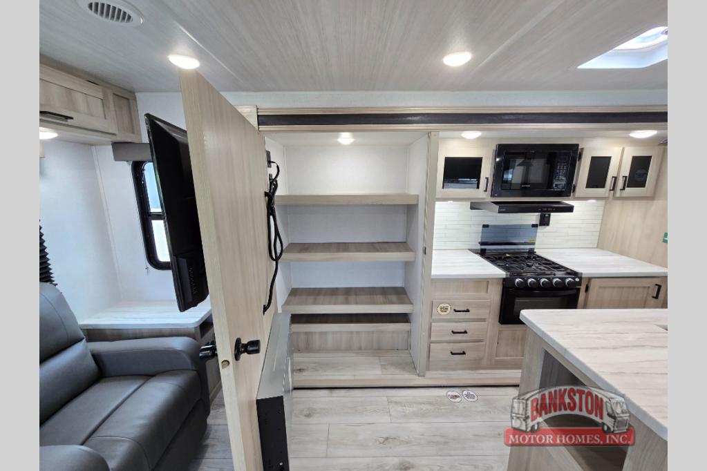Camping in this double slide out travel trailer will be easier than ever! Once you arrive at your destination, set up the power awning, unload the pass-through storage, and head inside to make lunch in the full kitchen. There is a kitchen island for more prep space, along with a 10.7 cu. ft. 12V refrigerator, three burner range, and microwave oven. You'll find comfortable seating space on the booth dinette, jiffy sofa, and dual lounge chairs, and the fireplace is sure to make your space feel more like home. There is also hidden storage behind the fireplace for pantry items, board games, and more! Up front, a full bath and front private bedroom will let you freshen up before a great night's rest on the king bed!