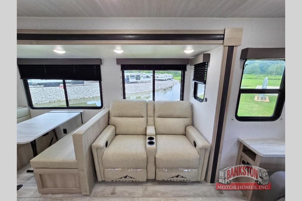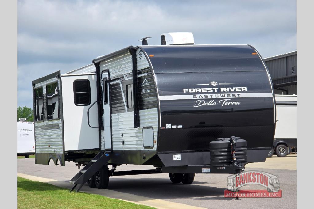 Each Della Terra travel trailer by EAST TO WEST is constructed with an enclosed and heated underbelly and enclosed holding tanks so you can camp all year long. There is also a power tongue jack with an LED light for easy set up and a power awning with LED lights you can rest under after you've unpacked. The Explore Comfort Package comes seamless pressed countertops, kitchen backsplash, window valance package with black night shades, and many more comforts. You will also appreciate the Adventure Outdoor Package with backup camera prep and solar prep, a tankless water heater, an RV grill quick disconnect, and a universal docking station with battery disconnect.