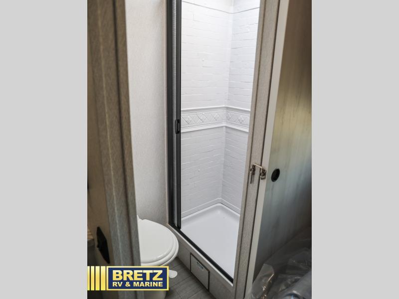 You're going to love traveling and camping in this coach that can sleep five to six each night. The convection microwave and 10.7 cu. ft. 12V refrigerator will let you cook and store food, and the booth dinette provides a place to dine together. A private bath includes a shower and toilet, with the sink just outside this room so two people can freshen up at once. You will sleep soundly each night on the rear corner queen bed slide out, while the little ones take the 60" x 80" bunk over cab!