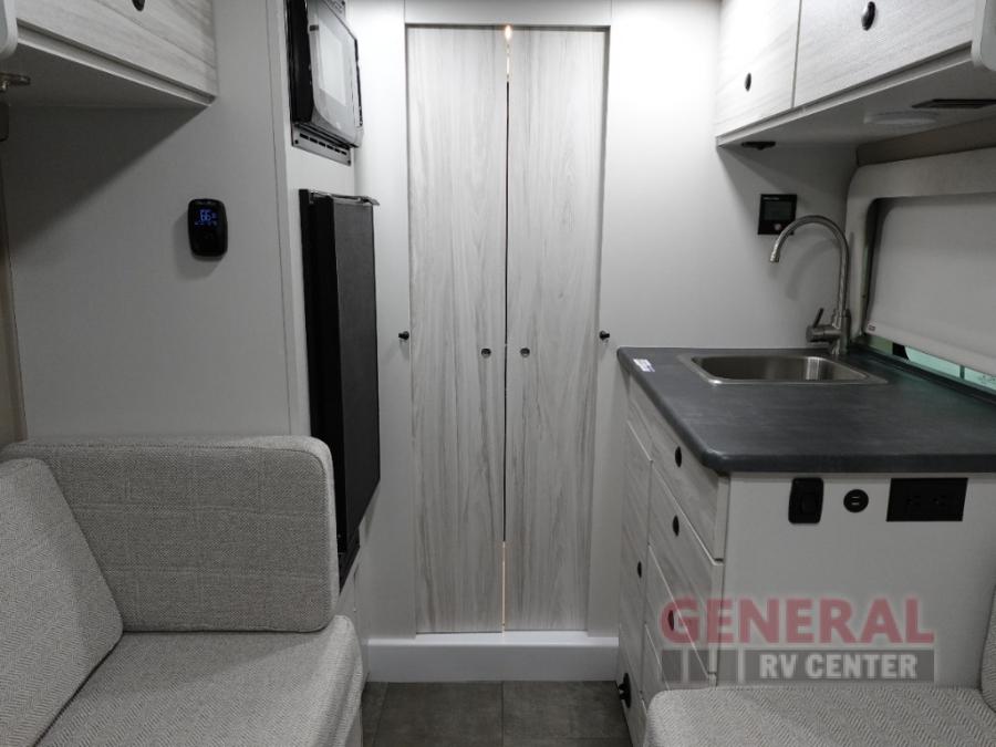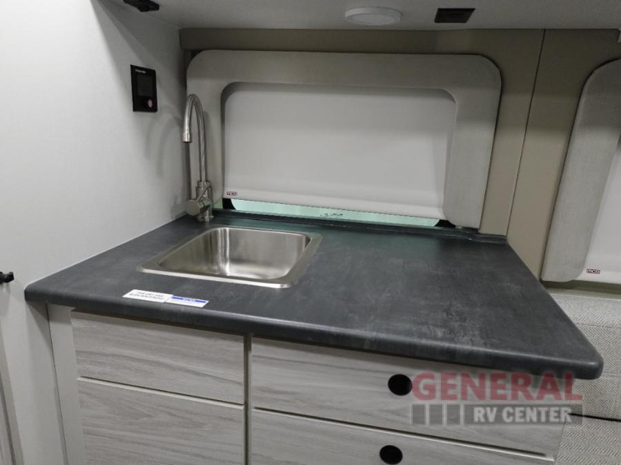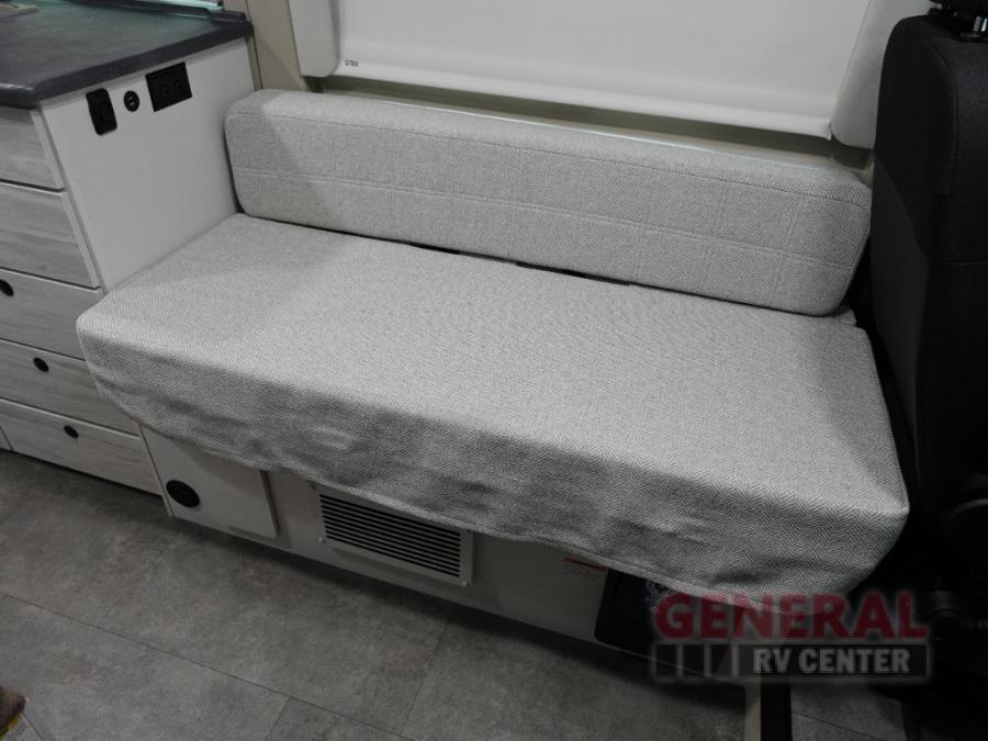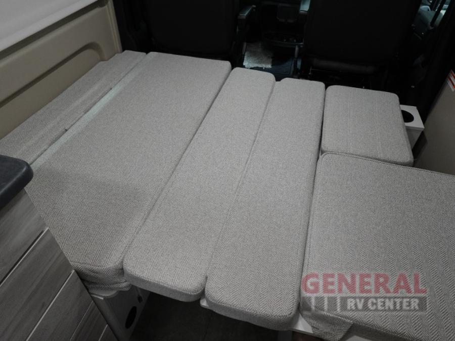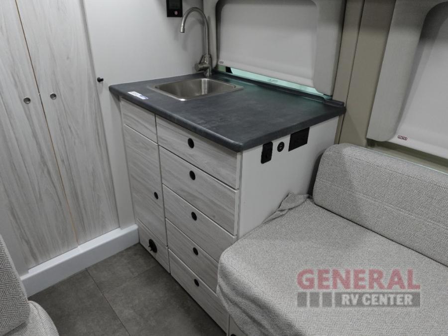 Any trip in this camper van will be spent in comfort thanks to the convenient wet bath and full kitchen amenities. You can whip up a hearty breakfast on the portable induction cooktop or use the microwave oven. There is a stainless steel sink to clean up, and the pressed countertops will be easy to clean. After you've hiked for the day and gotten cleaned up in the rear wet bath, you can relax on the 54" sofa that will convert to a 54" x 72" bed. There is also a 27" bench seat for more seating space and plenty of overhead cabinets for personal belongings, board games and more.