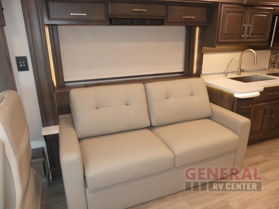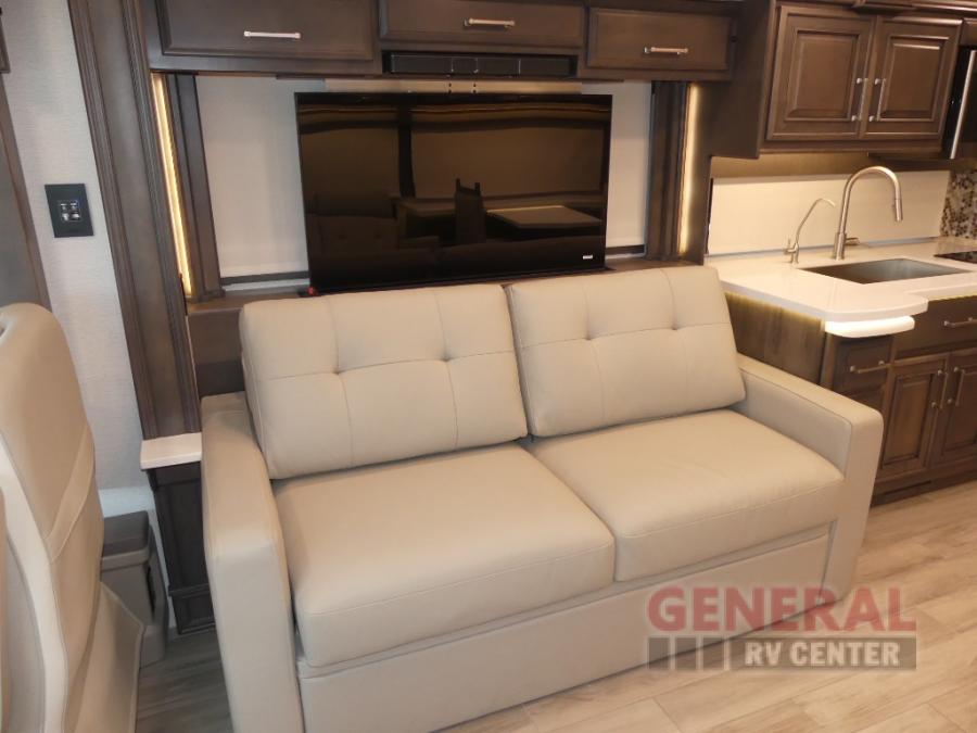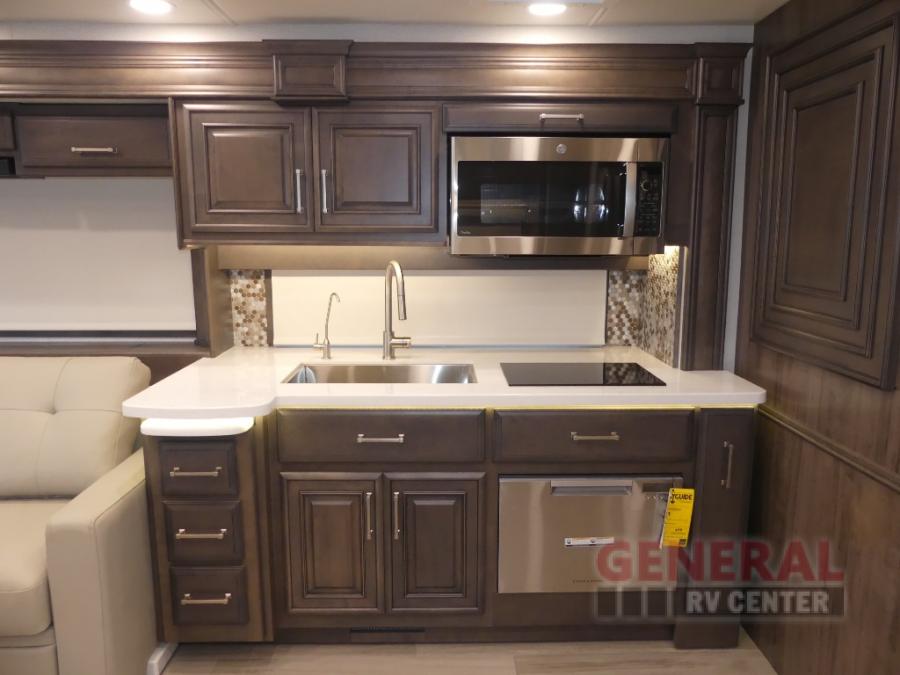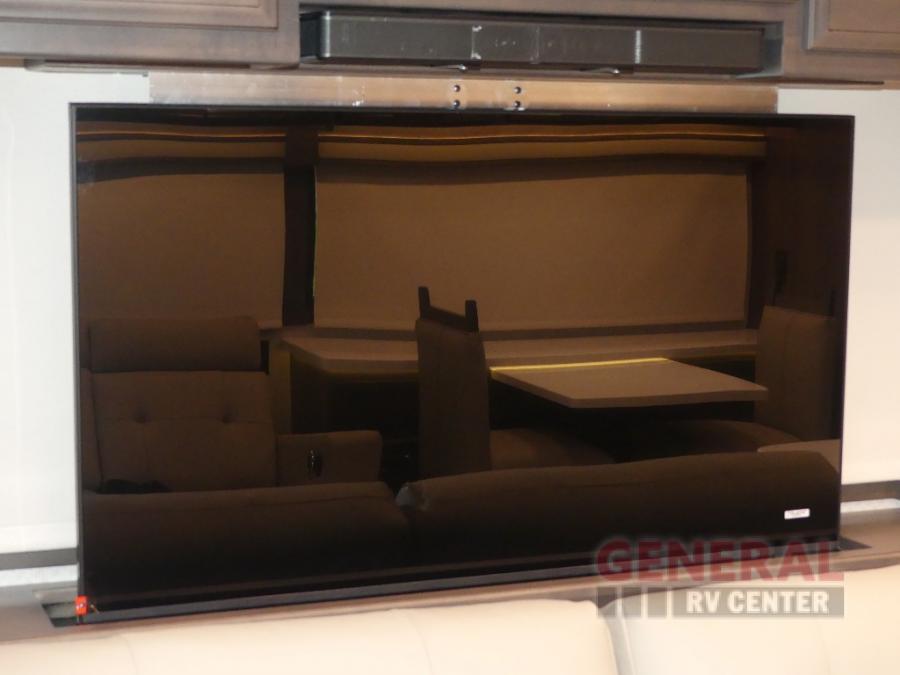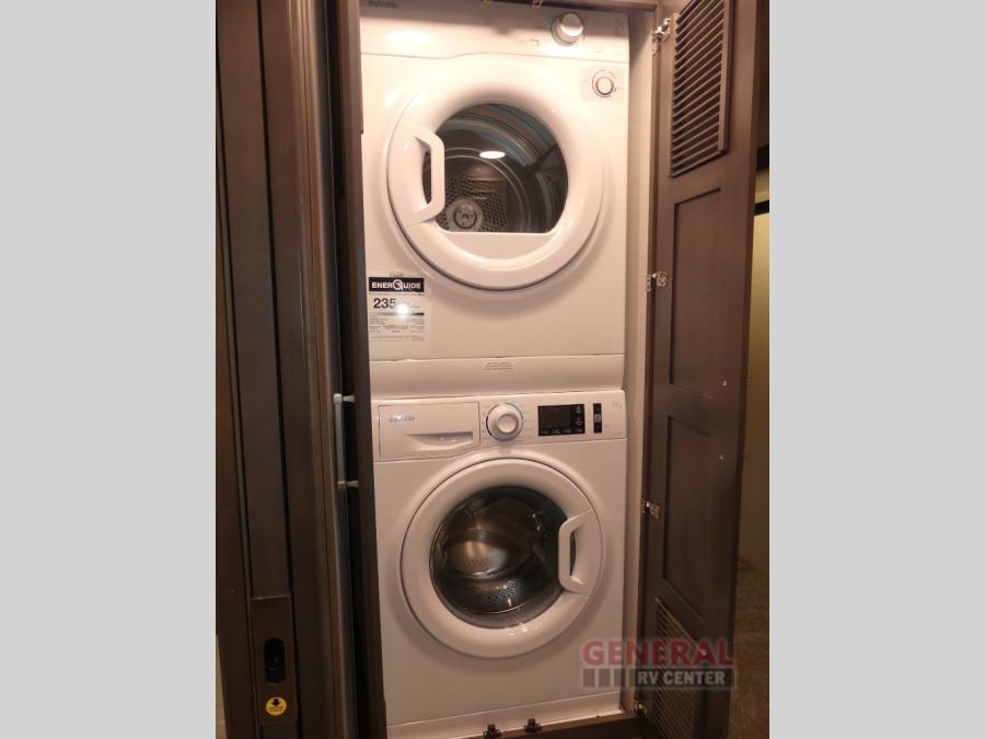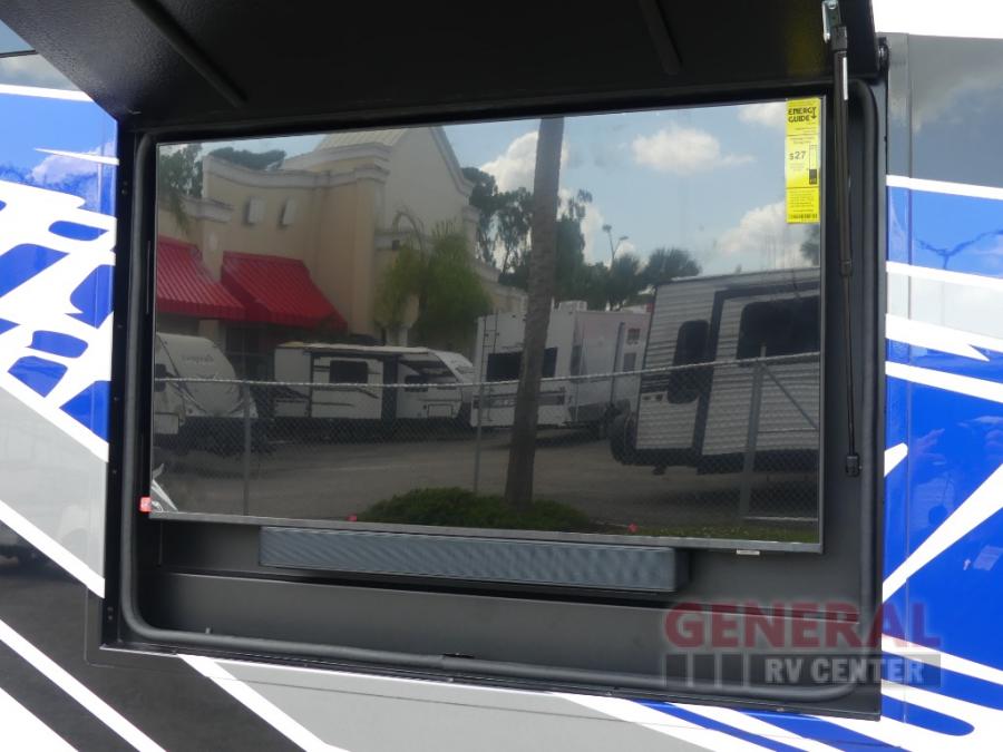 If you're looking for more space for your things, you're going to love this coach with a large walk-in closet in the rear bathroom! There are two storage cabinets in the closet, plus a Splendide stackable washer and dryer for convenience. The master bedroom includes a king bed slide out for comfort, and any guests you have can sleep on the hide-a-bed sofa in the main living area. You'll also find power theater seating here across from the 50" TV on lift, plus a free-standing dinette table. This Aspire kitchen includes everything you need to make home cooked meals each day, including a two burner induction cooktop, a convection microwave, plus a stainless steel residential refrigerator for perishables. After your meal is cleaned up, you may want to head outdoors to relax under the power awnings and enjoy the outside entertainment center with a 43" TV!