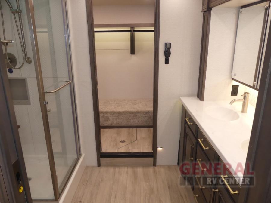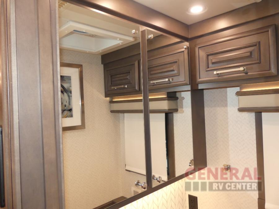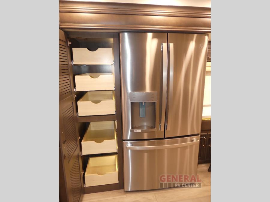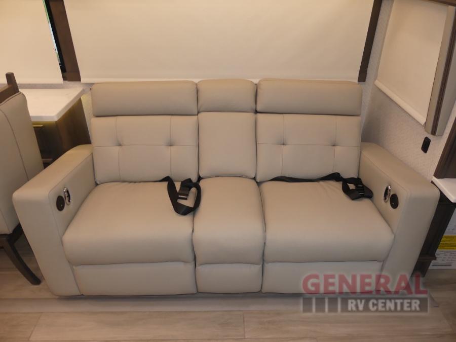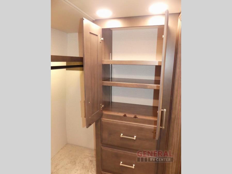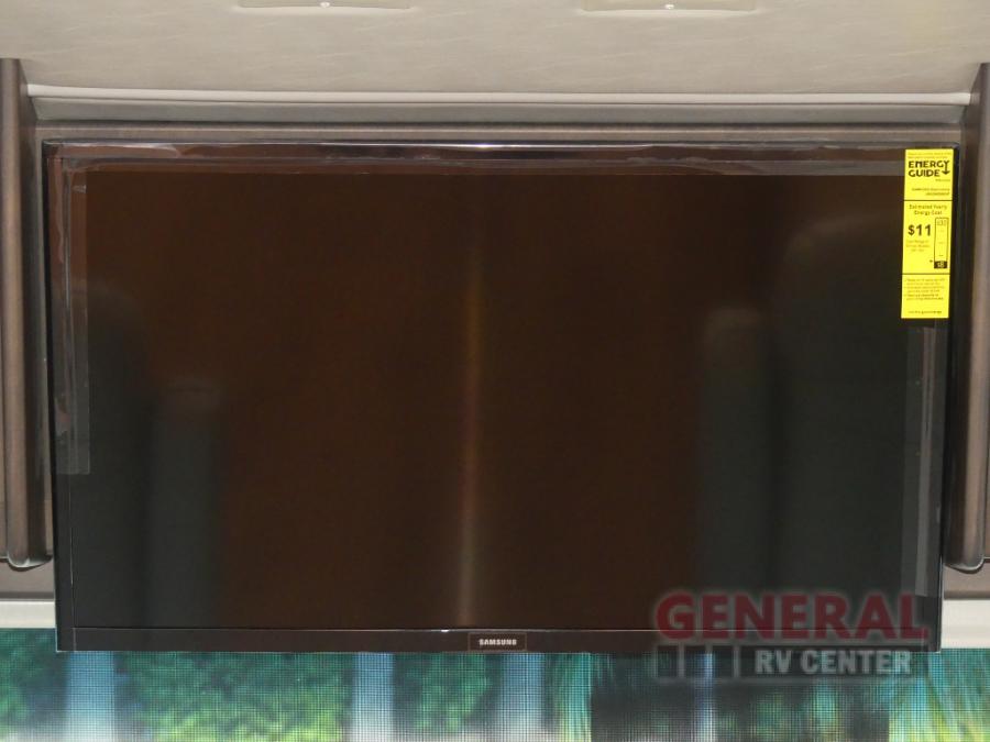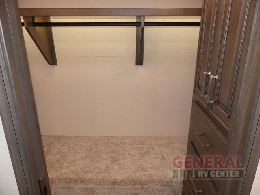If you're looking for more space for your things, you're going to love this coach with a large walk-in closet in the rear bathroom! There are two storage cabinets in the closet, plus a Splendide stackable washer and dryer for convenience. The master bedroom includes a king bed slide out for comfort, and any guests you have can sleep on the hide-a-bed sofa in the main living area. You'll also find power theater seating here across from the 50" TV on lift, plus a free-standing dinette table. This Aspire kitchen includes everything you need to make home cooked meals each day, including a two burner induction cooktop, a convection microwave, plus a stainless steel residential refrigerator for perishables. After your meal is cleaned up, you may want to head outdoors to relax under the power awnings and enjoy the outside entertainment center with a 43" TV!