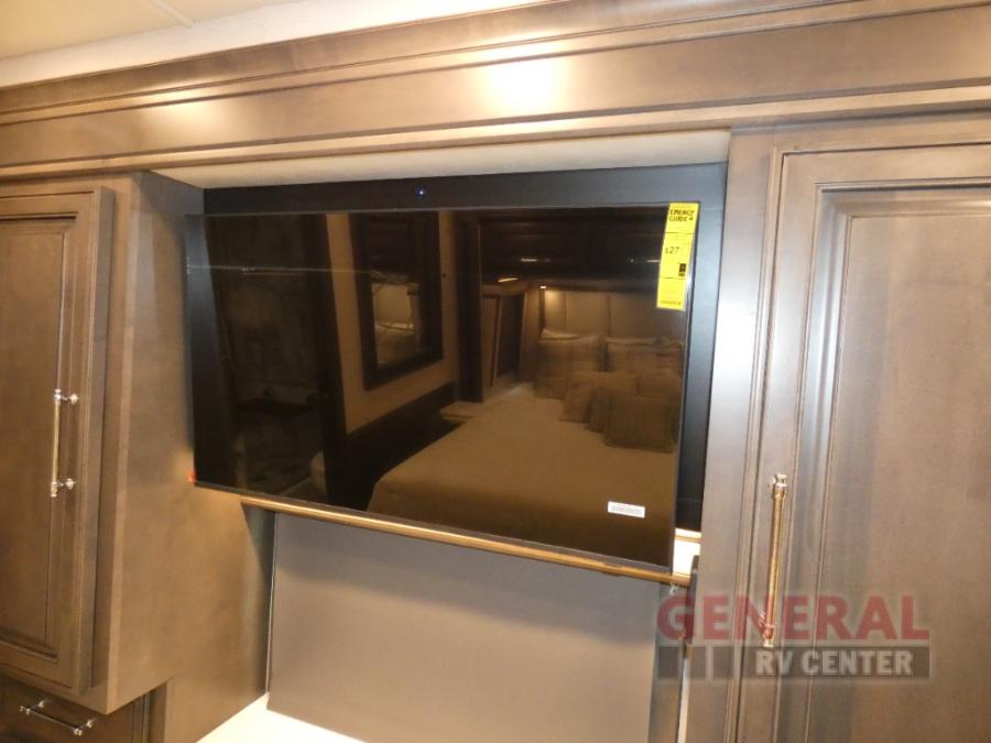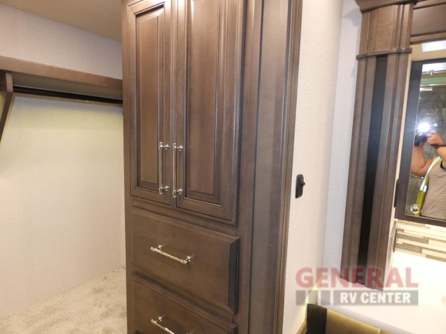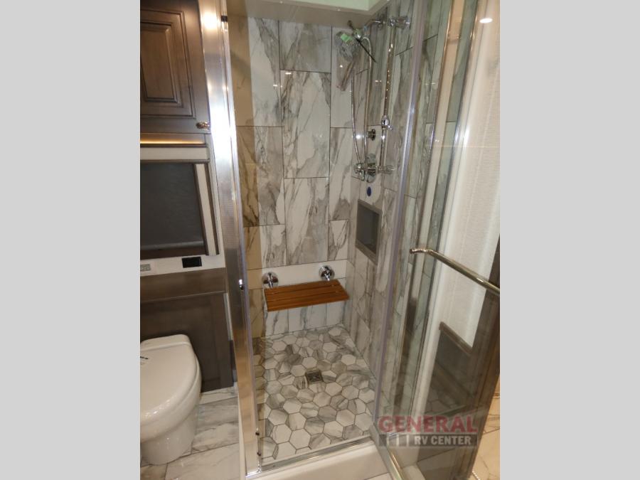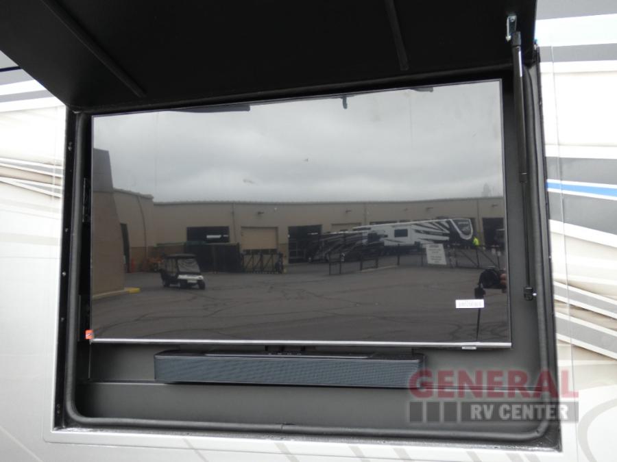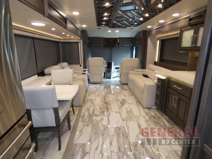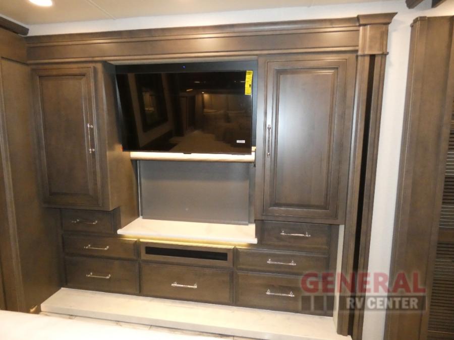 If you've been looking to upgrade your motorhome, this Cornerstone will be the perfect choice. There is a bath and a half, four slides, and sleeping space for four. Once you arrive at the campground, relax on the power theatre seating that is directly across from the 50" TV on lift. You can play a game at the free-standing dinette, or you may just want to head outside since there is an outside entertainment center. The master suite includes a king bed slide out, dual wardrobes, plus your own 43" TV. And check out the full rear bath that includes a rear walk-in wardrobe with plenty of storage space and a washer and dryer.