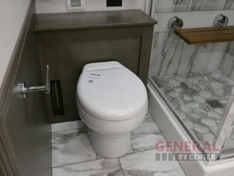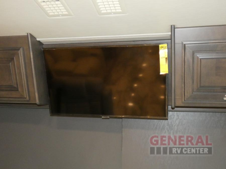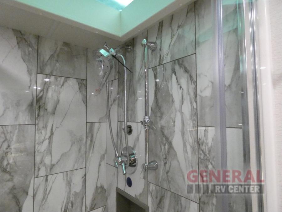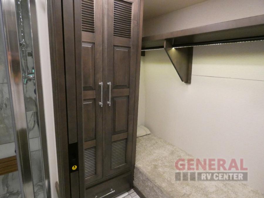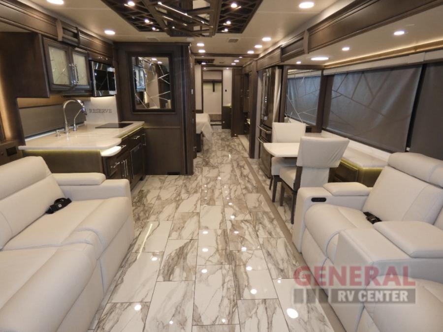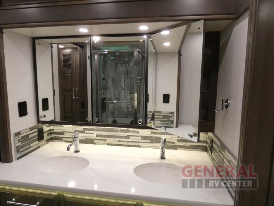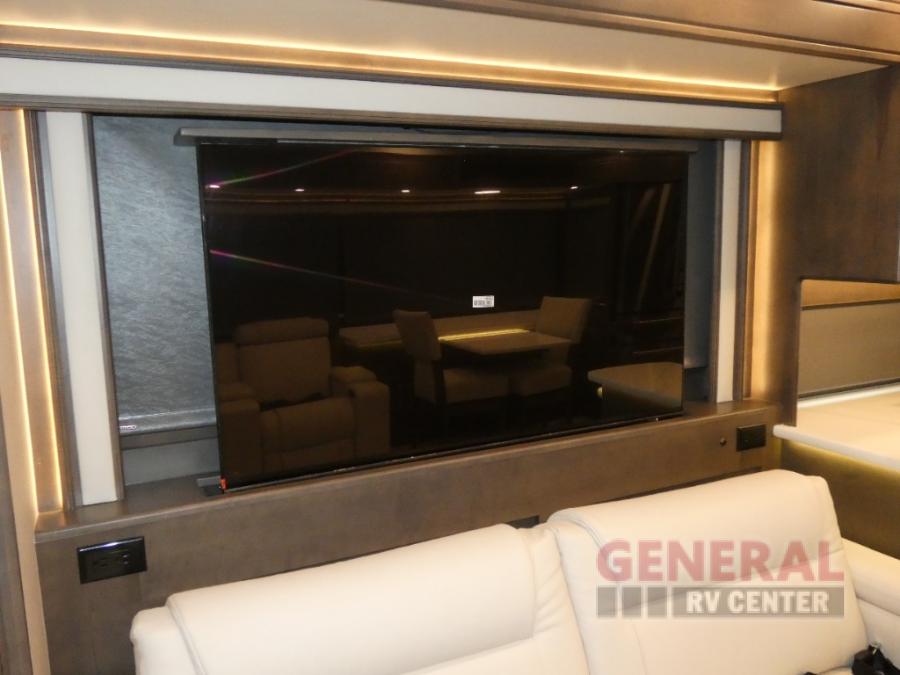 If you've been looking to upgrade your motorhome, this Cornerstone will be the perfect choice. There is a bath and a half, four slides, and sleeping space for four. Once you arrive at the campground, relax on the power theatre seating that is directly across from the 50" TV on lift. You can play a game at the free-standing dinette, or you may just want to head outside since there is an outside entertainment center. The master suite includes a king bed slide out, dual wardrobes, plus your own 43" TV. And check out the full rear bath that includes a rear walk-in wardrobe with plenty of storage space and a washer and dryer.