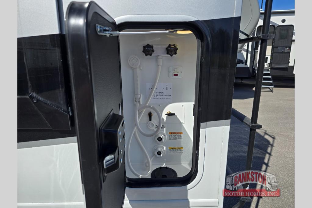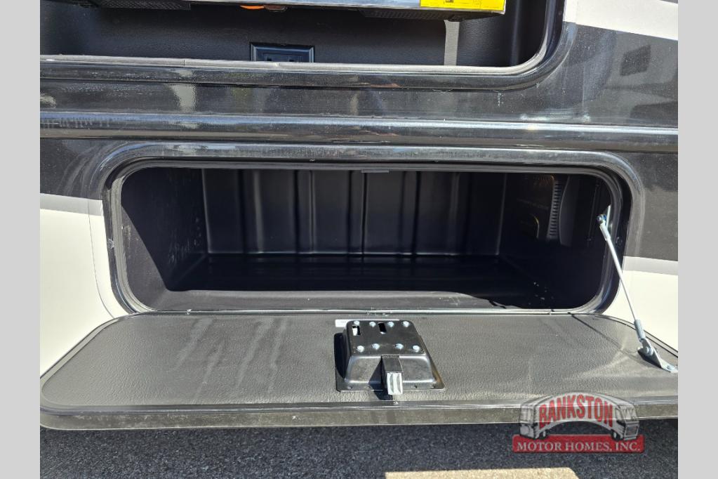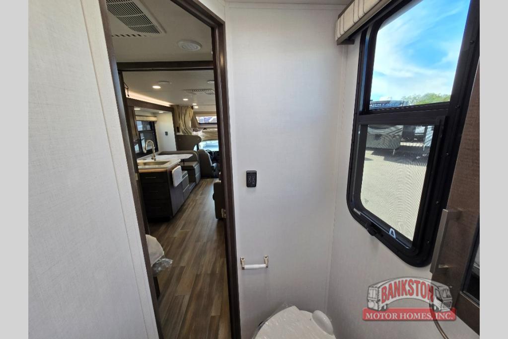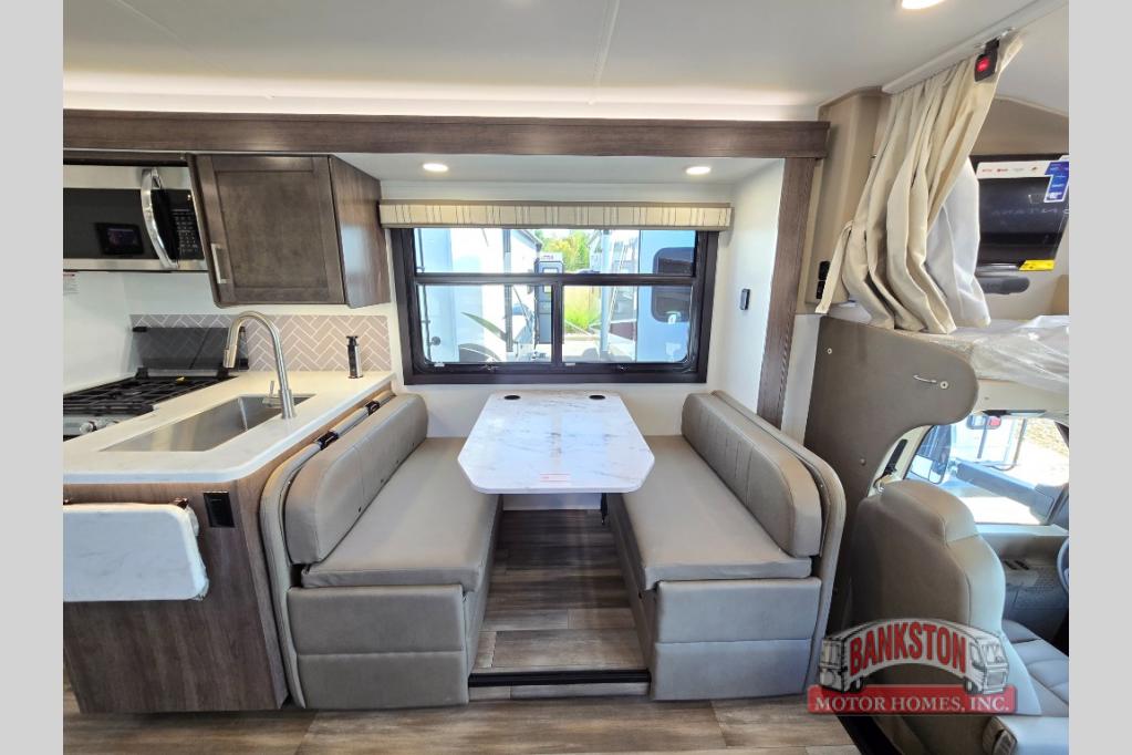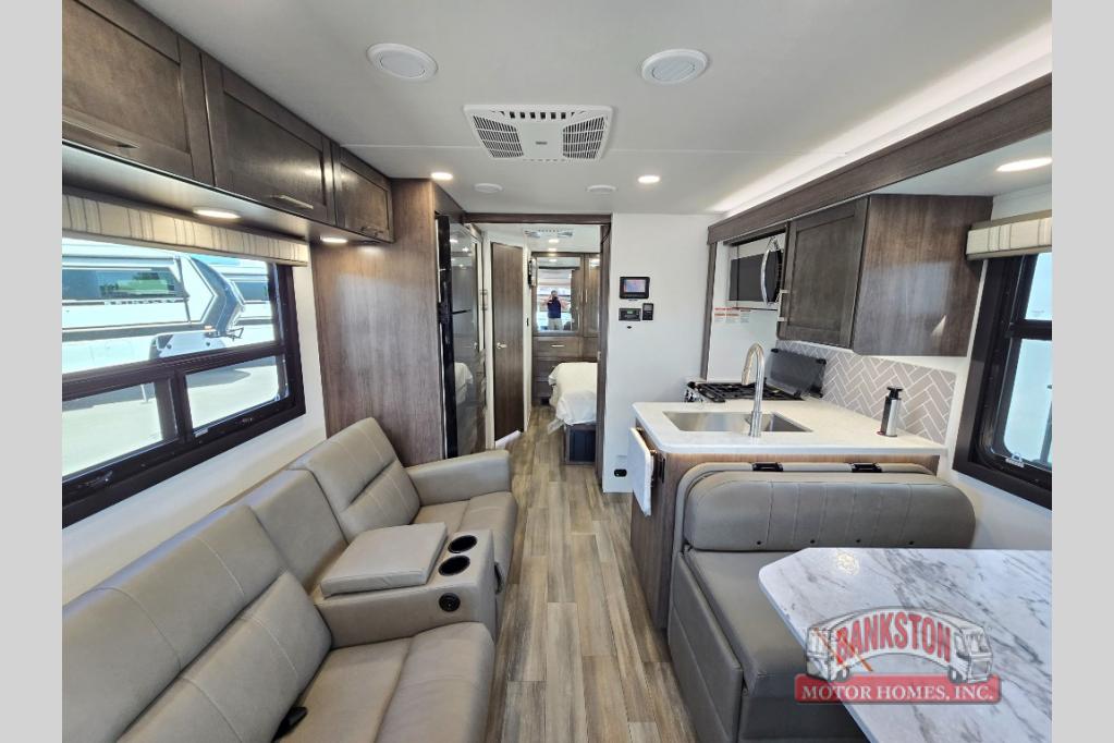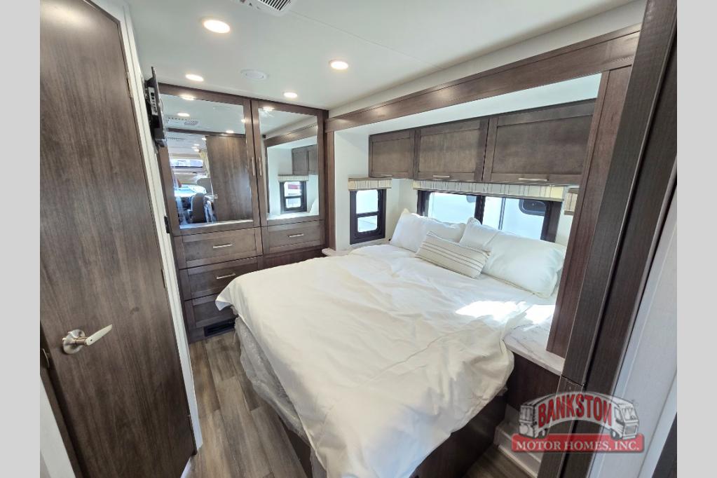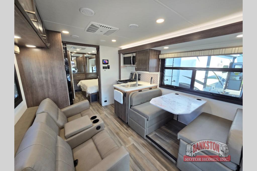 You can bring a few guests to join in on the fun with this motorhome! The bunk over cab and 66" x 76" king bed offer comfortable places to sleep, plus you can transform the booth dinette and the sofa into extra sleeping spaces if needed. Everyone can freshen up each morning with the 30" x 36" shower in the rear corner bathroom, and keep their bellies full with a Furrion all-in-one cooktop and oven plus a residential microwave. There is even a countertop extension to make meal prepping easier. Take the fun outside and watch movies on the exterior LED HD Smart TV while staying protected by the 18' electric awning with LED lights!