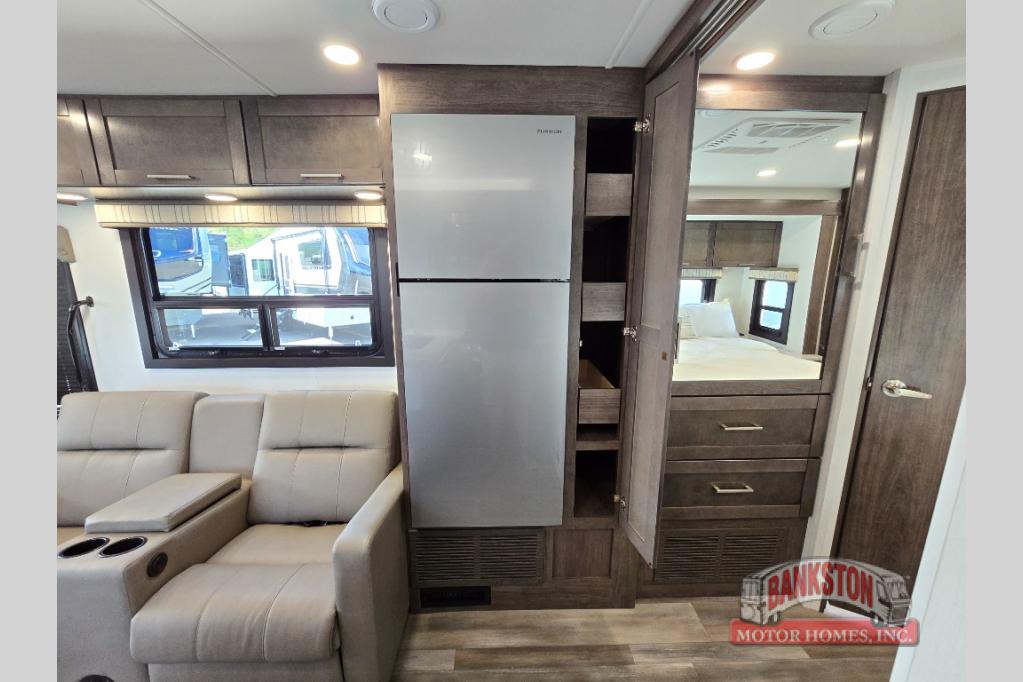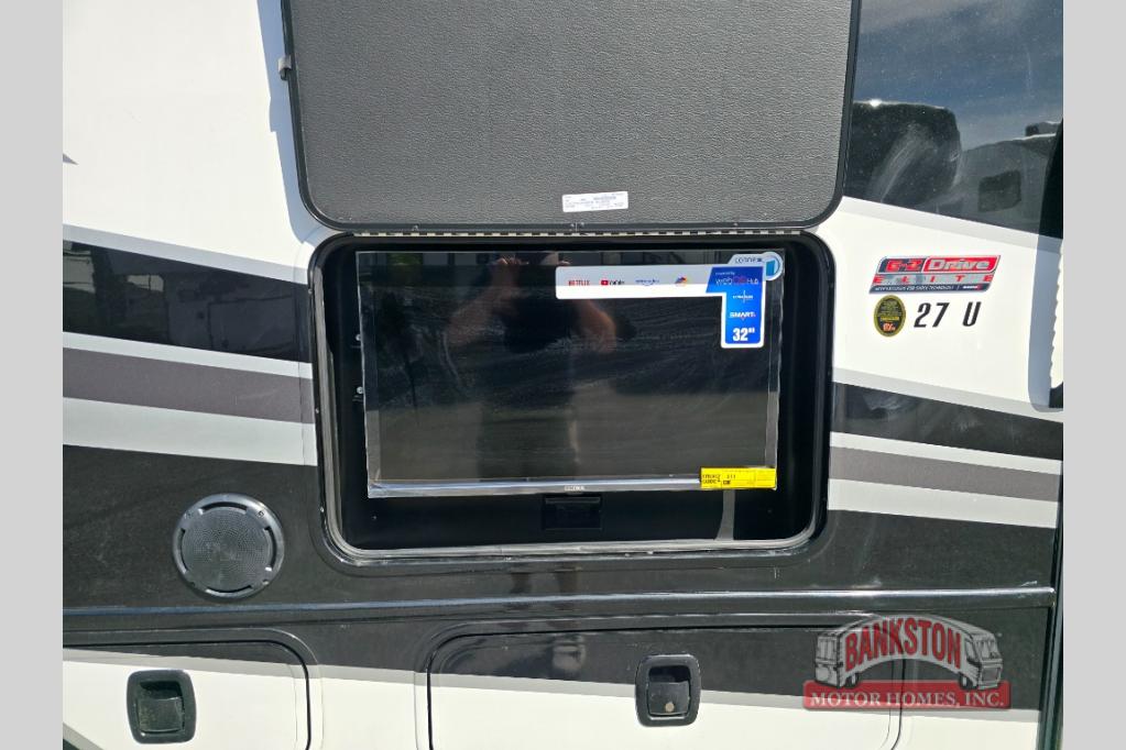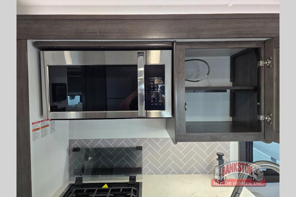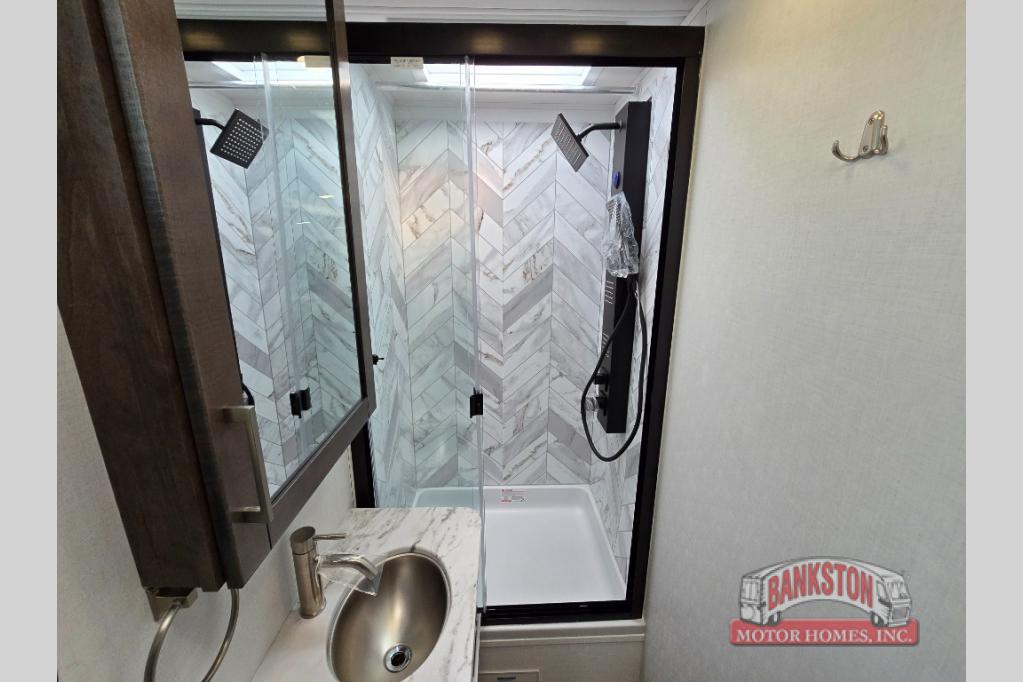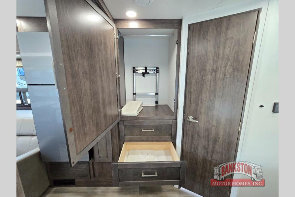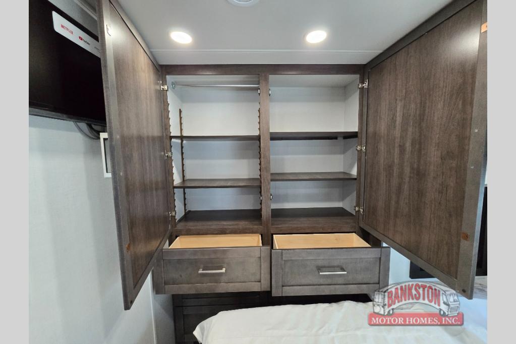 You can bring a few guests to join in on the fun with this motorhome! The bunk over cab and 66" x 76" king bed offer comfortable places to sleep, plus you can transform the booth dinette and the sofa into extra sleeping spaces if needed. Everyone can freshen up each morning with the 30" x 36" shower in the rear corner bathroom, and keep their bellies full with a Furrion all-in-one cooktop and oven plus a residential microwave. There is even a countertop extension to make meal prepping easier. Take the fun outside and watch movies on the exterior LED HD Smart TV while staying protected by the 18' electric awning with LED lights!