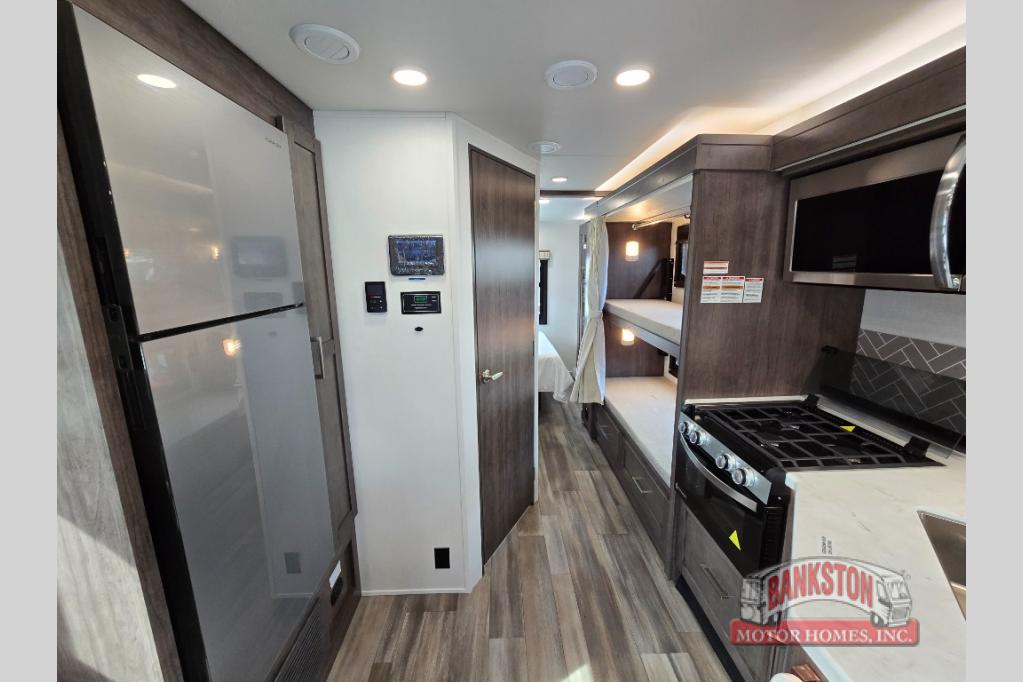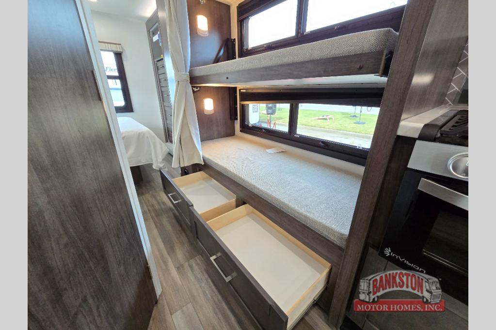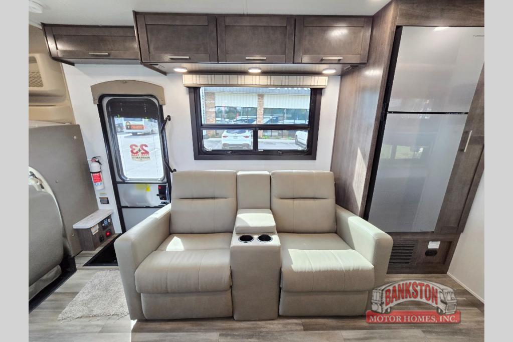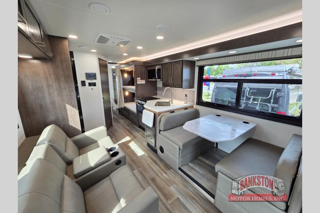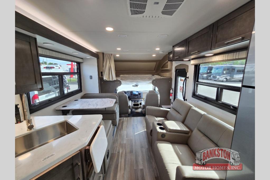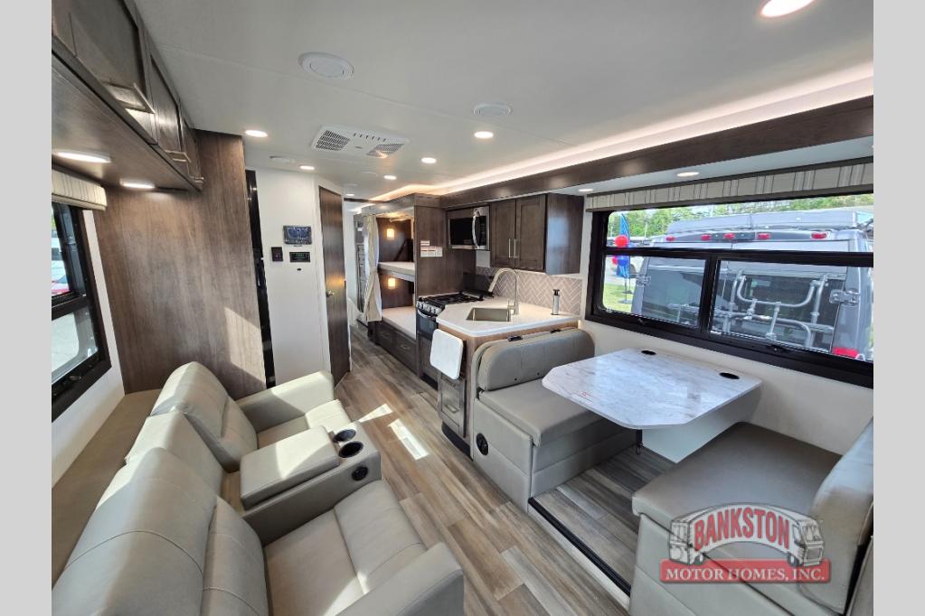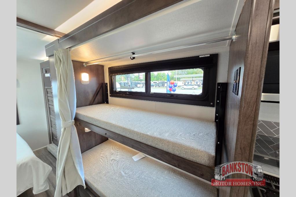 The whole family can travel together in this motorhome! The kiddos can sleep on the set of bunk beds with tablet holders and you can sleep on the 60" x 74" queen bed in the rear private bedroom. Everyone can easily access the dual entry bathroom to freshen up in the 32" radius shower each morning. Cook up delicious meals on the Furrion all-in-one cooktop, then head to the booth dinette which can also transform into an extra sleeping space. You can take an afternoon nap on the sofa or head outdoors to watch the big game at the exterior LED HD Smart TV underneath the 18' electric awning with LED lights to highlight the good times!