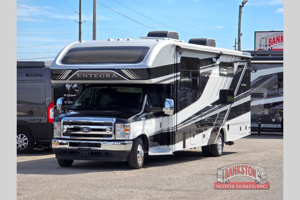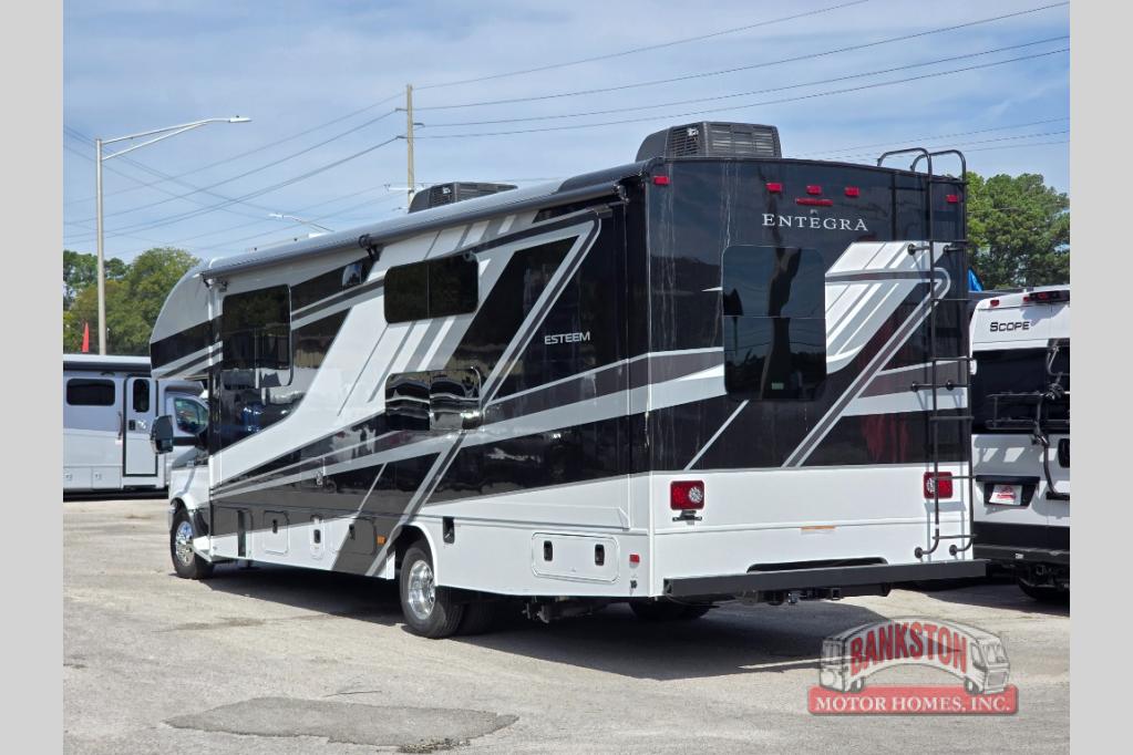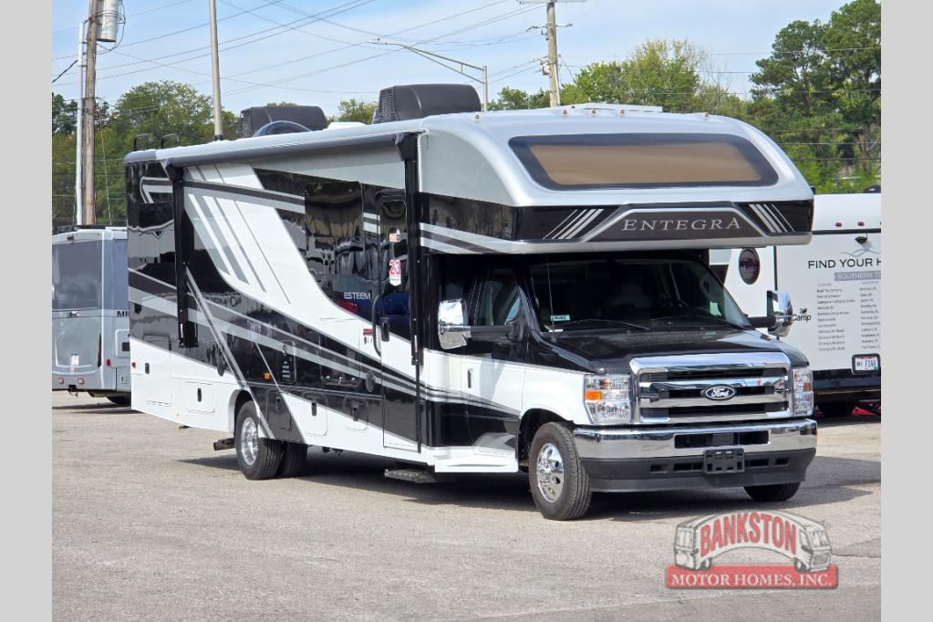 Make one of these Entegra Coach Esteem Class C gas motorhomes your own! The interior design includes solid-surface countertops that pair well with the many technological upgrades. The fully custom-molded ABS surround in the cab area features its signature panoramic window and power shade for a beautiful view while you drive and provide privacy at night. They also come with E-Z Drive Elite which has a computer-balanced driveshaft, Koni FSD shocks, Hellwig helper springs, and a heavy-duty rear stabilizer bar for a smooth ride. Automatic leveling jacks will make set-up a breeze and the electric awning with LED lights will create an outdoor living space where you can relax after unpacking. Inside, you'll enjoy hardwood cabinet doors and drawer fronts, blackout night roller shades, and high-intensity recessed LED ceiling lights to keep your space well lit. There is also a JBL audio system and a BMPRO total coach control system to easily manage your unit's functions!
