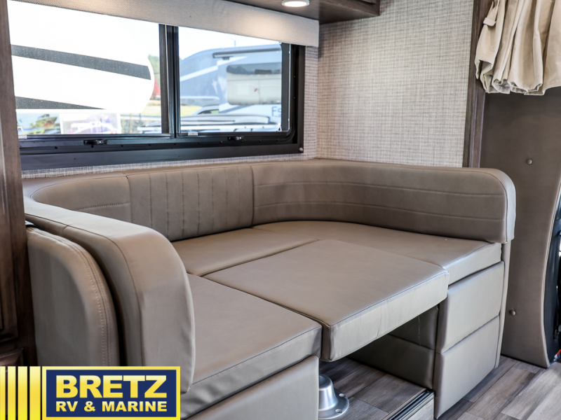 Pack your bags and head to your favorite camping destination in this cozy coach! You can sleep four to six between the RV queen bed, U-shaped dinette, and overhead bunk with a 750 lb. capacity. And if you don't need the extra sleeping space, just choose the entertainment center with overhead storage option in place of the bunk, and the theater seating option in place of the dinette! You can prepare meals each day on the two burner drop-in cooktop or in the convection microwave, and there is a 10 cu. ft. 12V refrigerator for perishables. A full bath, complete with a foot flush toilet, powered roof vent, and shower skylight will let you stay clean throughout each trip. You will also find plenty of storage space, including a wardrobe by the bed, a pantry, plus overhead cabinets!
