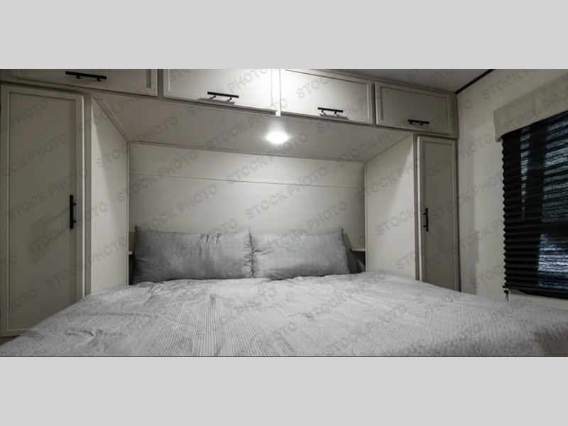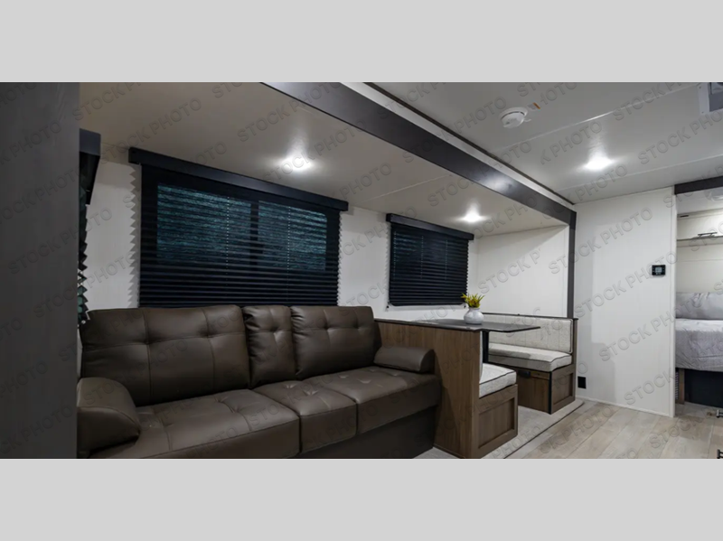 You'll appreciate the added space in this travel trailer thanks to the large slide out! The booth dinette and sofa are found here, and there is a moveable storage ottoman for extra blankets or board games. You'll have your own space up front in the private bedroom, complete with a camp king bed and storage for your things, while your guests take the double-size bunk beds towards the back. The chef of your group will find a three-burner cooktop and a built-in convection microwave with an air fryer to cook meals, plus there is a 12V refrigerator and large hidden pantry for food storage. This unit also includes a power awning outdoors and an outside refrigerator to keep cold drinks close by.