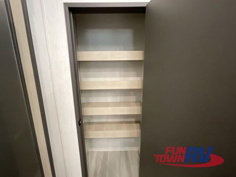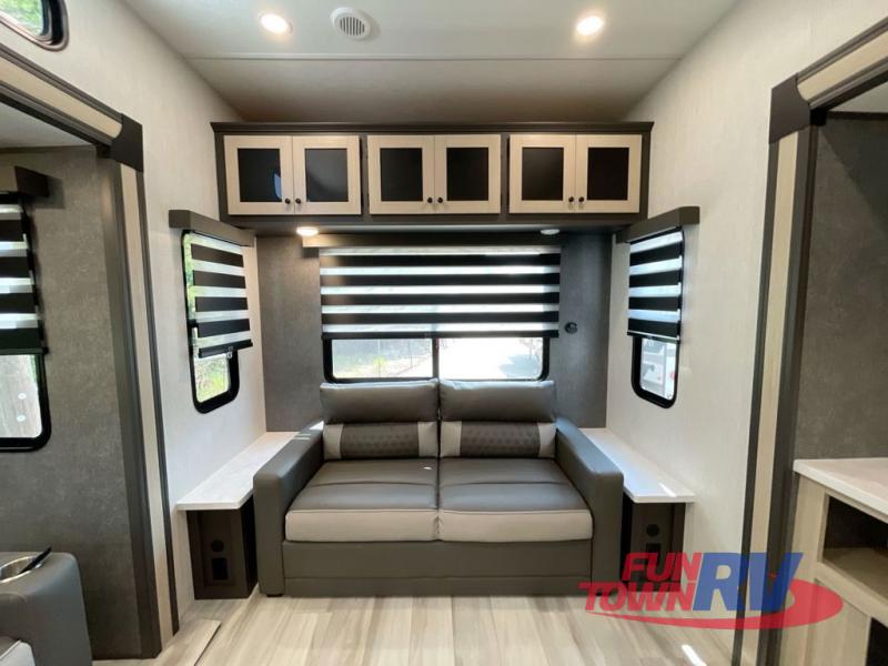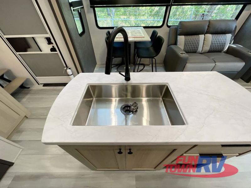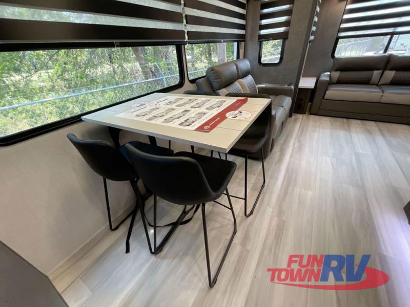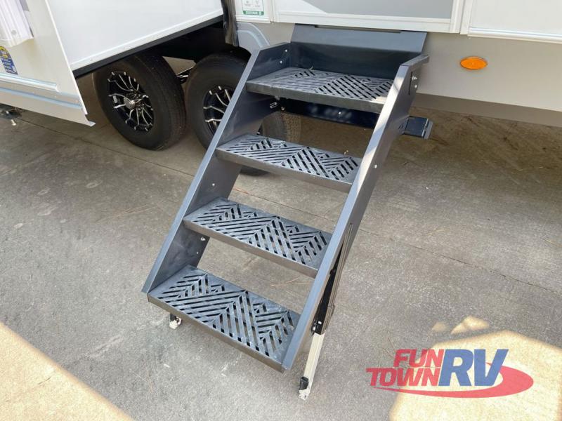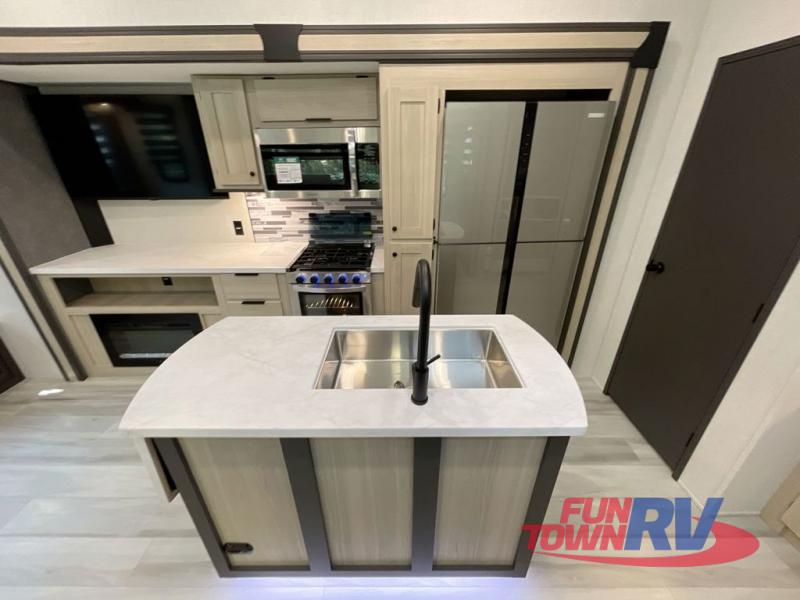 Imagine waking up every morning in a luxurious RV that feels like home. The rear living room is a cozy retreat, perfect for relaxing and unwinding after a long adventure day. With a comfortable hide-a-bed sofa, entertainment center, cozy fireplace, theater seating, and overhead cabinets, you'll have everything you need to enjoy quality time with family and friends. The kitchen is perfect for fulfilling all your cooking cravings, featuring a kitchen island with flip-up extension for added convenience when cooking, a microwave, pantry, and 12V refrigerator. There is also a hi-top table and chairs, coffee bar, and walk-in pantry. The full bathroom comes with a linen closet and all the amenities you need to freshen up and feel at home. And with a spacious shower and plenty of storage, you'll have everything you need to start your day off right. The front bedroom is the perfect space to recharge energy, featuring a comfortable king bed, dresser, walk-in wardrobe, and washer and dryer prep for all your laundry needs. Outside, you'll appreciate the pass-through storage for all your gear and toys, as well as the 15' and 11' awnings for shade and protection.