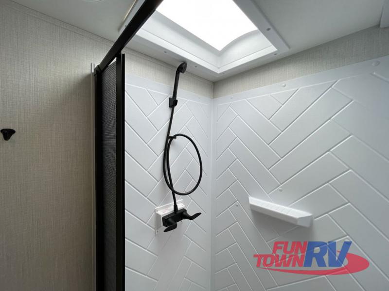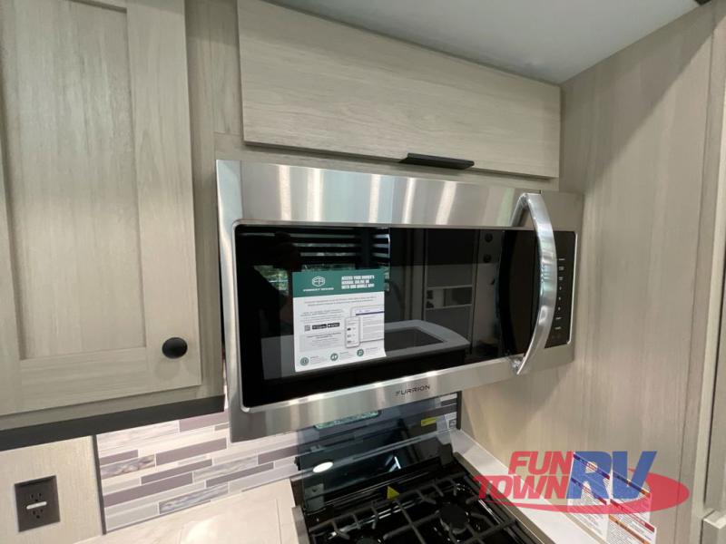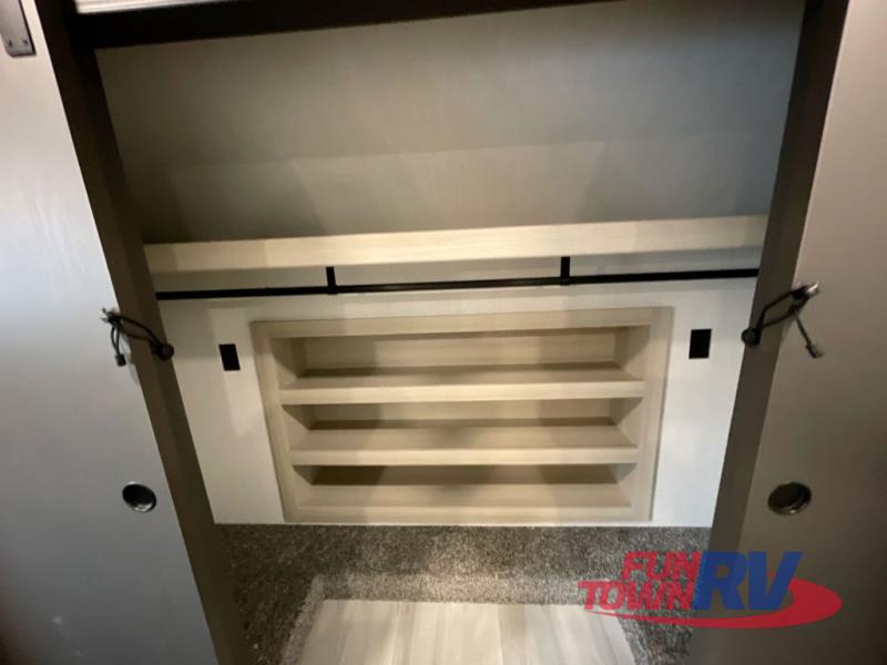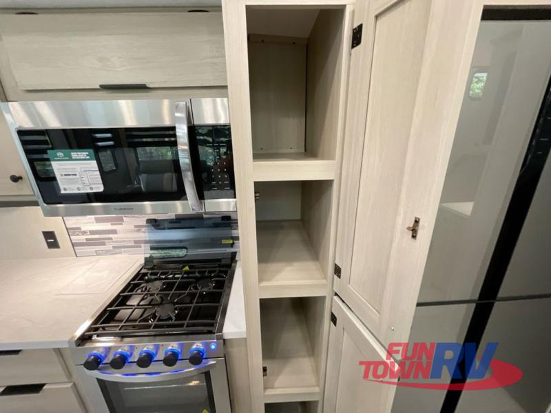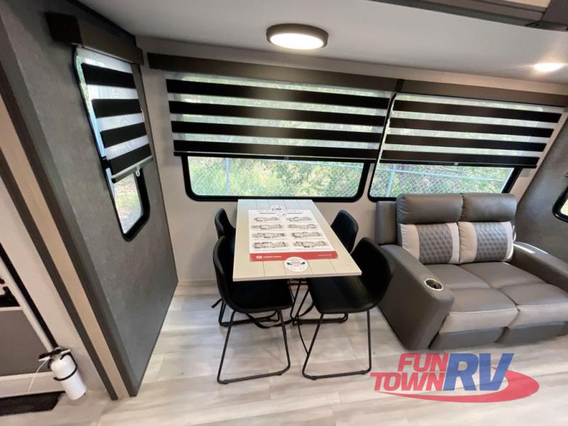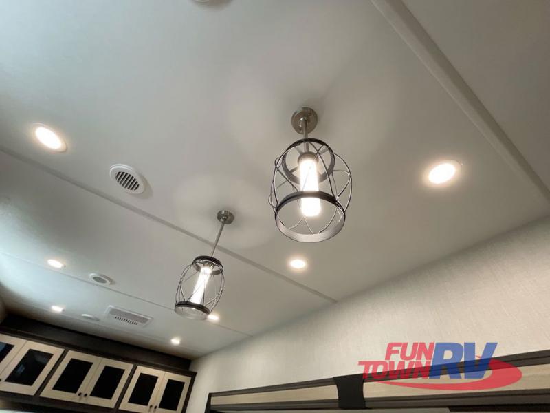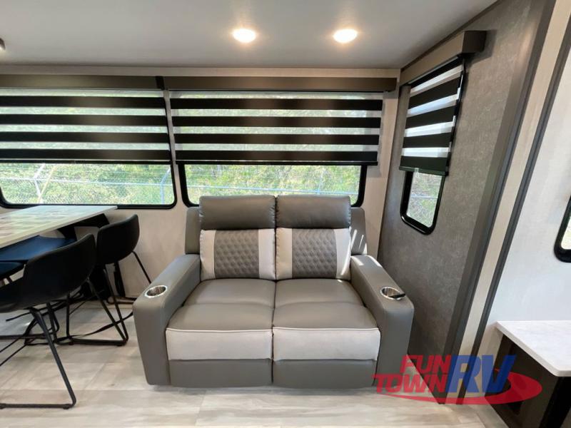 Imagine waking up every morning in a luxurious RV that feels like home. The rear living room is a cozy retreat, perfect for relaxing and unwinding after a long adventure day. With a comfortable hide-a-bed sofa, entertainment center, cozy fireplace, theater seating, and overhead cabinets, you'll have everything you need to enjoy quality time with family and friends. The kitchen is perfect for fulfilling all your cooking cravings, featuring a kitchen island with flip-up extension for added convenience when cooking, a microwave, pantry, and 12V refrigerator. There is also a hi-top table and chairs, coffee bar, and walk-in pantry. The full bathroom comes with a linen closet and all the amenities you need to freshen up and feel at home. And with a spacious shower and plenty of storage, you'll have everything you need to start your day off right. The front bedroom is the perfect space to recharge energy, featuring a comfortable king bed, dresser, walk-in wardrobe, and washer and dryer prep for all your laundry needs. Outside, you'll appreciate the pass-through storage for all your gear and toys, as well as the 15' and 11' awnings for shade and protection.