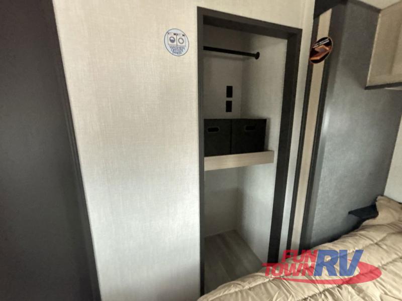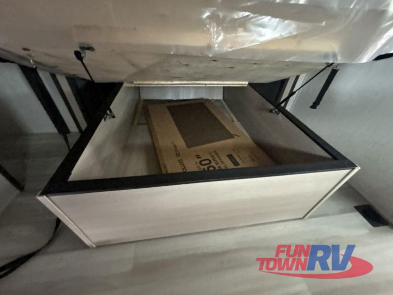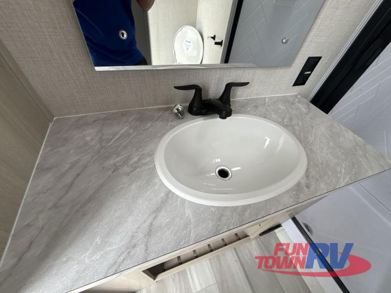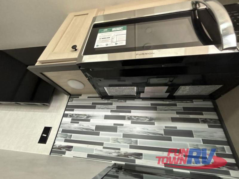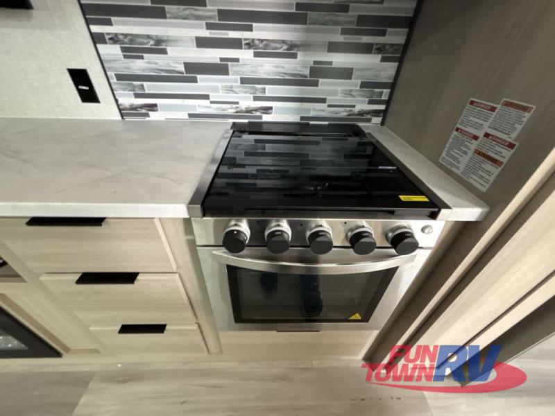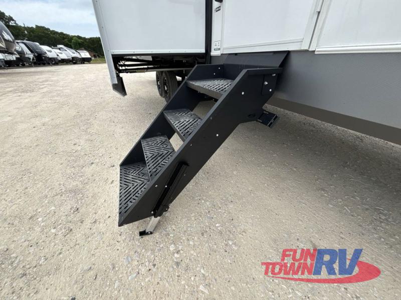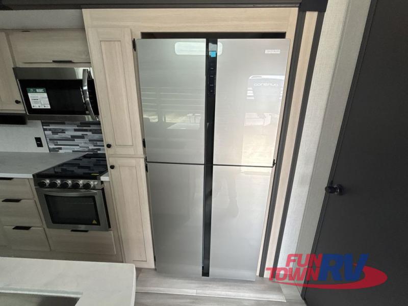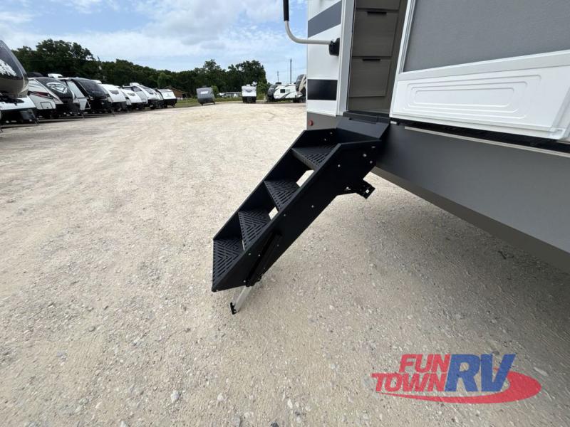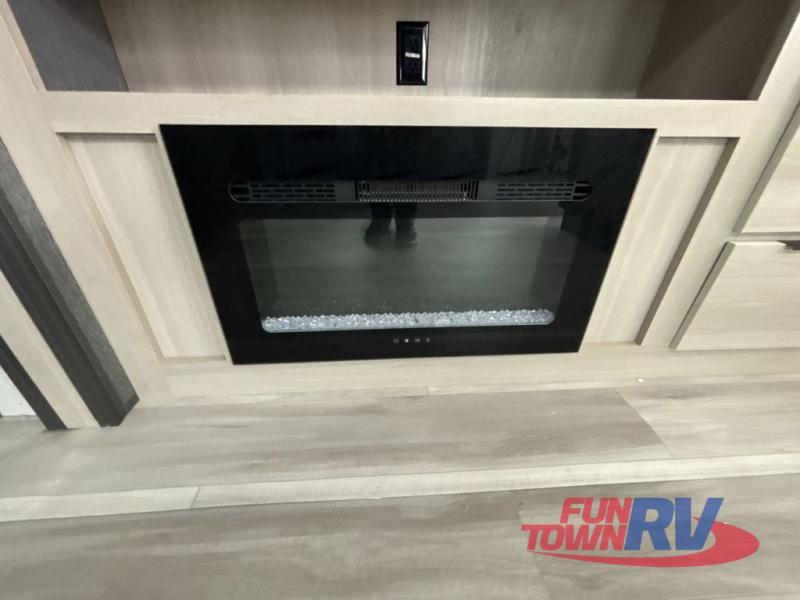 If you're ready for fun, look for further than this dual entry Cardinal fifth wheel! It will be so easy to travel with friends and family since there is a master bedroom with a king bed and a full rear bath, plus a front bunkhouse suite with bunk beds, a queen bed, and a second full bath! The chef of your crew can whip up breakfast in the morning on the 21" 2-in-1 oven range or in the over-the-range microwave. There is also a 16 cu. ft. 12V refrigerator and walk-in pantry for food storage! The theater seating and table with chairs sit across from the entertainment center and fireplace for easy viewing in the evening, or you may just find yourselves outdoors visiting with campground neighbors!