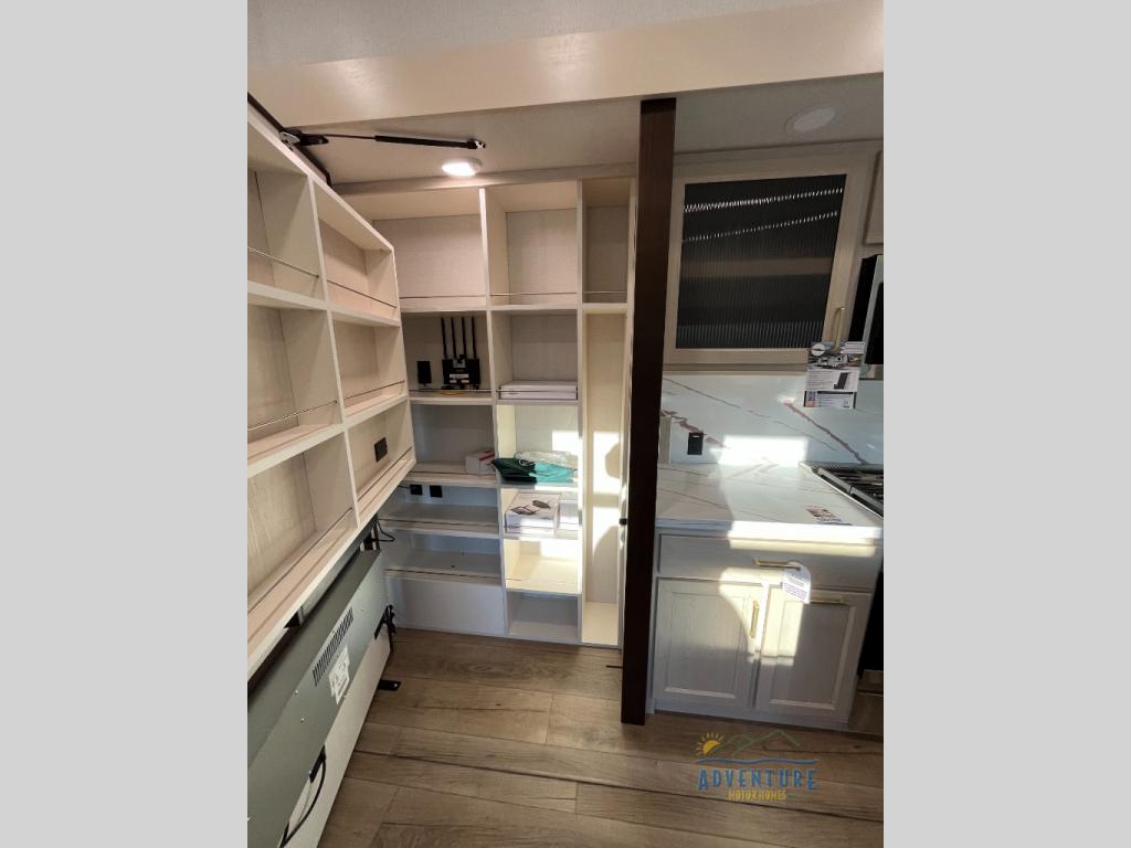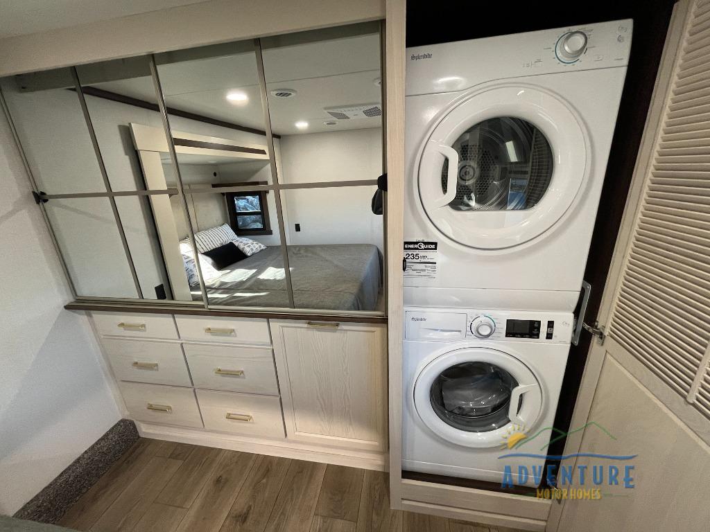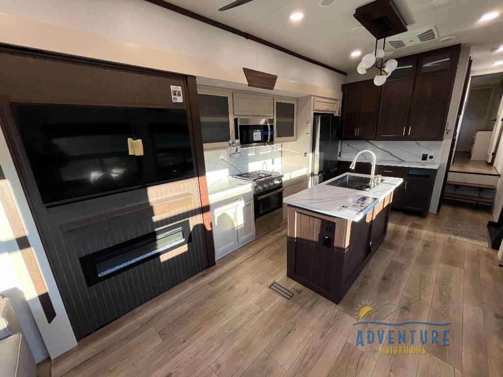 You can bring a guest or two to join in on the fun with this fifth wheel! The rear living area has a hide-a-bed sofa and power theater seating across from the swivel mounted TV and fireplace with a hidden Murphy pantry behind. The chef can prepare their best meals with the kitchen island, and your guests will love the fold-down breakfast counter. The full bathroom has a spacious shower with a seat plus a dual sink vanity for convenience. The king bed slide in the front private bedroom welcomes you to enjoy a good night's rest and the front wardrobe has storage shelves and washer/dryer prep if you want the option to wash clothes while you're away from home!
