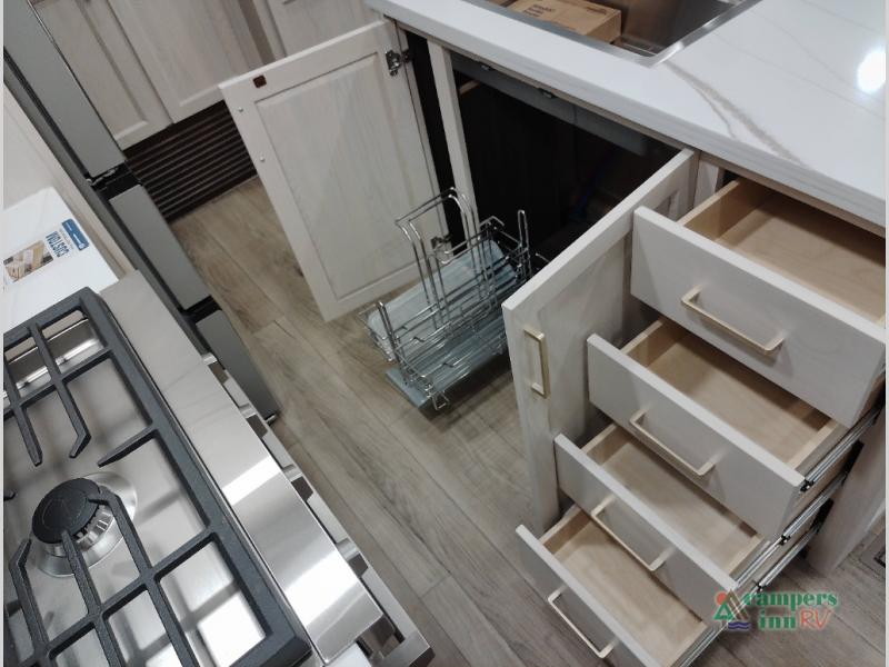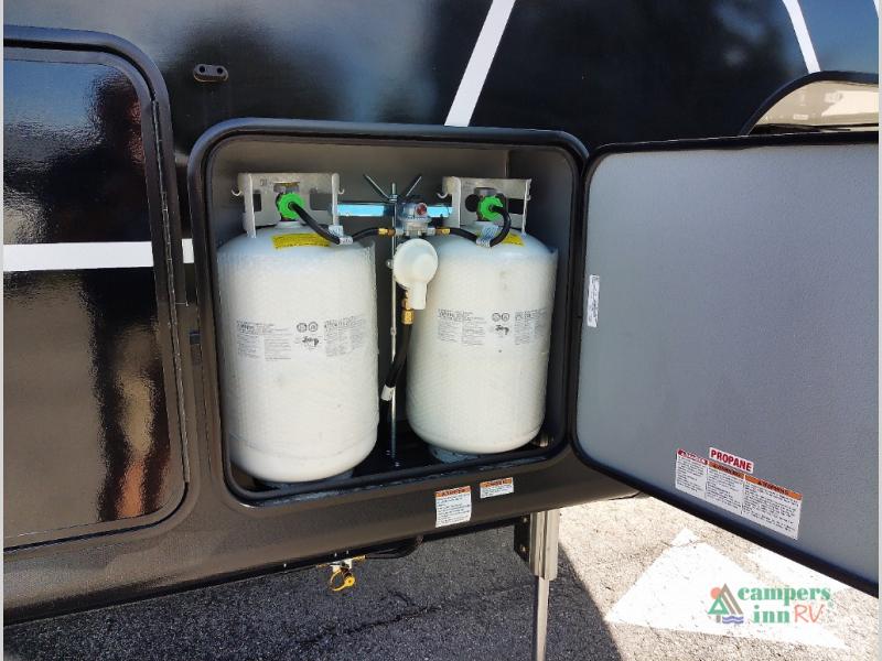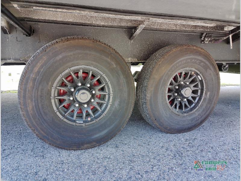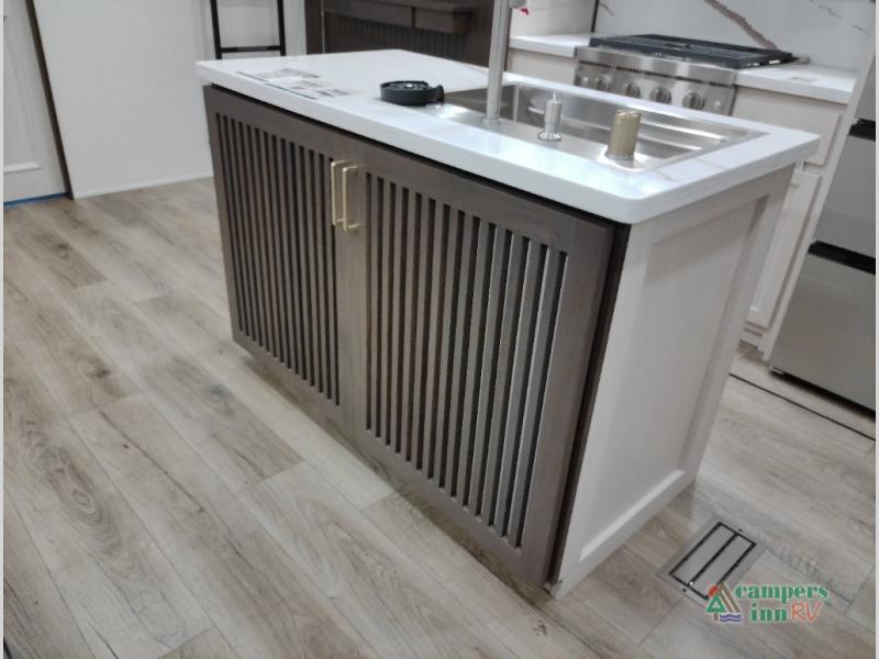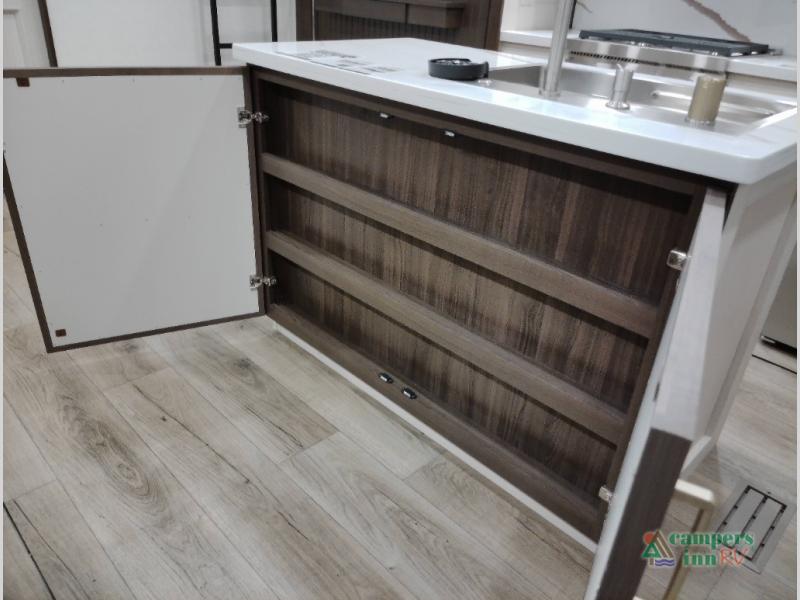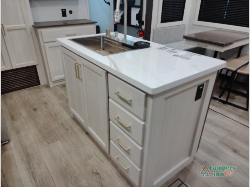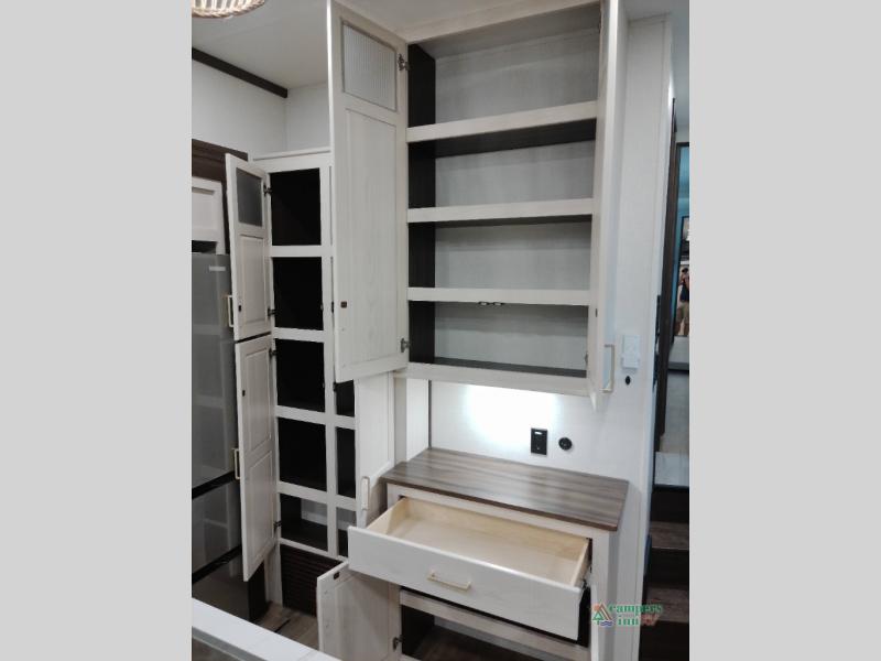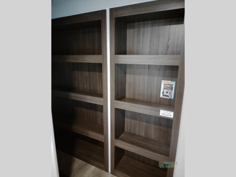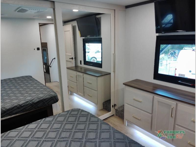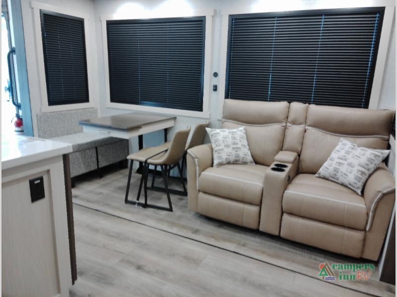 This is the perfect fifth wheel to camp with family or neighbor friends since there are two bedrooms, one of which is a master bedroom with a full rear bath. The second full bath is up front, and both bedrooms include a king bed slide out for added comfort. There is even a loft above the rear bedroom, complete with two bunk mats, two cabinets, and a TV hookup. Everyone can meet in the combined kitchen and living room to enjoy the swivel mounted TV and fireplace across from the theater seating. There is also a wall-mounted dining table with an extension and ottoman.