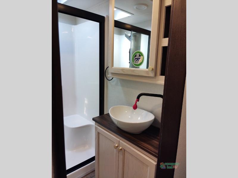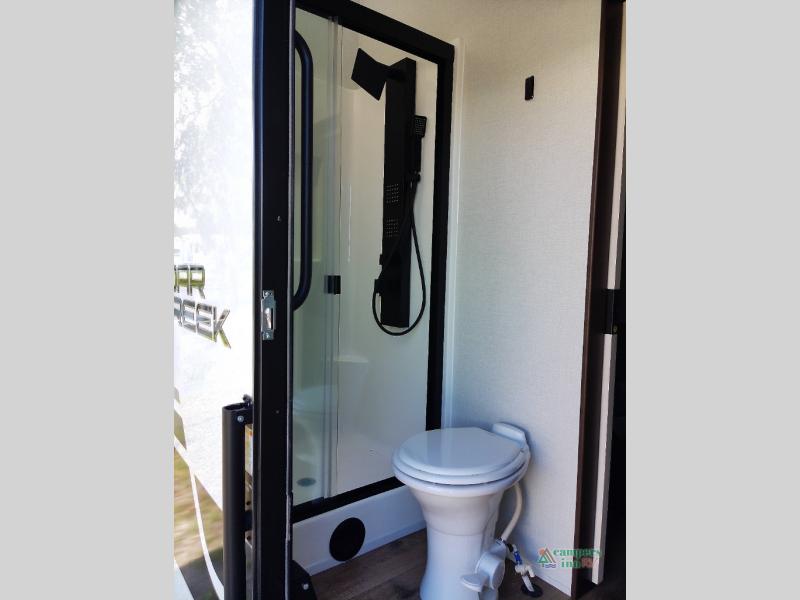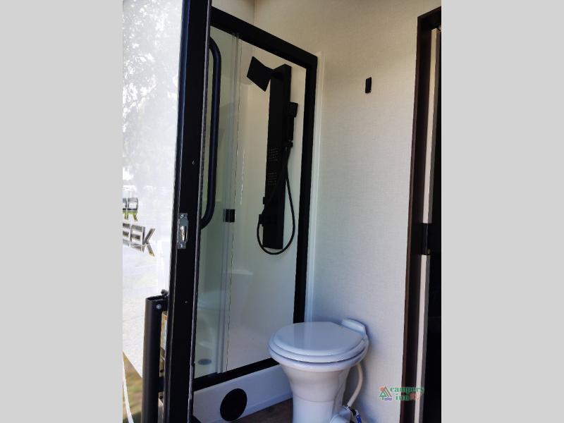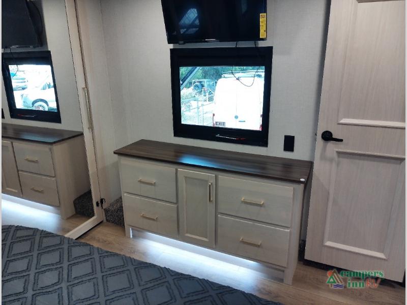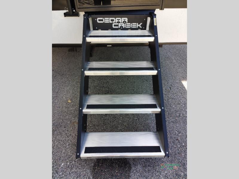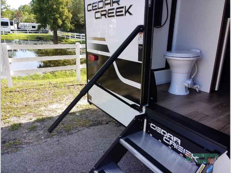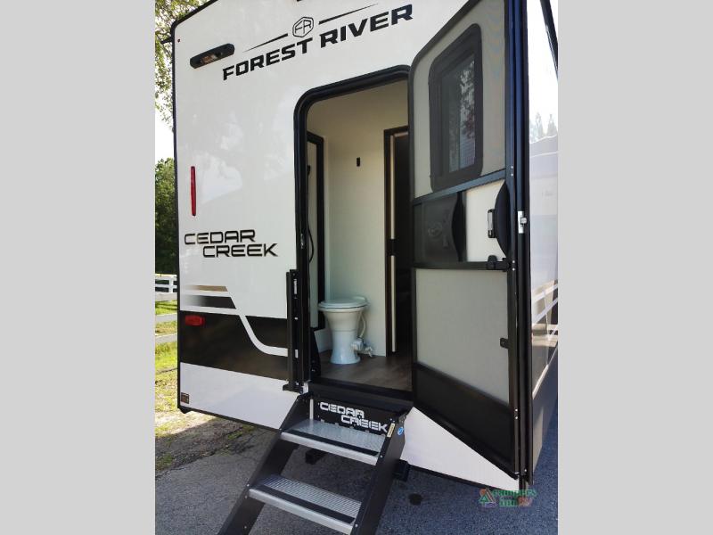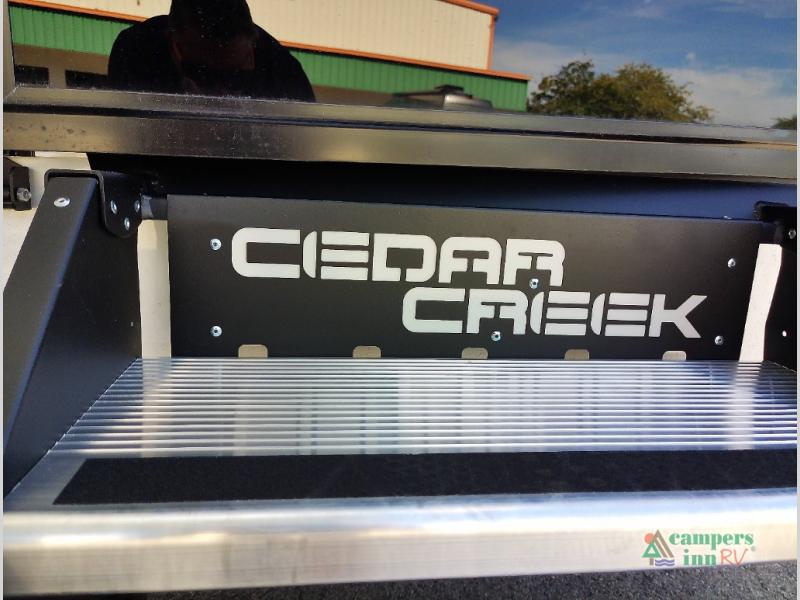 With any Cedar Creek Experience fifth wheel by Forest River, you will bet met with luxury features both inside and out! The True Gelcoat exterior is the best of the best in exteriors and the 3M bonded sidewalls will hold up over years of use. There is also a new 101'' wide-body frame, a Road Warrior suspension, plus a TST tire pressure monitoring system to make towing that much easier. You will find a hidden front storage compartment, along with a 4' x 6' ABS, ribbed, removable underbelly panels, and 6-point hydraulic leveling system, plus many more exterior conveniences. The interior will have you feeling like you haven't left home with vinyl floor coverings, power theater seating with USB ports, a cozy fireplace, vinyl floor covering and the list of comforts goes on! Each model is also pre-wired for satellite to the roof, and you're sure to never go bored with a Smart TV in the bedroom!