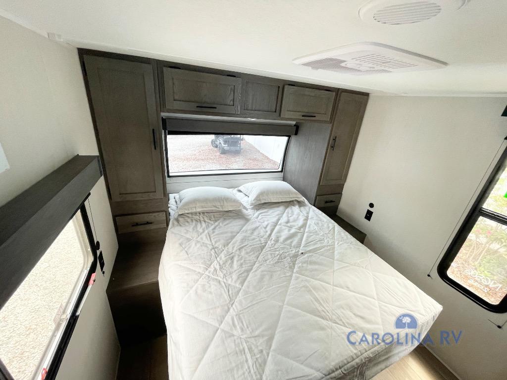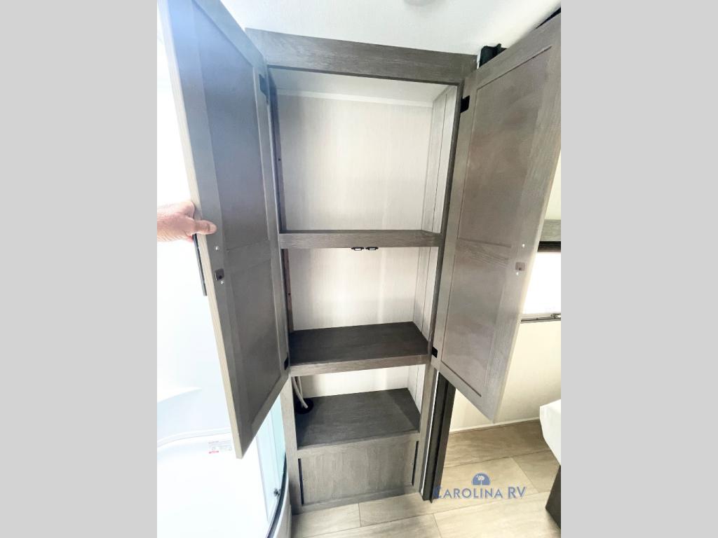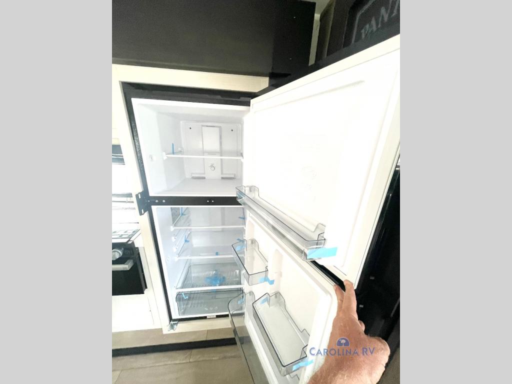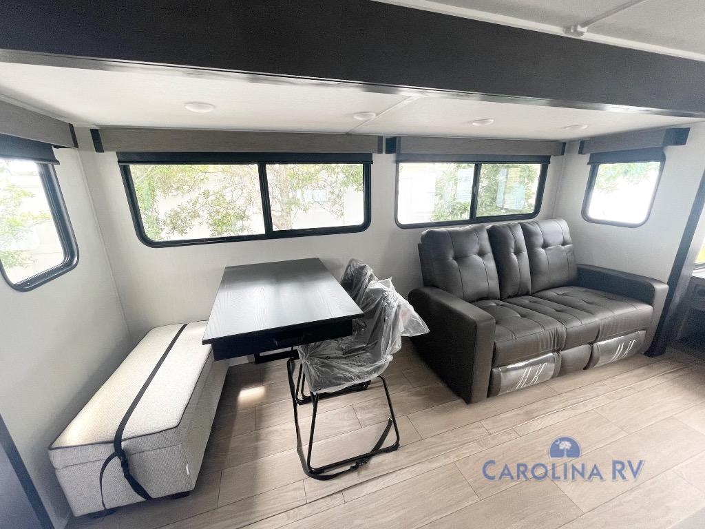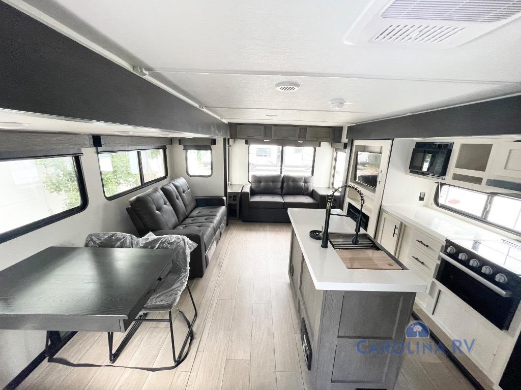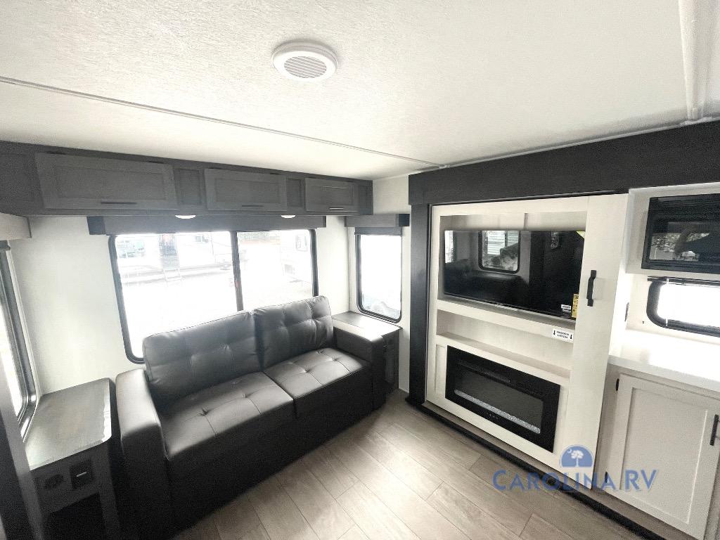 This trailer has it all for maximum comfort and convenience as well as entertainment! The rear living area includes a tri-fold sofa with a rear Pano-Vision window for great views of your campsite, and dual opposing slides widen this area so you can visit with friends. You'll also find theater seating, plus a free-standing table with two chairs and a storage ottoman seat. Enjoy the fireplace on a cool night or when you want a little ambiance while seated inside. Two patio awnings will provide an outdoor living area; just grab your camping chairs from the full pass-through storage. When you want to call it a night, fall quickly to sleep on the queen bed in the front bedroom with easy access to a dual entry bathroom!