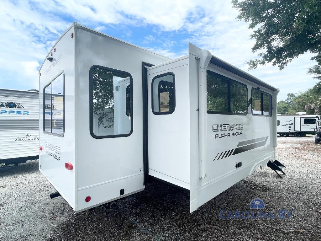With any Cherokee Alpha Wolf travel trailer by Forest River you'll enjoy outstanding amenities, quality construction, and an affordable price. Each model features a "ToughBend" rigid skirt metal design, 5/8" tongue and groove plywood floor decking, and a "SuperTruss" roof structure that will hold up through years of camping memories. There is a pet friendly "clean sweep" floor design with no heat vents indoors, along with a super lumen lighting system, a 15,000 BTU quick cool central air conditioning, and many more comforts. There are many convenient exterior features such as, Leash Latch pet safety technology, an outside shower with hot and cold water, and exterior steps with oversized landing and quick release. The Weather Guard Package will add protection against the elements with an armored underbelly tank enclosure and forced air heat, thermo-control reflective safety glass windows, and upgraded laminated walls with block foam insulation!