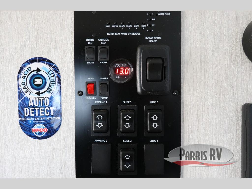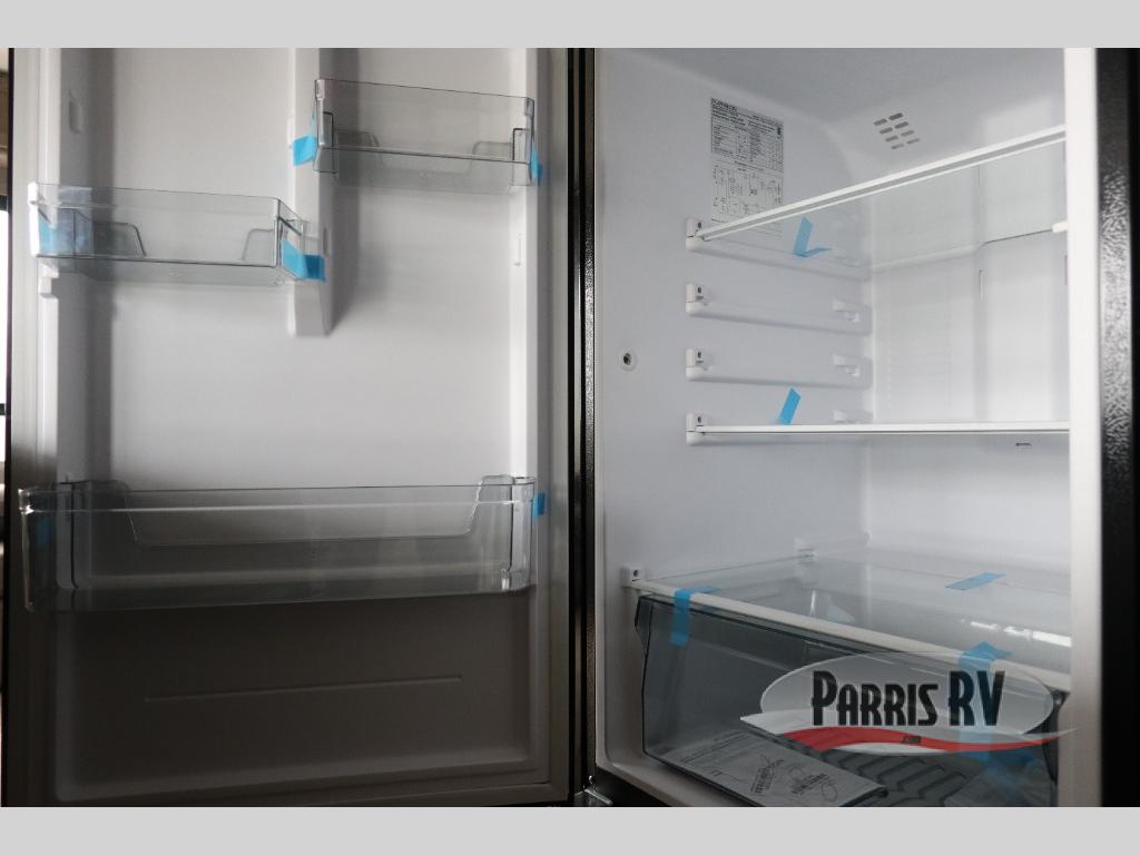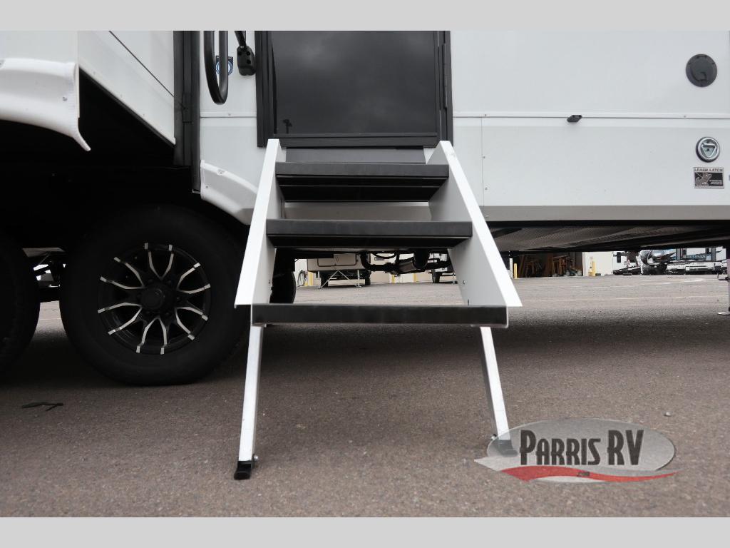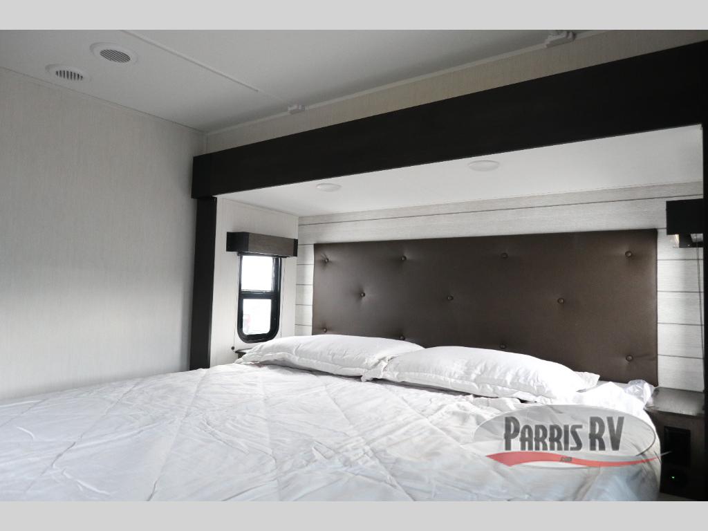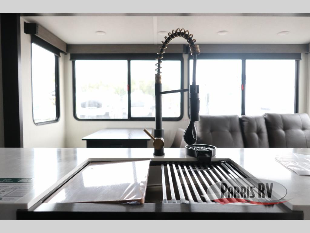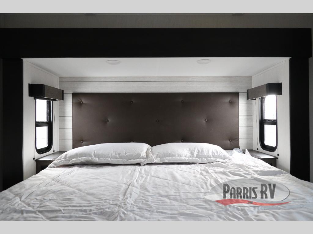 This Cherokee Arctic Wolf fifth wheel is quite extraordinary and accommodating! It has a set of opposing slides in the main living area so you can have more space to sit back on the theater seating and tri-fold sofa. You can switch on the fireplace to add some warmth to this space if it's a cool night. The free-standing table and chairs is going to be great for sitting down to eat a meal together, and there is even a storage ottoman seat for board games or throw blankets. You'll also be able to grab dessert from the large hidden pantry closet to go with your coffee. The private bedroom up front is going to provide great relaxation with its king bed slide. The spacious wardrobe includes washer/dryer prep, and there's even a second fireplace in the bedroom for the ultimate in coziness.