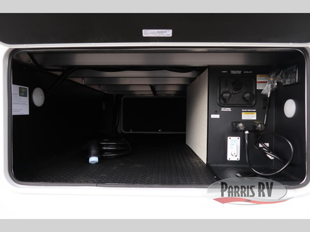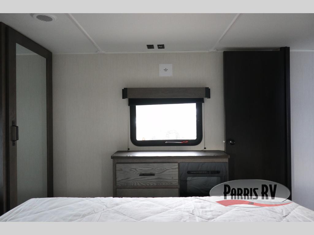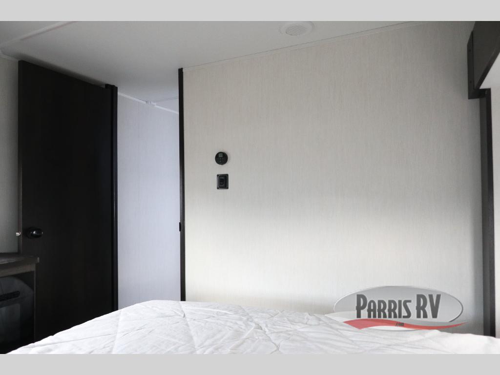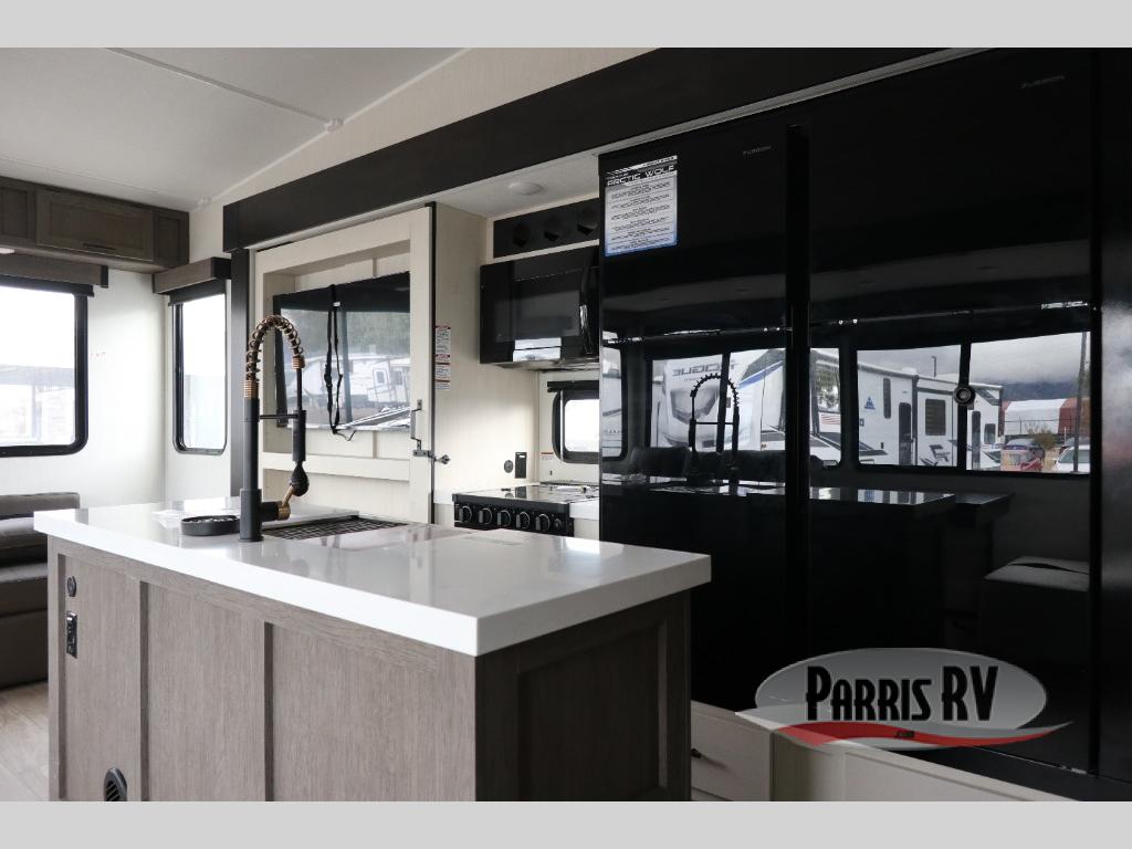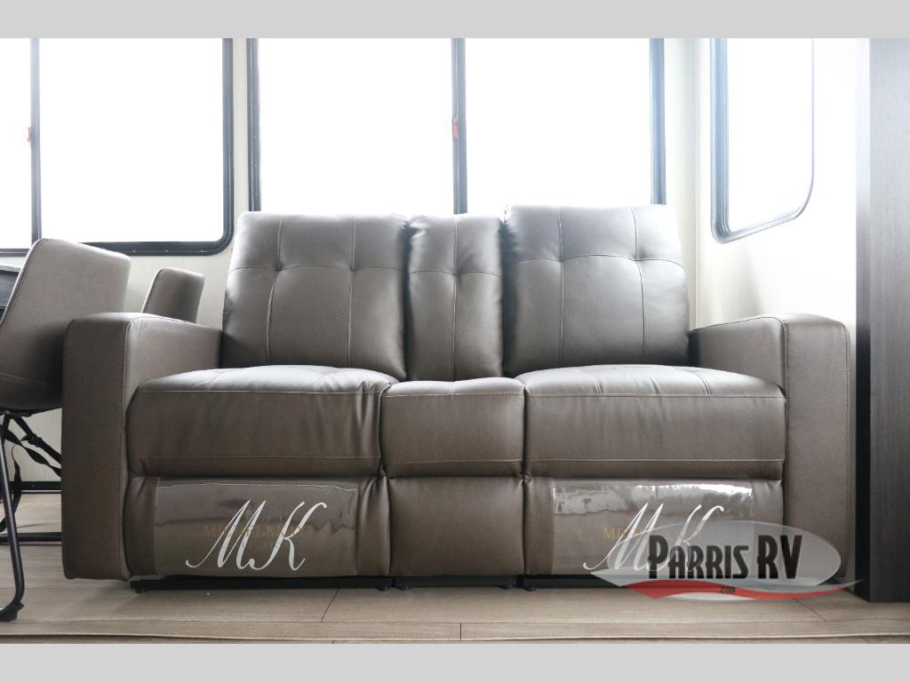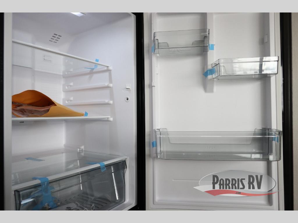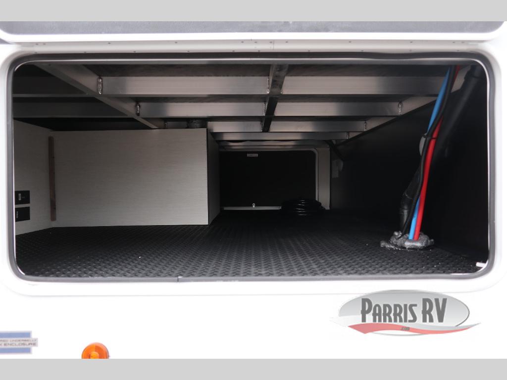 This Cherokee Arctic Wolf fifth wheel is quite extraordinary and accommodating! It has a set of opposing slides in the main living area so you can have more space to sit back on the theater seating and tri-fold sofa. You can switch on the fireplace to add some warmth to this space if it's a cool night. The free-standing table and chairs is going to be great for sitting down to eat a meal together, and there is even a storage ottoman seat for board games or throw blankets. You'll also be able to grab dessert from the large hidden pantry closet to go with your coffee. The private bedroom up front is going to provide great relaxation with its king bed slide. The spacious wardrobe includes washer/dryer prep, and there's even a second fireplace in the bedroom for the ultimate in coziness.