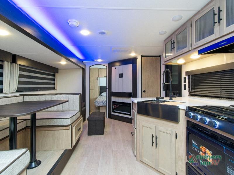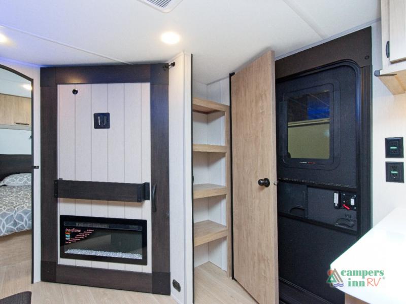 - Spacious Living Area: A large slide-out expands the space to include a U-shaped dinette, sofa, and a cozy fireplace with a hidden pantry behind it.