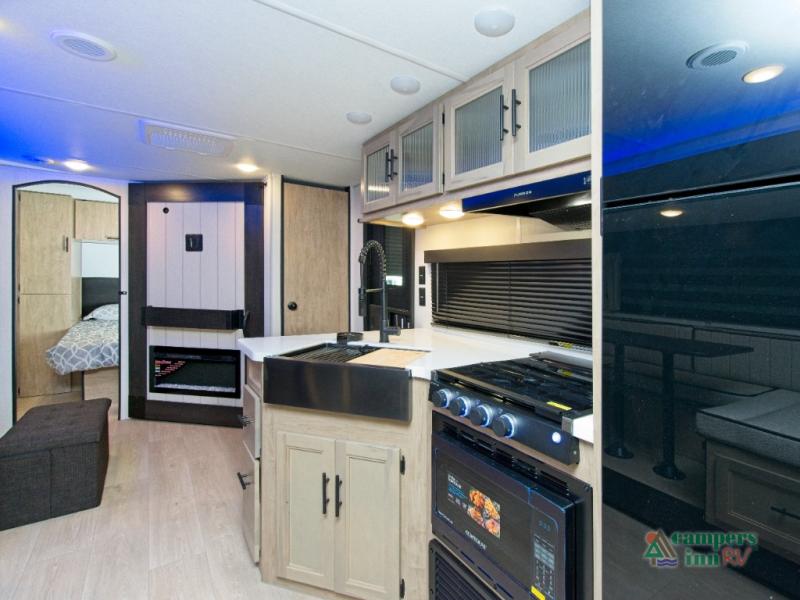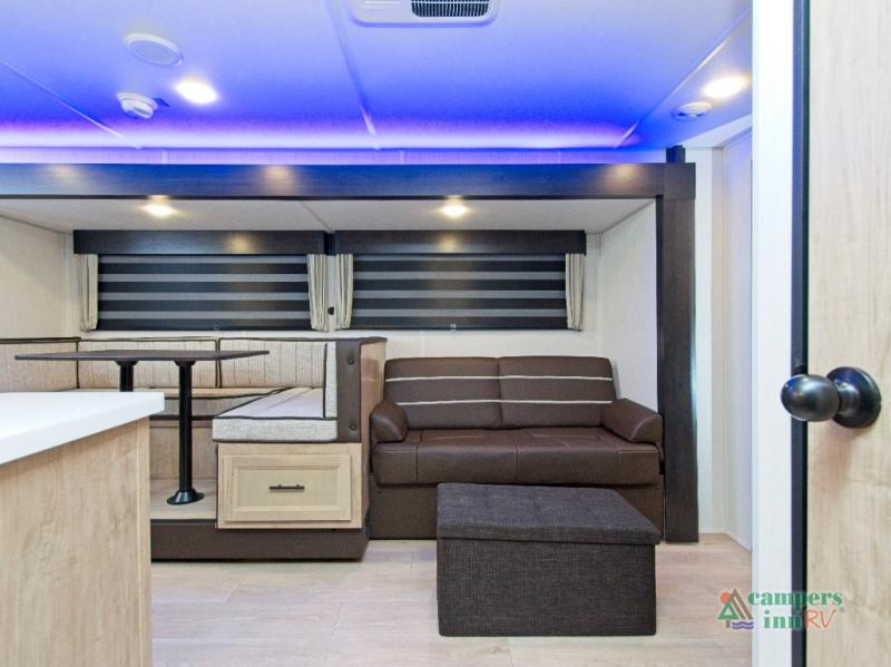 - Spacious Living Area: A large slide-out expands the space to include a U-shaped dinette, sofa, and a cozy fireplace with a hidden pantry behind it.
