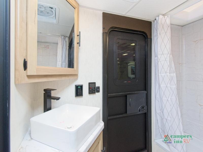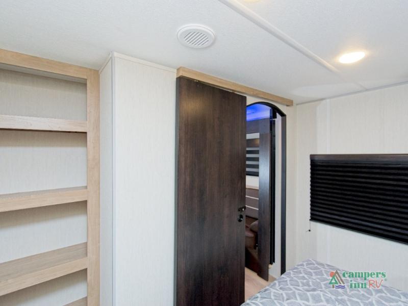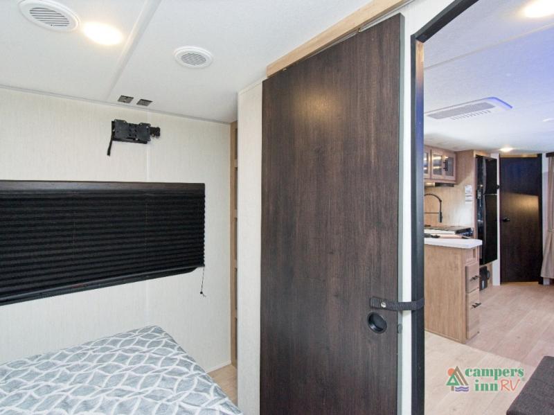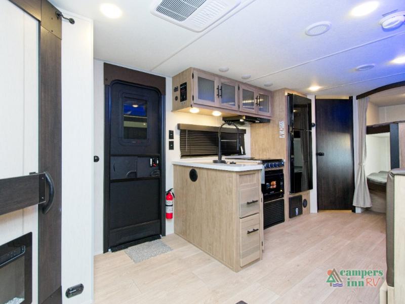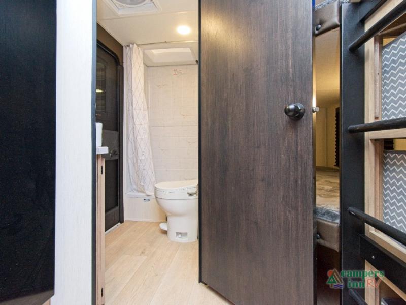 The Forest River Cherokee Grey Wolf 26KF is the perfect travel trailer for families or groups who want more sleeping space without sacrificing comfort. With double-size bunks in the rear and a private front bedroom featuring an RV king bed, everyone has a cozy place to rest. The dual entry doors make it easy to access the trailer—especially the rear bathroom, which is perfect for quick stops or nighttime use.