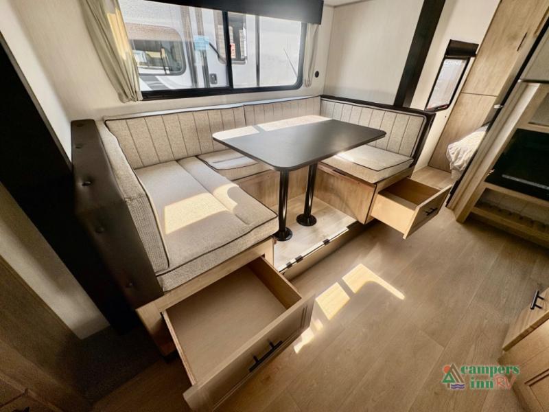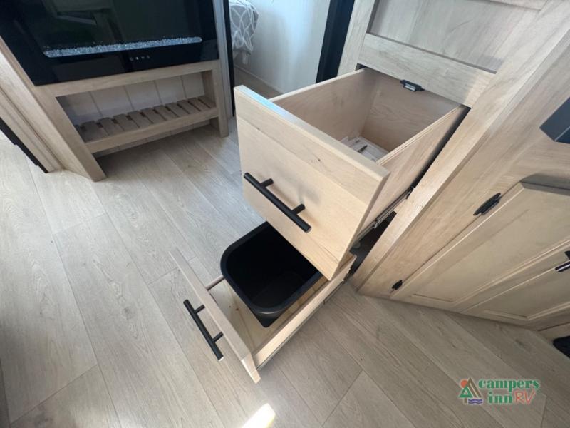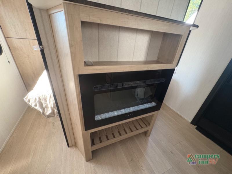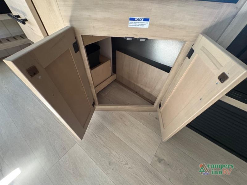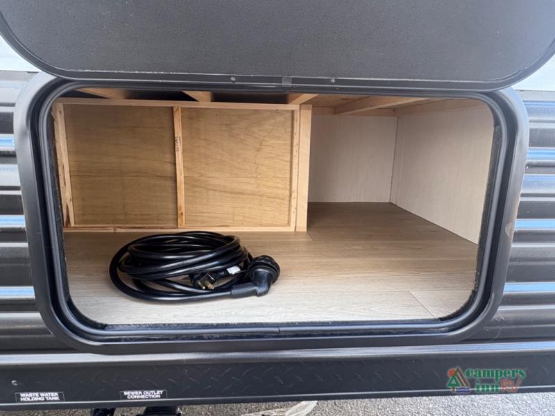 You will love the space provided in this dual entry Cherokee Grey Wolf travel trailer that has double-size bunks! The rear entry door leads right into the full bath allowing easy access from outside when you need to use the bathroom while you're enjoying the great outdoors. The large U-shaped dinette slide will not only seat everyone comfortably for a meal or a game, but since it also slides out, it opens up the interior even more to give you plenty of space for foot traffic. For all of your outdoor gear, you will find the outside storage compartments handy for stowing away your things when not in use. While the kids enjoy their bunk beds, you will enjoy a good night's rest in your RV king bed with wardrobes on either side up in the front private bedroom!
