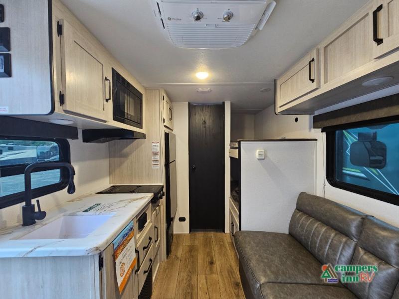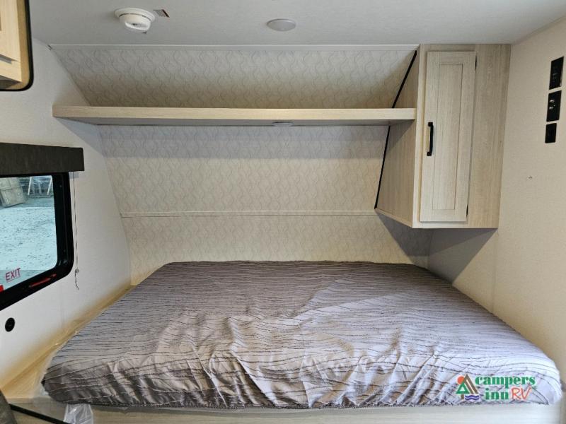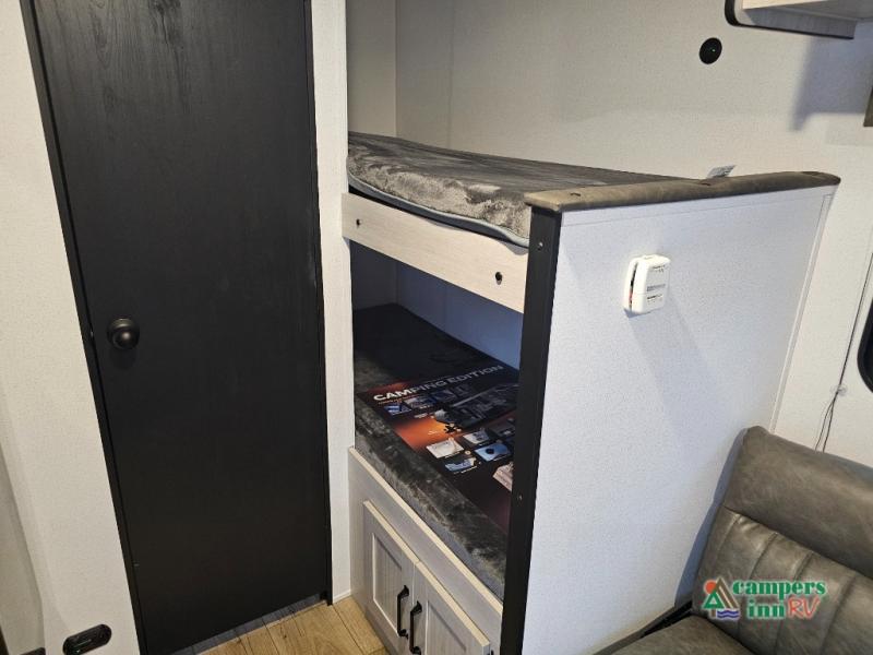 You will love the space provided in this dual entry Cherokee Grey Wolf travel trailer that has double-size bunks! The rear entry door leads right into the full bath allowing easy access from outside when you need to use the bathroom while you're enjoying the great outdoors. The large U-shaped dinette slide will not only seat everyone comfortably for a meal or a game, but since it also slides out, it opens up the interior even more to give you plenty of space for foot traffic. For all of your outdoor gear, you will find the outside storage compartments handy for stowing away your things when not in use. While the kids enjoy their bunk beds, you will enjoy a good night's rest in your RV king bed with wardrobes on either side up in the front private bedroom!